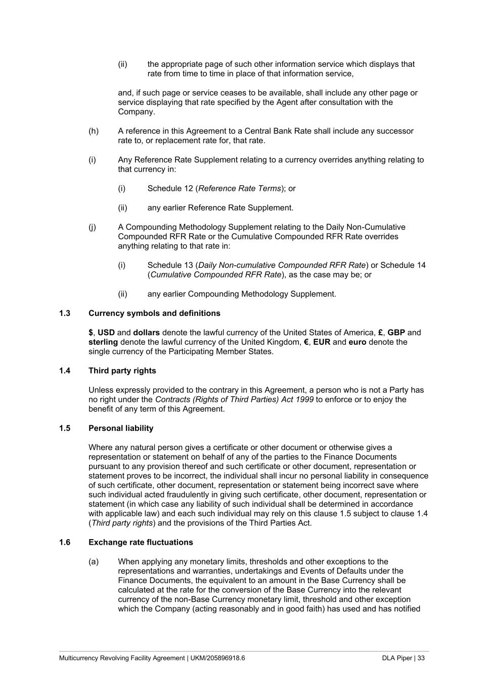 Multicurrency Revolving Facility Agreement | UKM/205896918.6 DLA Piper | 33 (ii) the appropriate page of such other information service which displays that rate from time to time in place of that information service, and, if such page or service ceases to be available, shall include any other page or service displaying that rate specified by the Agent after consultation with the Company. (h) A reference in this Agreement to a Central Bank Rate shall include any successor rate to, or replacement rate for, that rate. (i) Any Reference Rate Supplement relating to a currency overrides anything relating to that currency in: (i) Schedule 12 (Reference Rate Terms); or (ii) any earlier Reference Rate Supplement. (j) A Compounding Methodology Supplement relating to the Daily Non-Cumulative Compounded RFR Rate or the Cumulative Compounded RFR Rate overrides anything relating to that rate in: (i) Schedule 13 (Daily Non-cumulative Compounded RFR Rate) or Schedule 14 (Cumulative Compounded RFR Rate), as the case may be; or (ii) any earlier Compounding Methodology Supplement. 1.3 Currency symbols and definitions $, USD and dollars denote the lawful currency of the United States of America, £, GBP and sterling denote the lawful currency of the United Kingdom, €, EUR and euro denote the single currency of the Participating Member States. 1.4 Third party rights Unless expressly provided to the contrary in this Agreement, a person who is not a Party has no right under the Contracts (Rights of Third Parties) Act 1999 to enforce or to enjoy the benefit of any term of this Agreement. 1.5 Personal liability Where any natural person gives a certificate or other document or otherwise gives a representation or statement on behalf of any of the parties to the Finance Documents pursuant to any provision thereof and such certificate or other document, representation or statement proves to be incorrect, the individual shall incur no personal liability in consequence of such certificate, other document, representation or statement being incorrect save where such individual acted fraudulently in giving such certificate, other document, representation or statement (in which case any liability of such individual shall be determined in accordance with applicable law) and each such individual may rely on this clause 1.5 subject to clause 1.4 (Third party rights) and the provisions of the Third Parties Act. 1.6 Exchange rate fluctuations (a) When applying any monetary limits, thresholds and other exceptions to the representations and warranties, undertakings and Events of Defaults under the Finance Documents, the equivalent to an amount in the Base Currency shall be calculated at the rate for the conversion of the Base Currency into the relevant currency of the non-Base Currency monetary limit, threshold and other exception which the Company (acting reasonably and in good faith) has used and has notified