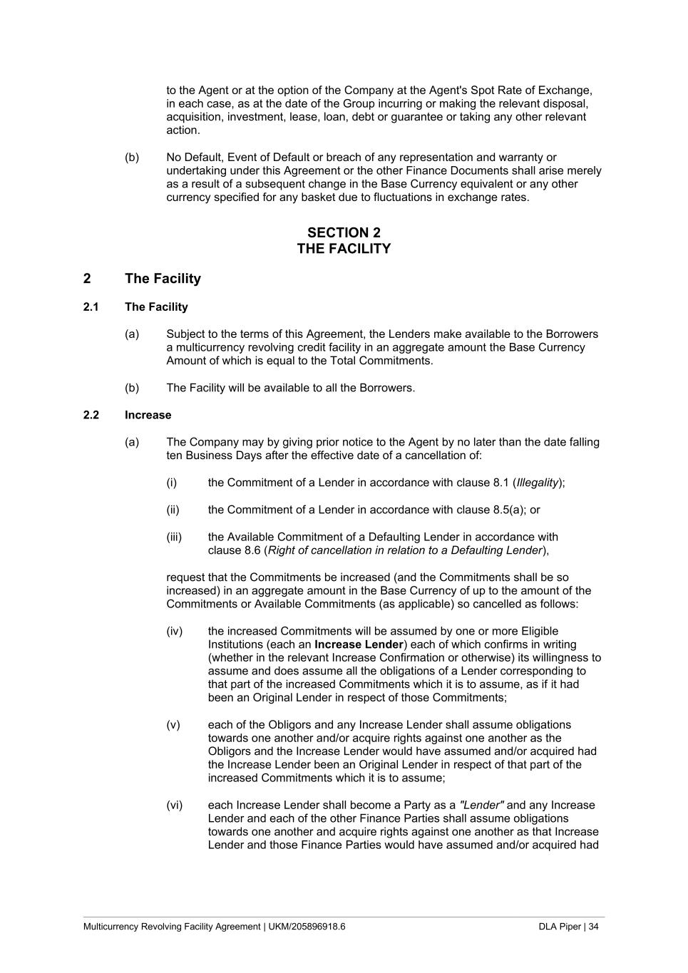 Multicurrency Revolving Facility Agreement | UKM/205896918.6 DLA Piper | 34 to the Agent or at the option of the Company at the Agent's Spot Rate of Exchange, in each case, as at the date of the Group incurring or making the relevant disposal, acquisition, investment, lease, loan, debt or guarantee or taking any other relevant action. (b) No Default, Event of Default or breach of any representation and warranty or undertaking under this Agreement or the other Finance Documents shall arise merely as a result of a subsequent change in the Base Currency equivalent or any other currency specified for any basket due to fluctuations in exchange rates. SECTION 2 THE FACILITY 2 The Facility 2.1 The Facility (a) Subject to the terms of this Agreement, the Lenders make available to the Borrowers a multicurrency revolving credit facility in an aggregate amount the Base Currency Amount of which is equal to the Total Commitments. (b) The Facility will be available to all the Borrowers. 2.2 Increase (a) The Company may by giving prior notice to the Agent by no later than the date falling ten Business Days after the effective date of a cancellation of: (i) the Commitment of a Lender in accordance with clause 8.1 (Illegality); (ii) the Commitment of a Lender in accordance with clause 8.5(a); or (iii) the Available Commitment of a Defaulting Lender in accordance with clause 8.6 (Right of cancellation in relation to a Defaulting Lender), request that the Commitments be increased (and the Commitments shall be so increased) in an aggregate amount in the Base Currency of up to the amount of the Commitments or Available Commitments (as applicable) so cancelled as follows: (iv) the increased Commitments will be assumed by one or more Eligible Institutions (each an Increase Lender) each of which confirms in writing (whether in the relevant Increase Confirmation or otherwise) its willingness to assume and does assume all the obligations of a Lender corresponding to that part of the increased Commitments which it is to assume, as if it had been an Original Lender in respect of those Commitments; (v) each of the Obligors and any Increase Lender shall assume obligations towards one another and/or acquire rights against one another as the Obligors and the Increase Lender would have assumed and/or acquired had the Increase Lender been an Original Lender in respect of that part of the increased Commitments which it is to assume; (vi) each Increase Lender shall become a Party as a "Lender" and any Increase Lender and each of the other Finance Parties shall assume obligations towards one another and acquire rights against one another as that Increase Lender and those Finance Parties would have assumed and/or acquired had