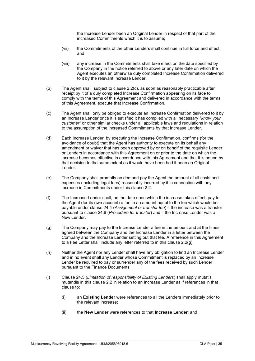 Multicurrency Revolving Facility Agreement | UKM/205896918.6 DLA Piper | 35 the Increase Lender been an Original Lender in respect of that part of the increased Commitments which it is to assume; (vii) the Commitments of the other Lenders shall continue in full force and effect; and (viii) any increase in the Commitments shall take effect on the date specified by the Company in the notice referred to above or any later date on which the Agent executes an otherwise duly completed Increase Confirmation delivered to it by the relevant Increase Lender. (b) The Agent shall, subject to clause 2.2(c), as soon as reasonably practicable after receipt by it of a duly completed Increase Confirmation appearing on its face to comply with the terms of this Agreement and delivered in accordance with the terms of this Agreement, execute that Increase Confirmation. (c) The Agent shall only be obliged to execute an Increase Confirmation delivered to it by an Increase Lender once it is satisfied it has complied with all necessary "know your customer" or other similar checks under all applicable laws and regulations in relation to the assumption of the increased Commitments by that Increase Lender. (d) Each Increase Lender, by executing the Increase Confirmation, confirms (for the avoidance of doubt) that the Agent has authority to execute on its behalf any amendment or waiver that has been approved by or on behalf of the requisite Lender or Lenders in accordance with this Agreement on or prior to the date on which the increase becomes effective in accordance with this Agreement and that it is bound by that decision to the same extent as it would have been had it been an Original Lender. (e) The Company shall promptly on demand pay the Agent the amount of all costs and expenses (including legal fees) reasonably incurred by it in connection with any increase in Commitments under this clause 2.2. (f) The Increase Lender shall, on the date upon which the increase takes effect, pay to the Agent (for its own account) a fee in an amount equal to the fee which would be payable under clause 24.4 (Assignment or transfer fee) if the increase was a transfer pursuant to clause 24.6 (Procedure for transfer) and if the Increase Lender was a New Lender. (g) The Company may pay to the Increase Lender a fee in the amount and at the times agreed between the Company and the Increase Lender in a letter between the Company and the Increase Lender setting out that fee. A reference in this Agreement to a Fee Letter shall include any letter referred to in this clause 2.2(g). (h) Neither the Agent nor any Lender shall have any obligation to find an Increase Lender and in no event shall any Lender whose Commitment is replaced by an Increase Lender be required to pay or surrender any of the fees received by such Lender pursuant to the Finance Documents. (i) Clause 24.5 (Limitation of responsibility of Existing Lenders) shall apply mutatis mutandis in this clause 2.2 in relation to an Increase Lender as if references in that clause to: (i) an Existing Lender were references to all the Lenders immediately prior to the relevant increase; (ii) the New Lender were references to that Increase Lender; and