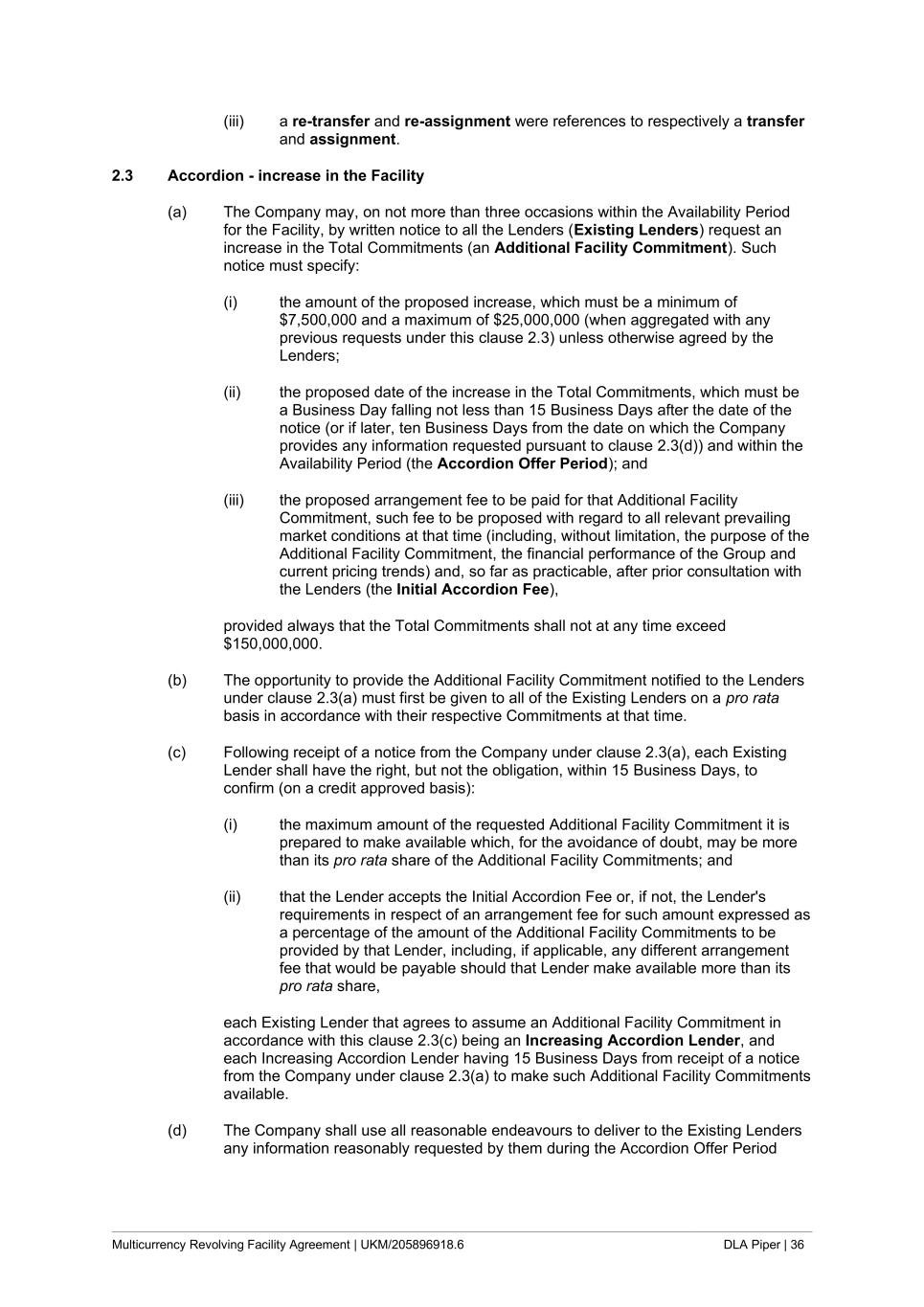 Multicurrency Revolving Facility Agreement | UKM/205896918.6 DLA Piper | 36 (iii) a re-transfer and re-assignment were references to respectively a transfer and assignment. 2.3 Accordion - increase in the Facility (a) The Company may, on not more than three occasions within the Availability Period for the Facility, by written notice to all the Lenders (Existing Lenders) request an increase in the Total Commitments (an Additional Facility Commitment). Such notice must specify: (i) the amount of the proposed increase, which must be a minimum of $7,500,000 and a maximum of $25,000,000 (when aggregated with any previous requests under this clause 2.3) unless otherwise agreed by the Lenders; (ii) the proposed date of the increase in the Total Commitments, which must be a Business Day falling not less than 15 Business Days after the date of the notice (or if later, ten Business Days from the date on which the Company provides any information requested pursuant to clause 2.3(d)) and within the Availability Period (the Accordion Offer Period); and (iii) the proposed arrangement fee to be paid for that Additional Facility Commitment, such fee to be proposed with regard to all relevant prevailing market conditions at that time (including, without limitation, the purpose of the Additional Facility Commitment, the financial performance of the Group and current pricing trends) and, so far as practicable, after prior consultation with the Lenders (the Initial Accordion Fee), provided always that the Total Commitments shall not at any time exceed $150,000,000. (b) The opportunity to provide the Additional Facility Commitment notified to the Lenders under clause 2.3(a) must first be given to all of the Existing Lenders on a pro rata basis in accordance with their respective Commitments at that time. (c) Following receipt of a notice from the Company under clause 2.3(a), each Existing Lender shall have the right, but not the obligation, within 15 Business Days, to confirm (on a credit approved basis): (i) the maximum amount of the requested Additional Facility Commitment it is prepared to make available which, for the avoidance of doubt, may be more than its pro rata share of the Additional Facility Commitments; and (ii) that the Lender accepts the Initial Accordion Fee or, if not, the Lender's requirements in respect of an arrangement fee for such amount expressed as a percentage of the amount of the Additional Facility Commitments to be provided by that Lender, including, if applicable, any different arrangement fee that would be payable should that Lender make available more than its pro rata share, each Existing Lender that agrees to assume an Additional Facility Commitment in accordance with this clause 2.3(c) being an Increasing Accordion Lender, and each Increasing Accordion Lender having 15 Business Days from receipt of a notice from the Company under clause 2.3(a) to make such Additional Facility Commitments available. (d) The Company shall use all reasonable endeavours to deliver to the Existing Lenders any information reasonably requested by them during the Accordion Offer Period