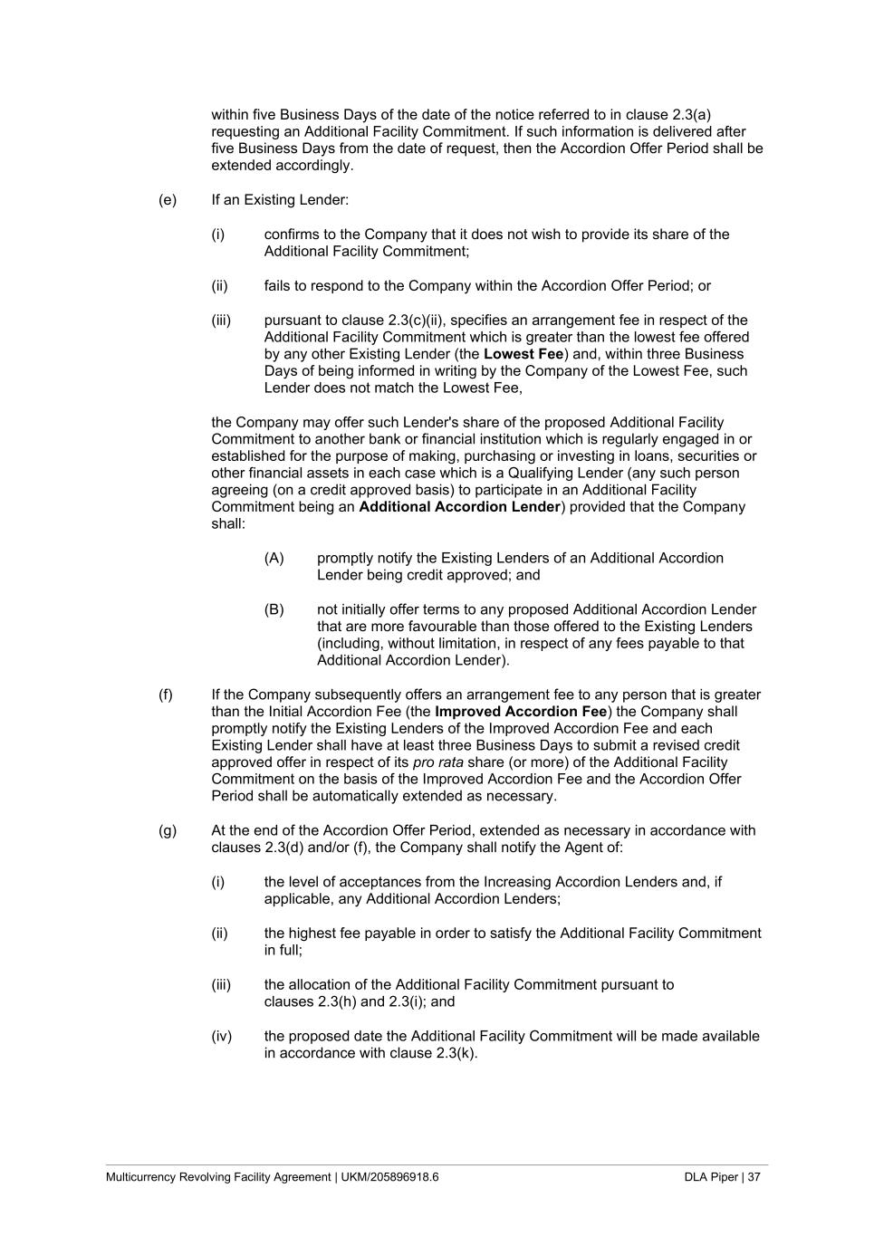 Multicurrency Revolving Facility Agreement | UKM/205896918.6 DLA Piper | 37 within five Business Days of the date of the notice referred to in clause 2.3(a) requesting an Additional Facility Commitment. If such information is delivered after five Business Days from the date of request, then the Accordion Offer Period shall be extended accordingly. (e) If an Existing Lender: (i) confirms to the Company that it does not wish to provide its share of the Additional Facility Commitment; (ii) fails to respond to the Company within the Accordion Offer Period; or (iii) pursuant to clause 2.3(c)(ii), specifies an arrangement fee in respect of the Additional Facility Commitment which is greater than the lowest fee offered by any other Existing Lender (the Lowest Fee) and, within three Business Days of being informed in writing by the Company of the Lowest Fee, such Lender does not match the Lowest Fee, the Company may offer such Lender's share of the proposed Additional Facility Commitment to another bank or financial institution which is regularly engaged in or established for the purpose of making, purchasing or investing in loans, securities or other financial assets in each case which is a Qualifying Lender (any such person agreeing (on a credit approved basis) to participate in an Additional Facility Commitment being an Additional Accordion Lender) provided that the Company shall: (A) promptly notify the Existing Lenders of an Additional Accordion Lender being credit approved; and (B) not initially offer terms to any proposed Additional Accordion Lender that are more favourable than those offered to the Existing Lenders (including, without limitation, in respect of any fees payable to that Additional Accordion Lender). (f) If the Company subsequently offers an arrangement fee to any person that is greater than the Initial Accordion Fee (the Improved Accordion Fee) the Company shall promptly notify the Existing Lenders of the Improved Accordion Fee and each Existing Lender shall have at least three Business Days to submit a revised credit approved offer in respect of its pro rata share (or more) of the Additional Facility Commitment on the basis of the Improved Accordion Fee and the Accordion Offer Period shall be automatically extended as necessary. (g) At the end of the Accordion Offer Period, extended as necessary in accordance with clauses 2.3(d) and/or (f), the Company shall notify the Agent of: (i) the level of acceptances from the Increasing Accordion Lenders and, if applicable, any Additional Accordion Lenders; (ii) the highest fee payable in order to satisfy the Additional Facility Commitment in full; (iii) the allocation of the Additional Facility Commitment pursuant to clauses 2.3(h) and 2.3(i); and (iv) the proposed date the Additional Facility Commitment will be made available in accordance with clause 2.3(k).