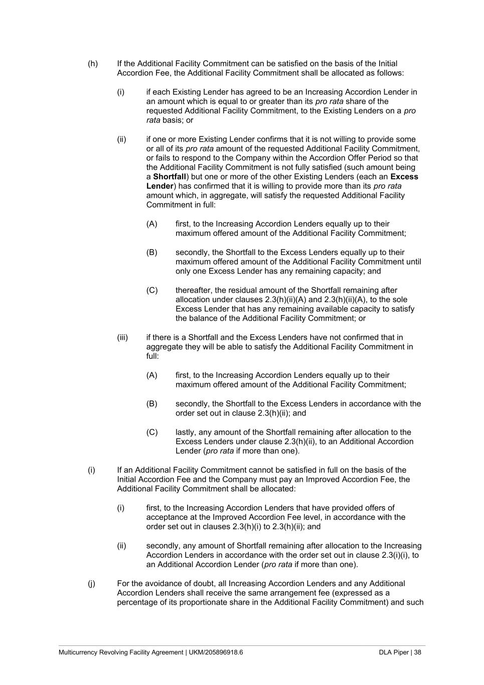Multicurrency Revolving Facility Agreement | UKM/205896918.6 DLA Piper | 38 (h) If the Additional Facility Commitment can be satisfied on the basis of the Initial Accordion Fee, the Additional Facility Commitment shall be allocated as follows: (i) if each Existing Lender has agreed to be an Increasing Accordion Lender in an amount which is equal to or greater than its pro rata share of the requested Additional Facility Commitment, to the Existing Lenders on a pro rata basis; or (ii) if one or more Existing Lender confirms that it is not willing to provide some or all of its pro rata amount of the requested Additional Facility Commitment, or fails to respond to the Company within the Accordion Offer Period so that the Additional Facility Commitment is not fully satisfied (such amount being a Shortfall) but one or more of the other Existing Lenders (each an Excess Lender) has confirmed that it is willing to provide more than its pro rata amount which, in aggregate, will satisfy the requested Additional Facility Commitment in full: (A) first, to the Increasing Accordion Lenders equally up to their maximum offered amount of the Additional Facility Commitment; (B) secondly, the Shortfall to the Excess Lenders equally up to their maximum offered amount of the Additional Facility Commitment until only one Excess Lender has any remaining capacity; and (C) thereafter, the residual amount of the Shortfall remaining after allocation under clauses 2.3(h)(ii)(A) and 2.3(h)(ii)(A), to the sole Excess Lender that has any remaining available capacity to satisfy the balance of the Additional Facility Commitment; or (iii) if there is a Shortfall and the Excess Lenders have not confirmed that in aggregate they will be able to satisfy the Additional Facility Commitment in full: (A) first, to the Increasing Accordion Lenders equally up to their maximum offered amount of the Additional Facility Commitment; (B) secondly, the Shortfall to the Excess Lenders in accordance with the order set out in clause 2.3(h)(ii); and (C) lastly, any amount of the Shortfall remaining after allocation to the Excess Lenders under clause 2.3(h)(ii), to an Additional Accordion Lender (pro rata if more than one). (i) If an Additional Facility Commitment cannot be satisfied in full on the basis of the Initial Accordion Fee and the Company must pay an Improved Accordion Fee, the Additional Facility Commitment shall be allocated: (i) first, to the Increasing Accordion Lenders that have provided offers of acceptance at the Improved Accordion Fee level, in accordance with the order set out in clauses 2.3(h)(i) to 2.3(h)(ii); and (ii) secondly, any amount of Shortfall remaining after allocation to the Increasing Accordion Lenders in accordance with the order set out in clause 2.3(i)(i), to an Additional Accordion Lender (pro rata if more than one). (j) For the avoidance of doubt, all Increasing Accordion Lenders and any Additional Accordion Lenders shall receive the same arrangement fee (expressed as a percentage of its proportionate share in the Additional Facility Commitment) and such