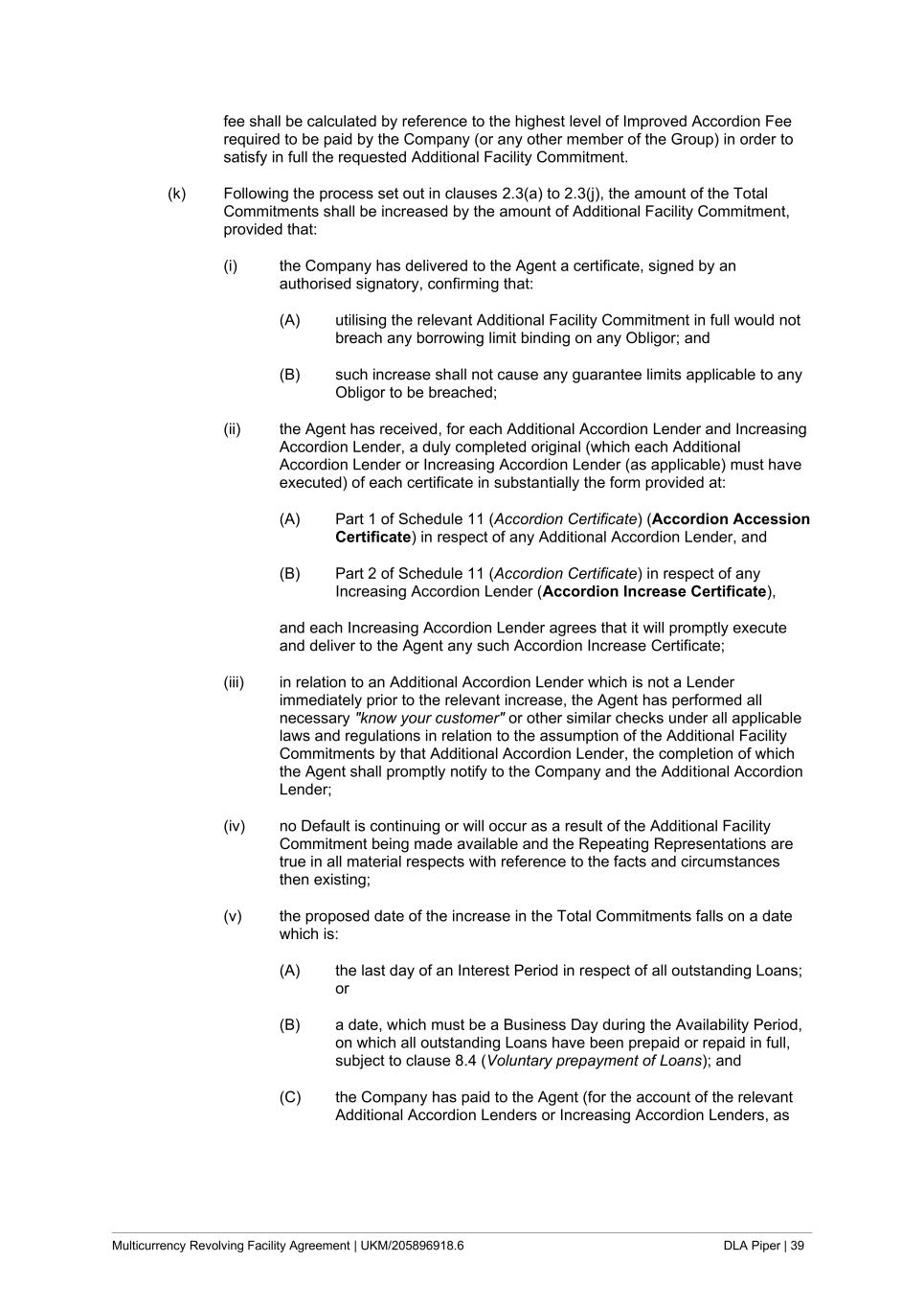 Multicurrency Revolving Facility Agreement | UKM/205896918.6 DLA Piper | 39 fee shall be calculated by reference to the highest level of Improved Accordion Fee required to be paid by the Company (or any other member of the Group) in order to satisfy in full the requested Additional Facility Commitment. (k) Following the process set out in clauses 2.3(a) to 2.3(j), the amount of the Total Commitments shall be increased by the amount of Additional Facility Commitment, provided that: (i) the Company has delivered to the Agent a certificate, signed by an authorised signatory, confirming that: (A) utilising the relevant Additional Facility Commitment in full would not breach any borrowing limit binding on any Obligor; and (B) such increase shall not cause any guarantee limits applicable to any Obligor to be breached; (ii) the Agent has received, for each Additional Accordion Lender and Increasing Accordion Lender, a duly completed original (which each Additional Accordion Lender or Increasing Accordion Lender (as applicable) must have executed) of each certificate in substantially the form provided at: (A) Part 1 of Schedule 11 (Accordion Certificate) (Accordion Accession Certificate) in respect of any Additional Accordion Lender, and (B) Part 2 of Schedule 11 (Accordion Certificate) in respect of any Increasing Accordion Lender (Accordion Increase Certificate), and each Increasing Accordion Lender agrees that it will promptly execute and deliver to the Agent any such Accordion Increase Certificate; (iii) in relation to an Additional Accordion Lender which is not a Lender immediately prior to the relevant increase, the Agent has performed all necessary "know your customer" or other similar checks under all applicable laws and regulations in relation to the assumption of the Additional Facility Commitments by that Additional Accordion Lender, the completion of which the Agent shall promptly notify to the Company and the Additional Accordion Lender; (iv) no Default is continuing or will occur as a result of the Additional Facility Commitment being made available and the Repeating Representations are true in all material respects with reference to the facts and circumstances then existing; (v) the proposed date of the increase in the Total Commitments falls on a date which is: (A) the last day of an Interest Period in respect of all outstanding Loans; or (B) a date, which must be a Business Day during the Availability Period, on which all outstanding Loans have been prepaid or repaid in full, subject to clause 8.4 (Voluntary prepayment of Loans); and (C) the Company has paid to the Agent (for the account of the relevant Additional Accordion Lenders or Increasing Accordion Lenders, as