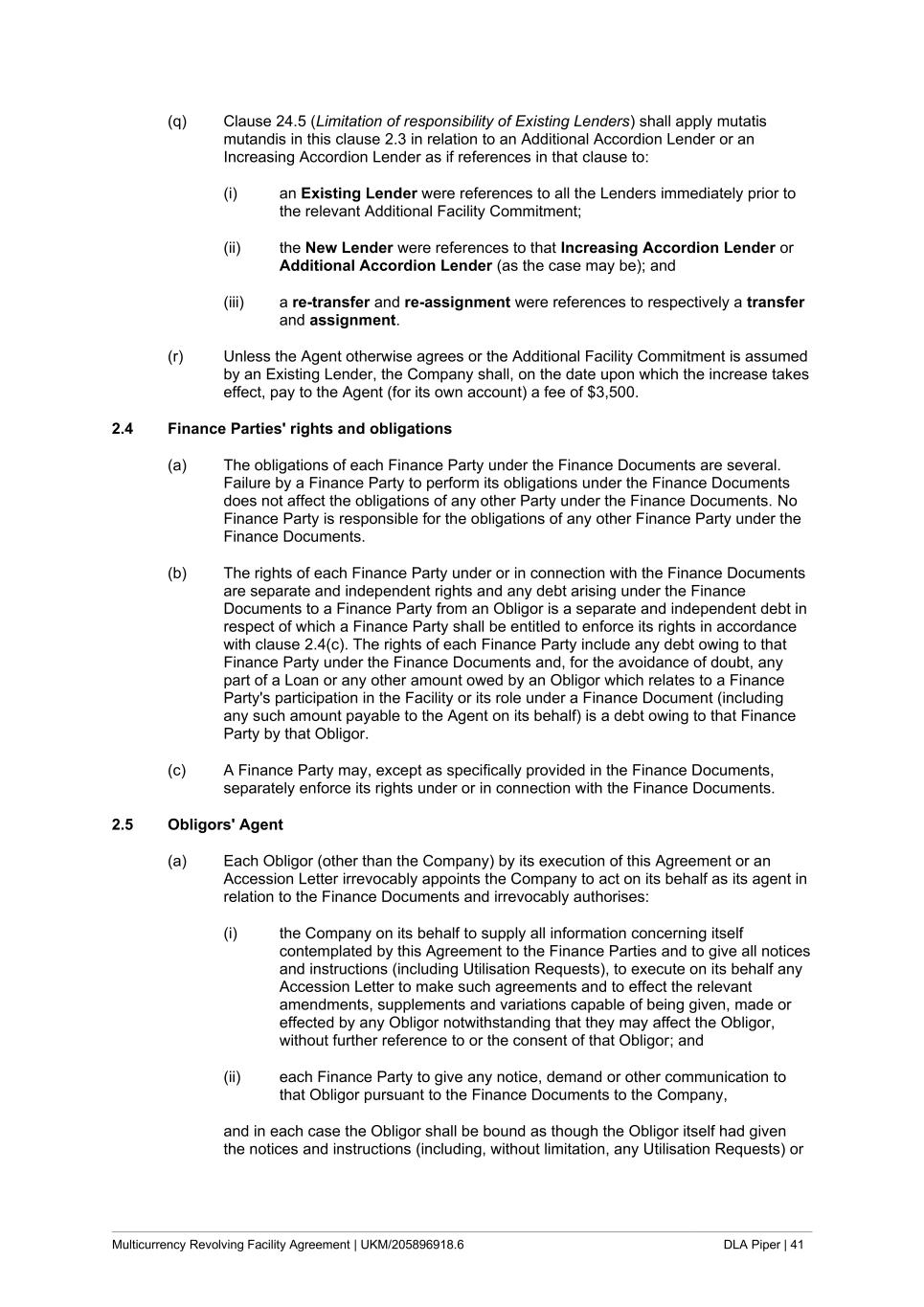 Multicurrency Revolving Facility Agreement | UKM/205896918.6 DLA Piper | 41 (q) Clause 24.5 (Limitation of responsibility of Existing Lenders) shall apply mutatis mutandis in this clause 2.3 in relation to an Additional Accordion Lender or an Increasing Accordion Lender as if references in that clause to: (i) an Existing Lender were references to all the Lenders immediately prior to the relevant Additional Facility Commitment; (ii) the New Lender were references to that Increasing Accordion Lender or Additional Accordion Lender (as the case may be); and (iii) a re-transfer and re-assignment were references to respectively a transfer and assignment. (r) Unless the Agent otherwise agrees or the Additional Facility Commitment is assumed by an Existing Lender, the Company shall, on the date upon which the increase takes effect, pay to the Agent (for its own account) a fee of $3,500. 2.4 Finance Parties' rights and obligations (a) The obligations of each Finance Party under the Finance Documents are several. Failure by a Finance Party to perform its obligations under the Finance Documents does not affect the obligations of any other Party under the Finance Documents. No Finance Party is responsible for the obligations of any other Finance Party under the Finance Documents. (b) The rights of each Finance Party under or in connection with the Finance Documents are separate and independent rights and any debt arising under the Finance Documents to a Finance Party from an Obligor is a separate and independent debt in respect of which a Finance Party shall be entitled to enforce its rights in accordance with clause 2.4(c). The rights of each Finance Party include any debt owing to that Finance Party under the Finance Documents and, for the avoidance of doubt, any part of a Loan or any other amount owed by an Obligor which relates to a Finance Party's participation in the Facility or its role under a Finance Document (including any such amount payable to the Agent on its behalf) is a debt owing to that Finance Party by that Obligor. (c) A Finance Party may, except as specifically provided in the Finance Documents, separately enforce its rights under or in connection with the Finance Documents. 2.5 Obligors' Agent (a) Each Obligor (other than the Company) by its execution of this Agreement or an Accession Letter irrevocably appoints the Company to act on its behalf as its agent in relation to the Finance Documents and irrevocably authorises: (i) the Company on its behalf to supply all information concerning itself contemplated by this Agreement to the Finance Parties and to give all notices and instructions (including Utilisation Requests), to execute on its behalf any Accession Letter to make such agreements and to effect the relevant amendments, supplements and variations capable of being given, made or effected by any Obligor notwithstanding that they may affect the Obligor, without further reference to or the consent of that Obligor; and (ii) each Finance Party to give any notice, demand or other communication to that Obligor pursuant to the Finance Documents to the Company, and in each case the Obligor shall be bound as though the Obligor itself had given the notices and instructions (including, without limitation, any Utilisation Requests) or
