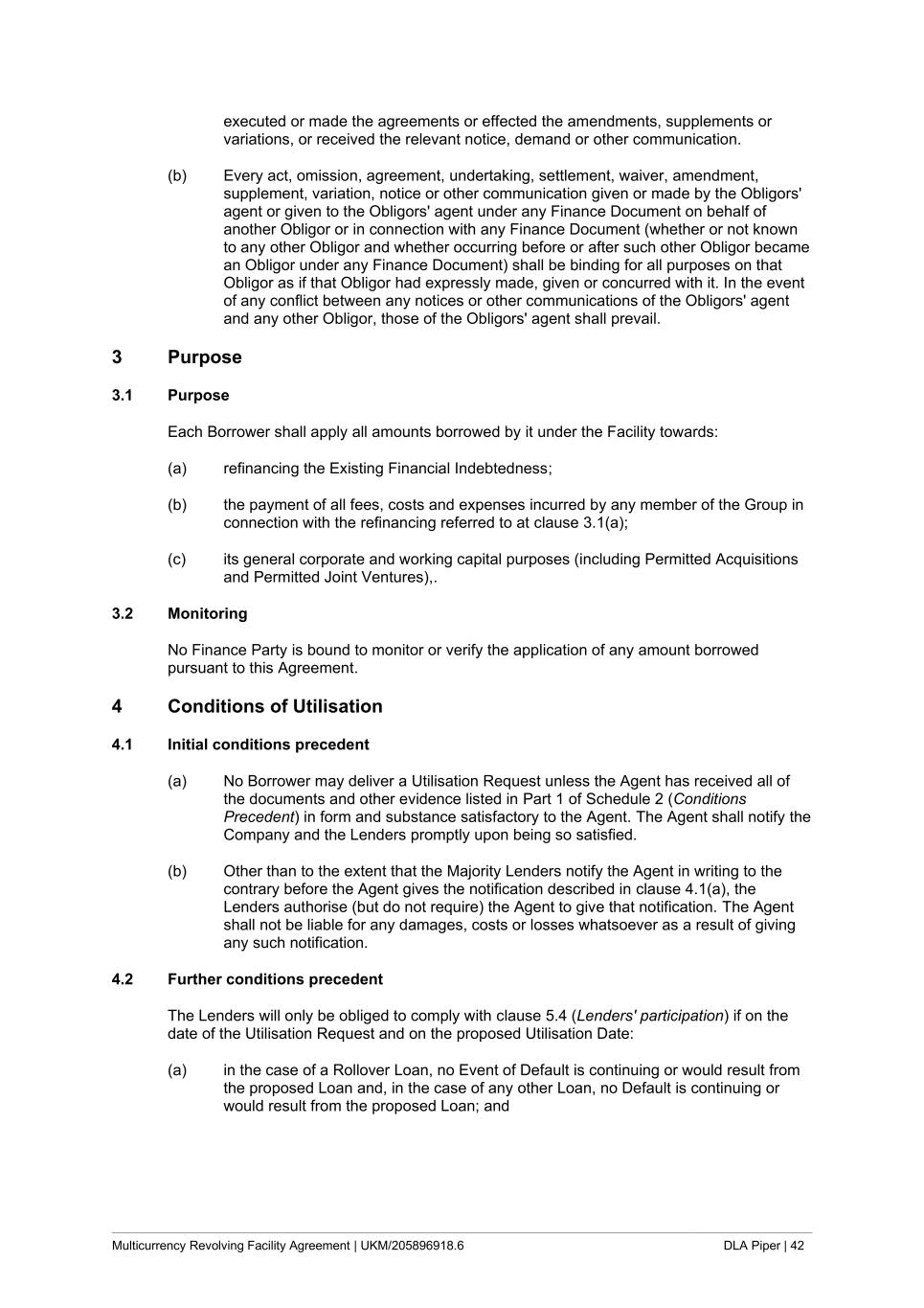 Multicurrency Revolving Facility Agreement | UKM/205896918.6 DLA Piper | 42 executed or made the agreements or effected the amendments, supplements or variations, or received the relevant notice, demand or other communication. (b) Every act, omission, agreement, undertaking, settlement, waiver, amendment, supplement, variation, notice or other communication given or made by the Obligors' agent or given to the Obligors' agent under any Finance Document on behalf of another Obligor or in connection with any Finance Document (whether or not known to any other Obligor and whether occurring before or after such other Obligor became an Obligor under any Finance Document) shall be binding for all purposes on that Obligor as if that Obligor had expressly made, given or concurred with it. In the event of any conflict between any notices or other communications of the Obligors' agent and any other Obligor, those of the Obligors' agent shall prevail. 3 Purpose 3.1 Purpose Each Borrower shall apply all amounts borrowed by it under the Facility towards: (a) refinancing the Existing Financial Indebtedness; (b) the payment of all fees, costs and expenses incurred by any member of the Group in connection with the refinancing referred to at clause 3.1(a); (c) its general corporate and working capital purposes (including Permitted Acquisitions and Permitted Joint Ventures),. 3.2 Monitoring No Finance Party is bound to monitor or verify the application of any amount borrowed pursuant to this Agreement. 4 Conditions of Utilisation 4.1 Initial conditions precedent (a) No Borrower may deliver a Utilisation Request unless the Agent has received all of the documents and other evidence listed in Part 1 of Schedule 2 (Conditions Precedent) in form and substance satisfactory to the Agent. The Agent shall notify the Company and the Lenders promptly upon being so satisfied. (b) Other than to the extent that the Majority Lenders notify the Agent in writing to the contrary before the Agent gives the notification described in clause 4.1(a), the Lenders authorise (but do not require) the Agent to give that notification. The Agent shall not be liable for any damages, costs or losses whatsoever as a result of giving any such notification. 4.2 Further conditions precedent The Lenders will only be obliged to comply with clause 5.4 (Lenders' participation) if on the date of the Utilisation Request and on the proposed Utilisation Date: (a) in the case of a Rollover Loan, no Event of Default is continuing or would result from the proposed Loan and, in the case of any other Loan, no Default is continuing or would result from the proposed Loan; and