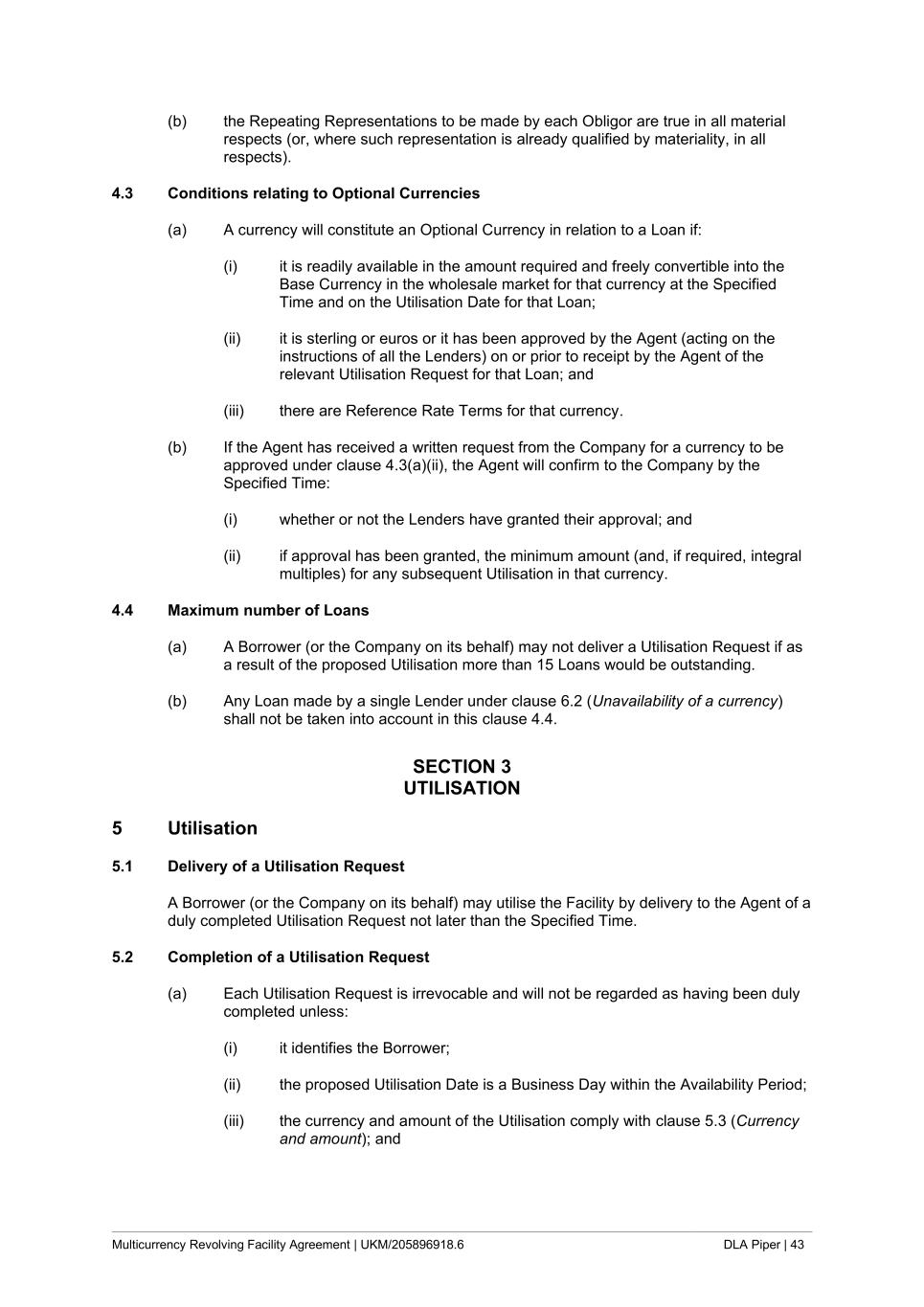 Multicurrency Revolving Facility Agreement | UKM/205896918.6 DLA Piper | 43 (b) the Repeating Representations to be made by each Obligor are true in all material respects (or, where such representation is already qualified by materiality, in all respects). 4.3 Conditions relating to Optional Currencies (a) A currency will constitute an Optional Currency in relation to a Loan if: (i) it is readily available in the amount required and freely convertible into the Base Currency in the wholesale market for that currency at the Specified Time and on the Utilisation Date for that Loan; (ii) it is sterling or euros or it has been approved by the Agent (acting on the instructions of all the Lenders) on or prior to receipt by the Agent of the relevant Utilisation Request for that Loan; and (iii) there are Reference Rate Terms for that currency. (b) If the Agent has received a written request from the Company for a currency to be approved under clause 4.3(a)(ii), the Agent will confirm to the Company by the Specified Time: (i) whether or not the Lenders have granted their approval; and (ii) if approval has been granted, the minimum amount (and, if required, integral multiples) for any subsequent Utilisation in that currency. 4.4 Maximum number of Loans (a) A Borrower (or the Company on its behalf) may not deliver a Utilisation Request if as a result of the proposed Utilisation more than 15 Loans would be outstanding. (b) Any Loan made by a single Lender under clause 6.2 (Unavailability of a currency) shall not be taken into account in this clause 4.4. SECTION 3 UTILISATION 5 Utilisation 5.1 Delivery of a Utilisation Request A Borrower (or the Company on its behalf) may utilise the Facility by delivery to the Agent of a duly completed Utilisation Request not later than the Specified Time. 5.2 Completion of a Utilisation Request (a) Each Utilisation Request is irrevocable and will not be regarded as having been duly completed unless: (i) it identifies the Borrower; (ii) the proposed Utilisation Date is a Business Day within the Availability Period; (iii) the currency and amount of the Utilisation comply with clause 5.3 (Currency and amount); and