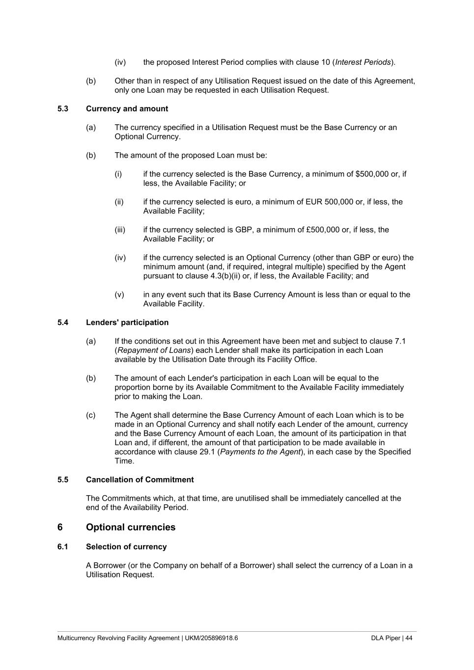 Multicurrency Revolving Facility Agreement | UKM/205896918.6 DLA Piper | 44 (iv) the proposed Interest Period complies with clause 10 (Interest Periods). (b) Other than in respect of any Utilisation Request issued on the date of this Agreement, only one Loan may be requested in each Utilisation Request. 5.3 Currency and amount (a) The currency specified in a Utilisation Request must be the Base Currency or an Optional Currency. (b) The amount of the proposed Loan must be: (i) if the currency selected is the Base Currency, a minimum of $500,000 or, if less, the Available Facility; or (ii) if the currency selected is euro, a minimum of EUR 500,000 or, if less, the Available Facility; (iii) if the currency selected is GBP, a minimum of £500,000 or, if less, the Available Facility; or (iv) if the currency selected is an Optional Currency (other than GBP or euro) the minimum amount (and, if required, integral multiple) specified by the Agent pursuant to clause 4.3(b)(ii) or, if less, the Available Facility; and (v) in any event such that its Base Currency Amount is less than or equal to the Available Facility. 5.4 Lenders' participation (a) If the conditions set out in this Agreement have been met and subject to clause 7.1 (Repayment of Loans) each Lender shall make its participation in each Loan available by the Utilisation Date through its Facility Office. (b) The amount of each Lender's participation in each Loan will be equal to the proportion borne by its Available Commitment to the Available Facility immediately prior to making the Loan. (c) The Agent shall determine the Base Currency Amount of each Loan which is to be made in an Optional Currency and shall notify each Lender of the amount, currency and the Base Currency Amount of each Loan, the amount of its participation in that Loan and, if different, the amount of that participation to be made available in accordance with clause 29.1 (Payments to the Agent), in each case by the Specified Time. 5.5 Cancellation of Commitment The Commitments which, at that time, are unutilised shall be immediately cancelled at the end of the Availability Period. 6 Optional currencies 6.1 Selection of currency A Borrower (or the Company on behalf of a Borrower) shall select the currency of a Loan in a Utilisation Request.