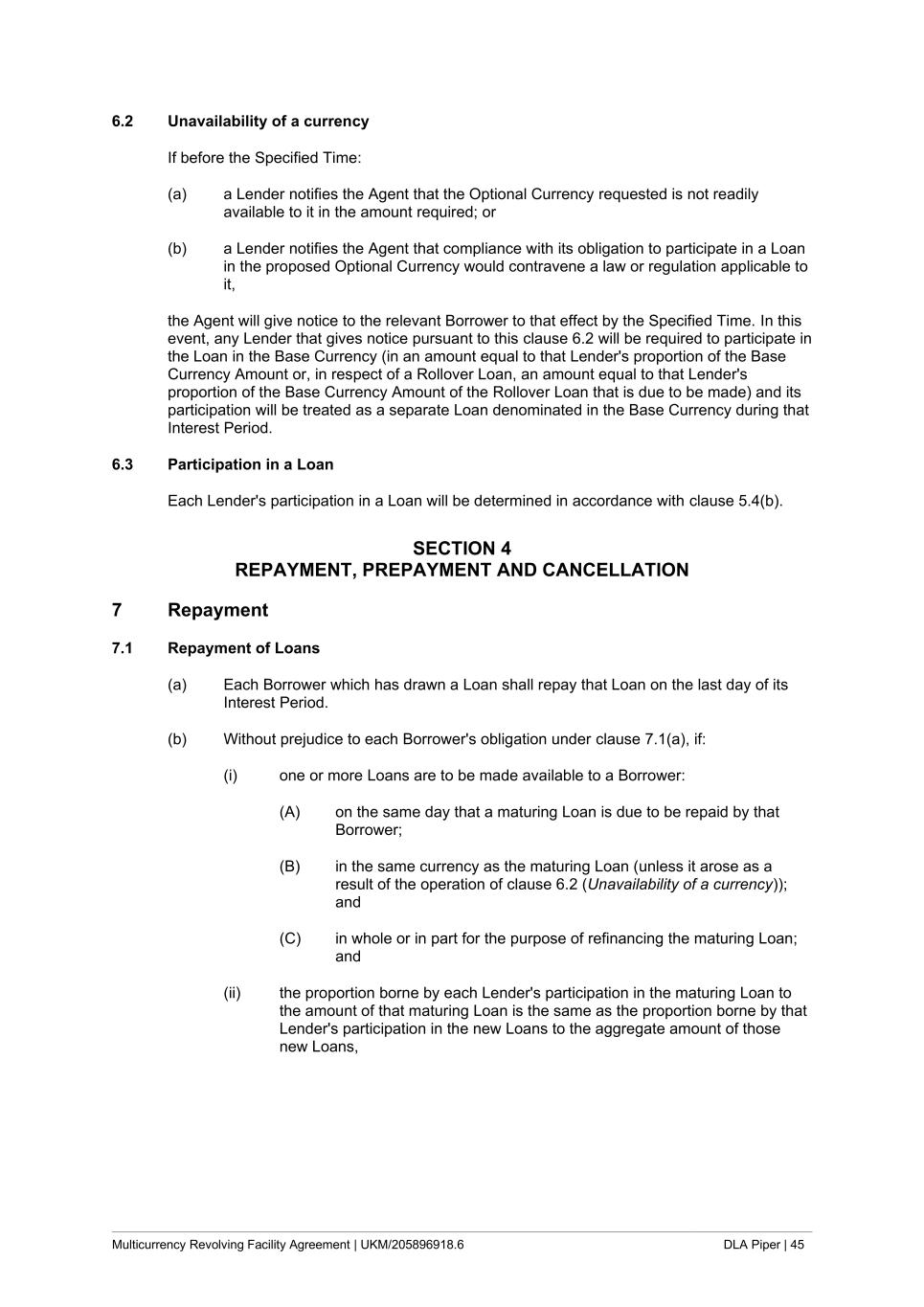 Multicurrency Revolving Facility Agreement | UKM/205896918.6 DLA Piper | 45 6.2 Unavailability of a currency If before the Specified Time: (a) a Lender notifies the Agent that the Optional Currency requested is not readily available to it in the amount required; or (b) a Lender notifies the Agent that compliance with its obligation to participate in a Loan in the proposed Optional Currency would contravene a law or regulation applicable to it, the Agent will give notice to the relevant Borrower to that effect by the Specified Time. In this event, any Lender that gives notice pursuant to this clause 6.2 will be required to participate in the Loan in the Base Currency (in an amount equal to that Lender's proportion of the Base Currency Amount or, in respect of a Rollover Loan, an amount equal to that Lender's proportion of the Base Currency Amount of the Rollover Loan that is due to be made) and its participation will be treated as a separate Loan denominated in the Base Currency during that Interest Period. 6.3 Participation in a Loan Each Lender's participation in a Loan will be determined in accordance with clause 5.4(b). SECTION 4 REPAYMENT, PREPAYMENT AND CANCELLATION 7 Repayment 7.1 Repayment of Loans (a) Each Borrower which has drawn a Loan shall repay that Loan on the last day of its Interest Period. (b) Without prejudice to each Borrower's obligation under clause 7.1(a), if: (i) one or more Loans are to be made available to a Borrower: (A) on the same day that a maturing Loan is due to be repaid by that Borrower; (B) in the same currency as the maturing Loan (unless it arose as a result of the operation of clause 6.2 (Unavailability of a currency)); and (C) in whole or in part for the purpose of refinancing the maturing Loan; and (ii) the proportion borne by each Lender's participation in the maturing Loan to the amount of that maturing Loan is the same as the proportion borne by that Lender's participation in the new Loans to the aggregate amount of those new Loans,