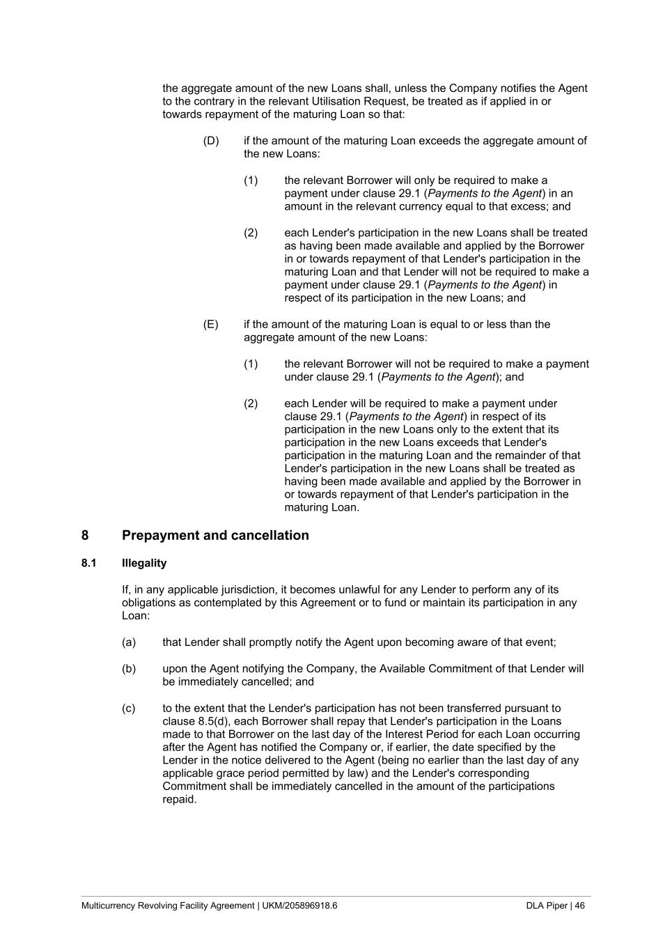 Multicurrency Revolving Facility Agreement | UKM/205896918.6 DLA Piper | 46 the aggregate amount of the new Loans shall, unless the Company notifies the Agent to the contrary in the relevant Utilisation Request, be treated as if applied in or towards repayment of the maturing Loan so that: (D) if the amount of the maturing Loan exceeds the aggregate amount of the new Loans: (1) the relevant Borrower will only be required to make a payment under clause 29.1 (Payments to the Agent) in an amount in the relevant currency equal to that excess; and (2) each Lender's participation in the new Loans shall be treated as having been made available and applied by the Borrower in or towards repayment of that Lender's participation in the maturing Loan and that Lender will not be required to make a payment under clause 29.1 (Payments to the Agent) in respect of its participation in the new Loans; and (E) if the amount of the maturing Loan is equal to or less than the aggregate amount of the new Loans: (1) the relevant Borrower will not be required to make a payment under clause 29.1 (Payments to the Agent); and (2) each Lender will be required to make a payment under clause 29.1 (Payments to the Agent) in respect of its participation in the new Loans only to the extent that its participation in the new Loans exceeds that Lender's participation in the maturing Loan and the remainder of that Lender's participation in the new Loans shall be treated as having been made available and applied by the Borrower in or towards repayment of that Lender's participation in the maturing Loan. 8 Prepayment and cancellation 8.1 Illegality If, in any applicable jurisdiction, it becomes unlawful for any Lender to perform any of its obligations as contemplated by this Agreement or to fund or maintain its participation in any Loan: (a) that Lender shall promptly notify the Agent upon becoming aware of that event; (b) upon the Agent notifying the Company, the Available Commitment of that Lender will be immediately cancelled; and (c) to the extent that the Lender's participation has not been transferred pursuant to clause 8.5(d), each Borrower shall repay that Lender's participation in the Loans made to that Borrower on the last day of the Interest Period for each Loan occurring after the Agent has notified the Company or, if earlier, the date specified by the Lender in the notice delivered to the Agent (being no earlier than the last day of any applicable grace period permitted by law) and the Lender's corresponding Commitment shall be immediately cancelled in the amount of the participations repaid.