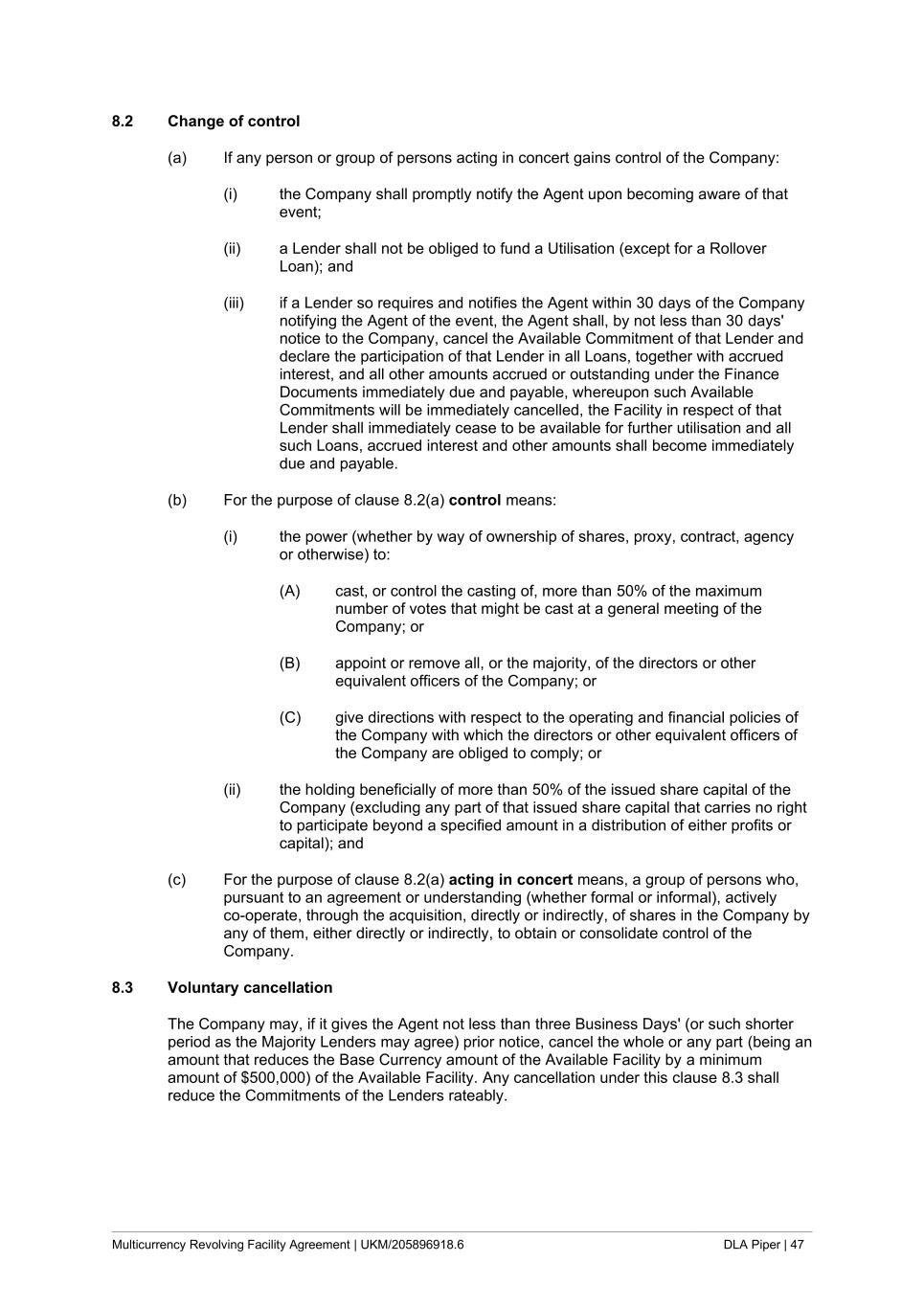 Multicurrency Revolving Facility Agreement | UKM/205896918.6 DLA Piper | 47 8.2 Change of control (a) If any person or group of persons acting in concert gains control of the Company: (i) the Company shall promptly notify the Agent upon becoming aware of that event; (ii) a Lender shall not be obliged to fund a Utilisation (except for a Rollover Loan); and (iii) if a Lender so requires and notifies the Agent within 30 days of the Company notifying the Agent of the event, the Agent shall, by not less than 30 days' notice to the Company, cancel the Available Commitment of that Lender and declare the participation of that Lender in all Loans, together with accrued interest, and all other amounts accrued or outstanding under the Finance Documents immediately due and payable, whereupon such Available Commitments will be immediately cancelled, the Facility in respect of that Lender shall immediately cease to be available for further utilisation and all such Loans, accrued interest and other amounts shall become immediately due and payable. (b) For the purpose of clause 8.2(a) control means: (i) the power (whether by way of ownership of shares, proxy, contract, agency or otherwise) to: (A) cast, or control the casting of, more than 50% of the maximum number of votes that might be cast at a general meeting of the Company; or (B) appoint or remove all, or the majority, of the directors or other equivalent officers of the Company; or (C) give directions with respect to the operating and financial policies of the Company with which the directors or other equivalent officers of the Company are obliged to comply; or (ii) the holding beneficially of more than 50% of the issued share capital of the Company (excluding any part of that issued share capital that carries no right to participate beyond a specified amount in a distribution of either profits or capital); and (c) For the purpose of clause 8.2(a) acting in concert means, a group of persons who, pursuant to an agreement or understanding (whether formal or informal), actively co-operate, through the acquisition, directly or indirectly, of shares in the Company by any of them, either directly or indirectly, to obtain or consolidate control of the Company. 8.3 Voluntary cancellation The Company may, if it gives the Agent not less than three Business Days' (or such shorter period as the Majority Lenders may agree) prior notice, cancel the whole or any part (being an amount that reduces the Base Currency amount of the Available Facility by a minimum amount of $500,000) of the Available Facility. Any cancellation under this clause 8.3 shall reduce the Commitments of the Lenders rateably.