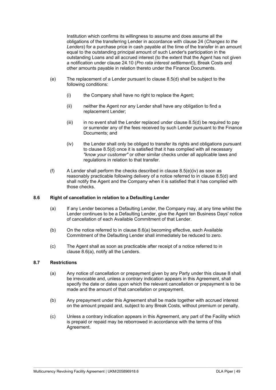 Multicurrency Revolving Facility Agreement | UKM/205896918.6 DLA Piper | 49 Institution which confirms its willingness to assume and does assume all the obligations of the transferring Lender in accordance with clause 24 (Changes to the Lenders) for a purchase price in cash payable at the time of the transfer in an amount equal to the outstanding principal amount of such Lender's participation in the outstanding Loans and all accrued interest (to the extent that the Agent has not given a notification under clause 24.10 (Pro rata interest settlement)), Break Costs and other amounts payable in relation thereto under the Finance Documents. (e) The replacement of a Lender pursuant to clause 8.5(d) shall be subject to the following conditions: (i) the Company shall have no right to replace the Agent; (ii) neither the Agent nor any Lender shall have any obligation to find a replacement Lender; (iii) in no event shall the Lender replaced under clause 8.5(d) be required to pay or surrender any of the fees received by such Lender pursuant to the Finance Documents; and (iv) the Lender shall only be obliged to transfer its rights and obligations pursuant to clause 8.5(d) once it is satisfied that it has complied with all necessary "know your customer" or other similar checks under all applicable laws and regulations in relation to that transfer. (f) A Lender shall perform the checks described in clause 8.5(e)(iv) as soon as reasonably practicable following delivery of a notice referred to in clause 8.5(d) and shall notify the Agent and the Company when it is satisfied that it has complied with those checks. 8.6 Right of cancellation in relation to a Defaulting Lender (a) If any Lender becomes a Defaulting Lender, the Company may, at any time whilst the Lender continues to be a Defaulting Lender, give the Agent ten Business Days' notice of cancellation of each Available Commitment of that Lender. (b) On the notice referred to in clause 8.6(a) becoming effective, each Available Commitment of the Defaulting Lender shall immediately be reduced to zero. (c) The Agent shall as soon as practicable after receipt of a notice referred to in clause 8.6(a), notify all the Lenders. 8.7 Restrictions (a) Any notice of cancellation or prepayment given by any Party under this clause 8 shall be irrevocable and, unless a contrary indication appears in this Agreement, shall specify the date or dates upon which the relevant cancellation or prepayment is to be made and the amount of that cancellation or prepayment. (b) Any prepayment under this Agreement shall be made together with accrued interest on the amount prepaid and, subject to any Break Costs, without premium or penalty. (c) Unless a contrary indication appears in this Agreement, any part of the Facility which is prepaid or repaid may be reborrowed in accordance with the terms of this Agreement.