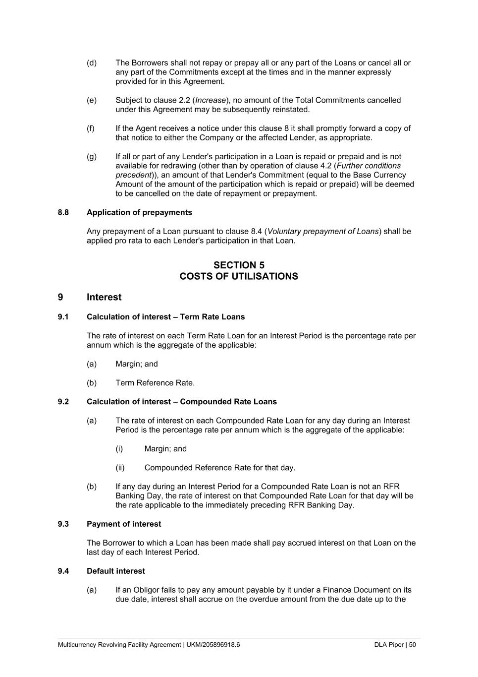 Multicurrency Revolving Facility Agreement | UKM/205896918.6 DLA Piper | 50 (d) The Borrowers shall not repay or prepay all or any part of the Loans or cancel all or any part of the Commitments except at the times and in the manner expressly provided for in this Agreement. (e) Subject to clause 2.2 (Increase), no amount of the Total Commitments cancelled under this Agreement may be subsequently reinstated. (f) If the Agent receives a notice under this clause 8 it shall promptly forward a copy of that notice to either the Company or the affected Lender, as appropriate. (g) If all or part of any Lender's participation in a Loan is repaid or prepaid and is not available for redrawing (other than by operation of clause 4.2 (Further conditions precedent)), an amount of that Lender's Commitment (equal to the Base Currency Amount of the amount of the participation which is repaid or prepaid) will be deemed to be cancelled on the date of repayment or prepayment. 8.8 Application of prepayments Any prepayment of a Loan pursuant to clause 8.4 (Voluntary prepayment of Loans) shall be applied pro rata to each Lender's participation in that Loan. SECTION 5 COSTS OF UTILISATIONS 9 Interest 9.1 Calculation of interest – Term Rate Loans The rate of interest on each Term Rate Loan for an Interest Period is the percentage rate per annum which is the aggregate of the applicable: (a) Margin; and (b) Term Reference Rate. 9.2 Calculation of interest – Compounded Rate Loans (a) The rate of interest on each Compounded Rate Loan for any day during an Interest Period is the percentage rate per annum which is the aggregate of the applicable: (i) Margin; and (ii) Compounded Reference Rate for that day. (b) If any day during an Interest Period for a Compounded Rate Loan is not an RFR Banking Day, the rate of interest on that Compounded Rate Loan for that day will be the rate applicable to the immediately preceding RFR Banking Day. 9.3 Payment of interest The Borrower to which a Loan has been made shall pay accrued interest on that Loan on the last day of each Interest Period. 9.4 Default interest (a) If an Obligor fails to pay any amount payable by it under a Finance Document on its due date, interest shall accrue on the overdue amount from the due date up to the