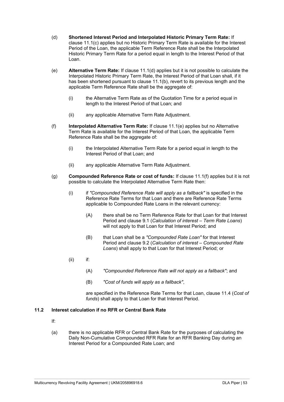 Multicurrency Revolving Facility Agreement | UKM/205896918.6 DLA Piper | 53 (d) Shortened Interest Period and Interpolated Historic Primary Term Rate: If clause 11.1(c) applies but no Historic Primary Term Rate is available for the Interest Period of the Loan, the applicable Term Reference Rate shall be the Interpolated Historic Primary Term Rate for a period equal in length to the Interest Period of that Loan. (e) Alternative Term Rate: If clause 11.1(d) applies but it is not possible to calculate the Interpolated Historic Primary Term Rate, the Interest Period of that Loan shall, if it has been shortened pursuant to clause 11.1(b), revert to its previous length and the applicable Term Reference Rate shall be the aggregate of: (i) the Alternative Term Rate as of the Quotation Time for a period equal in length to the Interest Period of that Loan; and (ii) any applicable Alternative Term Rate Adjustment. (f) Interpolated Alternative Term Rate: If clause 11.1(e) applies but no Alternative Term Rate is available for the Interest Period of that Loan, the applicable Term Reference Rate shall be the aggregate of: (i) the Interpolated Alternative Term Rate for a period equal in length to the Interest Period of that Loan; and (ii) any applicable Alternative Term Rate Adjustment. (g) Compounded Reference Rate or cost of funds: If clause 11.1(f) applies but it is not possible to calculate the Interpolated Alternative Term Rate then: (i) if "Compounded Reference Rate will apply as a fallback" is specified in the Reference Rate Terms for that Loan and there are Reference Rate Terms applicable to Compounded Rate Loans in the relevant currency: (A) there shall be no Term Reference Rate for that Loan for that Interest Period and clause 9.1 (Calculation of interest – Term Rate Loans) will not apply to that Loan for that Interest Period; and (B) that Loan shall be a "Compounded Rate Loan" for that Interest Period and clause 9.2 (Calculation of interest – Compounded Rate Loans) shall apply to that Loan for that Interest Period; or (ii) if: (A) "Compounded Reference Rate will not apply as a fallback"; and (B) "Cost of funds will apply as a fallback", are specified in the Reference Rate Terms for that Loan, clause 11.4 (Cost of funds) shall apply to that Loan for that Interest Period. 11.2 Interest calculation if no RFR or Central Bank Rate If: (a) there is no applicable RFR or Central Bank Rate for the purposes of calculating the Daily Non-Cumulative Compounded RFR Rate for an RFR Banking Day during an Interest Period for a Compounded Rate Loan; and