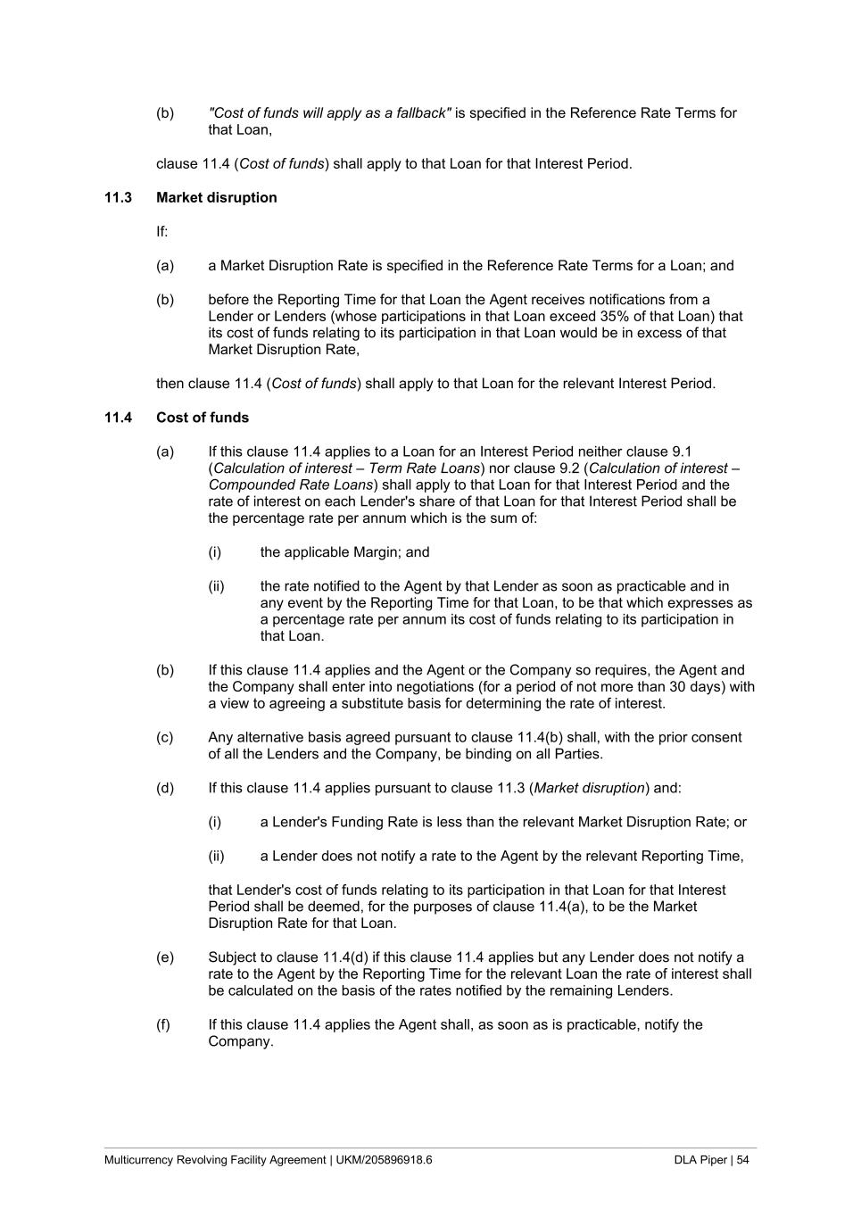 Multicurrency Revolving Facility Agreement | UKM/205896918.6 DLA Piper | 54 (b) "Cost of funds will apply as a fallback" is specified in the Reference Rate Terms for that Loan, clause 11.4 (Cost of funds) shall apply to that Loan for that Interest Period. 11.3 Market disruption If: (a) a Market Disruption Rate is specified in the Reference Rate Terms for a Loan; and (b) before the Reporting Time for that Loan the Agent receives notifications from a Lender or Lenders (whose participations in that Loan exceed 35% of that Loan) that its cost of funds relating to its participation in that Loan would be in excess of that Market Disruption Rate, then clause 11.4 (Cost of funds) shall apply to that Loan for the relevant Interest Period. 11.4 Cost of funds (a) If this clause 11.4 applies to a Loan for an Interest Period neither clause 9.1 (Calculation of interest – Term Rate Loans) nor clause 9.2 (Calculation of interest – Compounded Rate Loans) shall apply to that Loan for that Interest Period and the rate of interest on each Lender's share of that Loan for that Interest Period shall be the percentage rate per annum which is the sum of: (i) the applicable Margin; and (ii) the rate notified to the Agent by that Lender as soon as practicable and in any event by the Reporting Time for that Loan, to be that which expresses as a percentage rate per annum its cost of funds relating to its participation in that Loan. (b) If this clause 11.4 applies and the Agent or the Company so requires, the Agent and the Company shall enter into negotiations (for a period of not more than 30 days) with a view to agreeing a substitute basis for determining the rate of interest. (c) Any alternative basis agreed pursuant to clause 11.4(b) shall, with the prior consent of all the Lenders and the Company, be binding on all Parties. (d) If this clause 11.4 applies pursuant to clause 11.3 (Market disruption) and: (i) a Lender's Funding Rate is less than the relevant Market Disruption Rate; or (ii) a Lender does not notify a rate to the Agent by the relevant Reporting Time, that Lender's cost of funds relating to its participation in that Loan for that Interest Period shall be deemed, for the purposes of clause 11.4(a), to be the Market Disruption Rate for that Loan. (e) Subject to clause 11.4(d) if this clause 11.4 applies but any Lender does not notify a rate to the Agent by the Reporting Time for the relevant Loan the rate of interest shall be calculated on the basis of the rates notified by the remaining Lenders. (f) If this clause 11.4 applies the Agent shall, as soon as is practicable, notify the Company.
