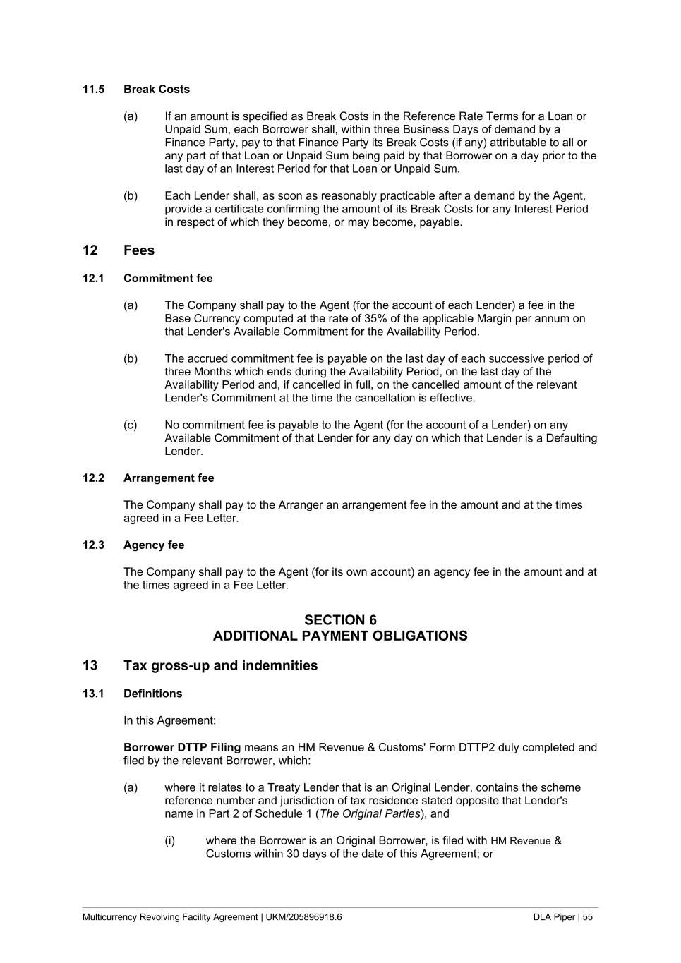 Multicurrency Revolving Facility Agreement | UKM/205896918.6 DLA Piper | 55 11.5 Break Costs (a) If an amount is specified as Break Costs in the Reference Rate Terms for a Loan or Unpaid Sum, each Borrower shall, within three Business Days of demand by a Finance Party, pay to that Finance Party its Break Costs (if any) attributable to all or any part of that Loan or Unpaid Sum being paid by that Borrower on a day prior to the last day of an Interest Period for that Loan or Unpaid Sum. (b) Each Lender shall, as soon as reasonably practicable after a demand by the Agent, provide a certificate confirming the amount of its Break Costs for any Interest Period in respect of which they become, or may become, payable. 12 Fees 12.1 Commitment fee (a) The Company shall pay to the Agent (for the account of each Lender) a fee in the Base Currency computed at the rate of 35% of the applicable Margin per annum on that Lender's Available Commitment for the Availability Period. (b) The accrued commitment fee is payable on the last day of each successive period of three Months which ends during the Availability Period, on the last day of the Availability Period and, if cancelled in full, on the cancelled amount of the relevant Lender's Commitment at the time the cancellation is effective. (c) No commitment fee is payable to the Agent (for the account of a Lender) on any Available Commitment of that Lender for any day on which that Lender is a Defaulting Lender. 12.2 Arrangement fee The Company shall pay to the Arranger an arrangement fee in the amount and at the times agreed in a Fee Letter. 12.3 Agency fee The Company shall pay to the Agent (for its own account) an agency fee in the amount and at the times agreed in a Fee Letter. SECTION 6 ADDITIONAL PAYMENT OBLIGATIONS 13 Tax gross-up and indemnities 13.1 Definitions In this Agreement: Borrower DTTP Filing means an HM Revenue & Customs' Form DTTP2 duly completed and filed by the relevant Borrower, which: (a) where it relates to a Treaty Lender that is an Original Lender, contains the scheme reference number and jurisdiction of tax residence stated opposite that Lender's name in Part 2 of Schedule 1 (The Original Parties), and (i) where the Borrower is an Original Borrower, is filed with HM Revenue & Customs within 30 days of the date of this Agreement; or