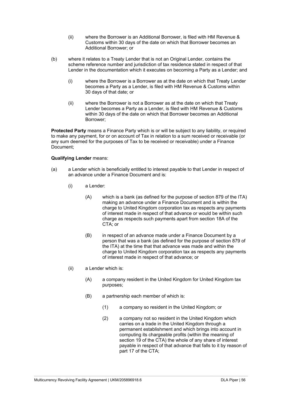 Multicurrency Revolving Facility Agreement | UKM/205896918.6 DLA Piper | 56 (ii) where the Borrower is an Additional Borrower, is filed with HM Revenue & Customs within 30 days of the date on which that Borrower becomes an Additional Borrower; or (b) where it relates to a Treaty Lender that is not an Original Lender, contains the scheme reference number and jurisdiction of tax residence stated in respect of that Lender in the documentation which it executes on becoming a Party as a Lender; and (i) where the Borrower is a Borrower as at the date on which that Treaty Lender becomes a Party as a Lender, is filed with HM Revenue & Customs within 30 days of that date; or (ii) where the Borrower is not a Borrower as at the date on which that Treaty Lender becomes a Party as a Lender, is filed with HM Revenue & Customs within 30 days of the date on which that Borrower becomes an Additional Borrower; Protected Party means a Finance Party which is or will be subject to any liability, or required to make any payment, for or on account of Tax in relation to a sum received or receivable (or any sum deemed for the purposes of Tax to be received or receivable) under a Finance Document; Qualifying Lender means: (a) a Lender which is beneficially entitled to interest payable to that Lender in respect of an advance under a Finance Document and is: (i) a Lender: (A) which is a bank (as defined for the purpose of section 879 of the ITA) making an advance under a Finance Document and is within the charge to United Kingdom corporation tax as respects any payments of interest made in respect of that advance or would be within such charge as respects such payments apart from section 18A of the CTA; or (B) in respect of an advance made under a Finance Document by a person that was a bank (as defined for the purpose of section 879 of the ITA) at the time that that advance was made and within the charge to United Kingdom corporation tax as respects any payments of interest made in respect of that advance; or (ii) a Lender which is: (A) a company resident in the United Kingdom for United Kingdom tax purposes; (B) a partnership each member of which is: (1) a company so resident in the United Kingdom; or (2) a company not so resident in the United Kingdom which carries on a trade in the United Kingdom through a permanent establishment and which brings into account in computing its chargeable profits (within the meaning of section 19 of the CTA) the whole of any share of interest payable in respect of that advance that falls to it by reason of part 17 of the CTA;