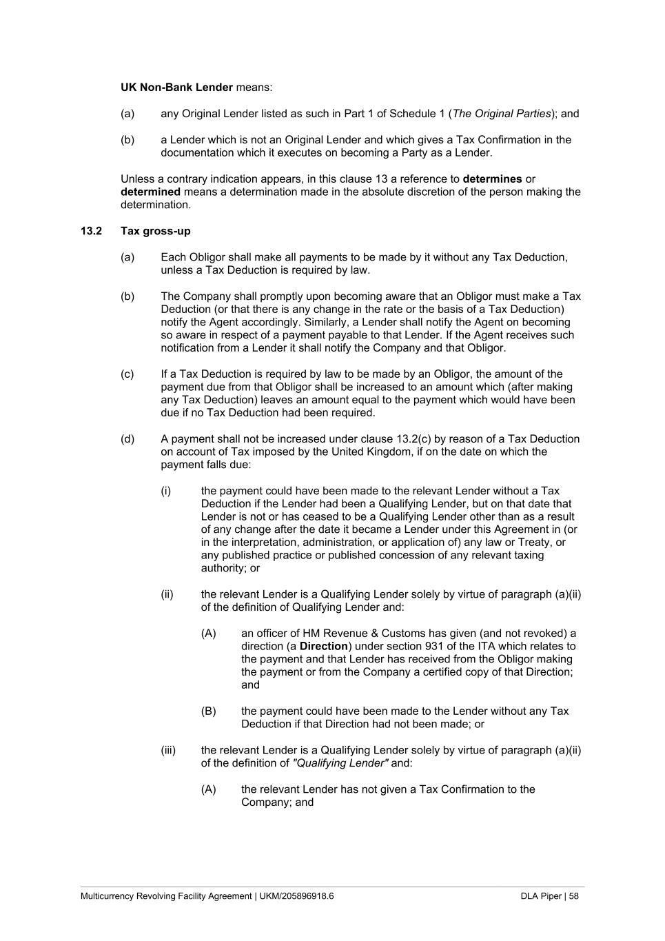 Multicurrency Revolving Facility Agreement | UKM/205896918.6 DLA Piper | 58 UK Non-Bank Lender means: (a) any Original Lender listed as such in Part 1 of Schedule 1 (The Original Parties); and (b) a Lender which is not an Original Lender and which gives a Tax Confirmation in the documentation which it executes on becoming a Party as a Lender. Unless a contrary indication appears, in this clause 13 a reference to determines or determined means a determination made in the absolute discretion of the person making the determination. 13.2 Tax gross-up (a) Each Obligor shall make all payments to be made by it without any Tax Deduction, unless a Tax Deduction is required by law. (b) The Company shall promptly upon becoming aware that an Obligor must make a Tax Deduction (or that there is any change in the rate or the basis of a Tax Deduction) notify the Agent accordingly. Similarly, a Lender shall notify the Agent on becoming so aware in respect of a payment payable to that Lender. If the Agent receives such notification from a Lender it shall notify the Company and that Obligor. (c) If a Tax Deduction is required by law to be made by an Obligor, the amount of the payment due from that Obligor shall be increased to an amount which (after making any Tax Deduction) leaves an amount equal to the payment which would have been due if no Tax Deduction had been required. (d) A payment shall not be increased under clause 13.2(c) by reason of a Tax Deduction on account of Tax imposed by the United Kingdom, if on the date on which the payment falls due: (i) the payment could have been made to the relevant Lender without a Tax Deduction if the Lender had been a Qualifying Lender, but on that date that Lender is not or has ceased to be a Qualifying Lender other than as a result of any change after the date it became a Lender under this Agreement in (or in the interpretation, administration, or application of) any law or Treaty, or any published practice or published concession of any relevant taxing authority; or (ii) the relevant Lender is a Qualifying Lender solely by virtue of paragraph (a)(ii) of the definition of Qualifying Lender and: (A) an officer of HM Revenue & Customs has given (and not revoked) a direction (a Direction) under section 931 of the ITA which relates to the payment and that Lender has received from the Obligor making the payment or from the Company a certified copy of that Direction; and (B) the payment could have been made to the Lender without any Tax Deduction if that Direction had not been made; or (iii) the relevant Lender is a Qualifying Lender solely by virtue of paragraph (a)(ii) of the definition of "Qualifying Lender" and: (A) the relevant Lender has not given a Tax Confirmation to the Company; and