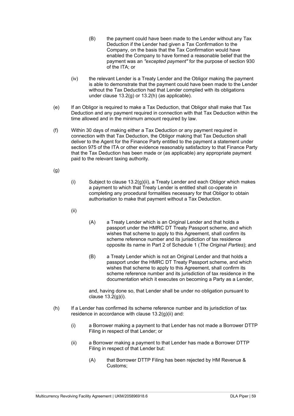 Multicurrency Revolving Facility Agreement | UKM/205896918.6 DLA Piper | 59 (B) the payment could have been made to the Lender without any Tax Deduction if the Lender had given a Tax Confirmation to the Company, on the basis that the Tax Confirmation would have enabled the Company to have formed a reasonable belief that the payment was an "excepted payment" for the purpose of section 930 of the ITA; or (iv) the relevant Lender is a Treaty Lender and the Obligor making the payment is able to demonstrate that the payment could have been made to the Lender without the Tax Deduction had that Lender complied with its obligations under clause 13.2(g) or 13.2(h) (as applicable). (e) If an Obligor is required to make a Tax Deduction, that Obligor shall make that Tax Deduction and any payment required in connection with that Tax Deduction within the time allowed and in the minimum amount required by law. (f) Within 30 days of making either a Tax Deduction or any payment required in connection with that Tax Deduction, the Obligor making that Tax Deduction shall deliver to the Agent for the Finance Party entitled to the payment a statement under section 975 of the ITA or other evidence reasonably satisfactory to that Finance Party that the Tax Deduction has been made or (as applicable) any appropriate payment paid to the relevant taxing authority. (g) (i) Subject to clause 13.2(g)(ii), a Treaty Lender and each Obligor which makes a payment to which that Treaty Lender is entitled shall co-operate in completing any procedural formalities necessary for that Obligor to obtain authorisation to make that payment without a Tax Deduction. (ii) (A) a Treaty Lender which is an Original Lender and that holds a passport under the HMRC DT Treaty Passport scheme, and which wishes that scheme to apply to this Agreement, shall confirm its scheme reference number and its jurisdiction of tax residence opposite its name in Part 2 of Schedule 1 (The Original Parties); and (B) a Treaty Lender which is not an Original Lender and that holds a passport under the HMRC DT Treaty Passport scheme, and which wishes that scheme to apply to this Agreement, shall confirm its scheme reference number and its jurisdiction of tax residence in the documentation which it executes on becoming a Party as a Lender, and, having done so, that Lender shall be under no obligation pursuant to clause 13.2(g)(i). (h) If a Lender has confirmed its scheme reference number and its jurisdiction of tax residence in accordance with clause 13.2(g)(ii) and: (i) a Borrower making a payment to that Lender has not made a Borrower DTTP Filing in respect of that Lender; or (ii) a Borrower making a payment to that Lender has made a Borrower DTTP Filing in respect of that Lender but: (A) that Borrower DTTP Filing has been rejected by HM Revenue & Customs;