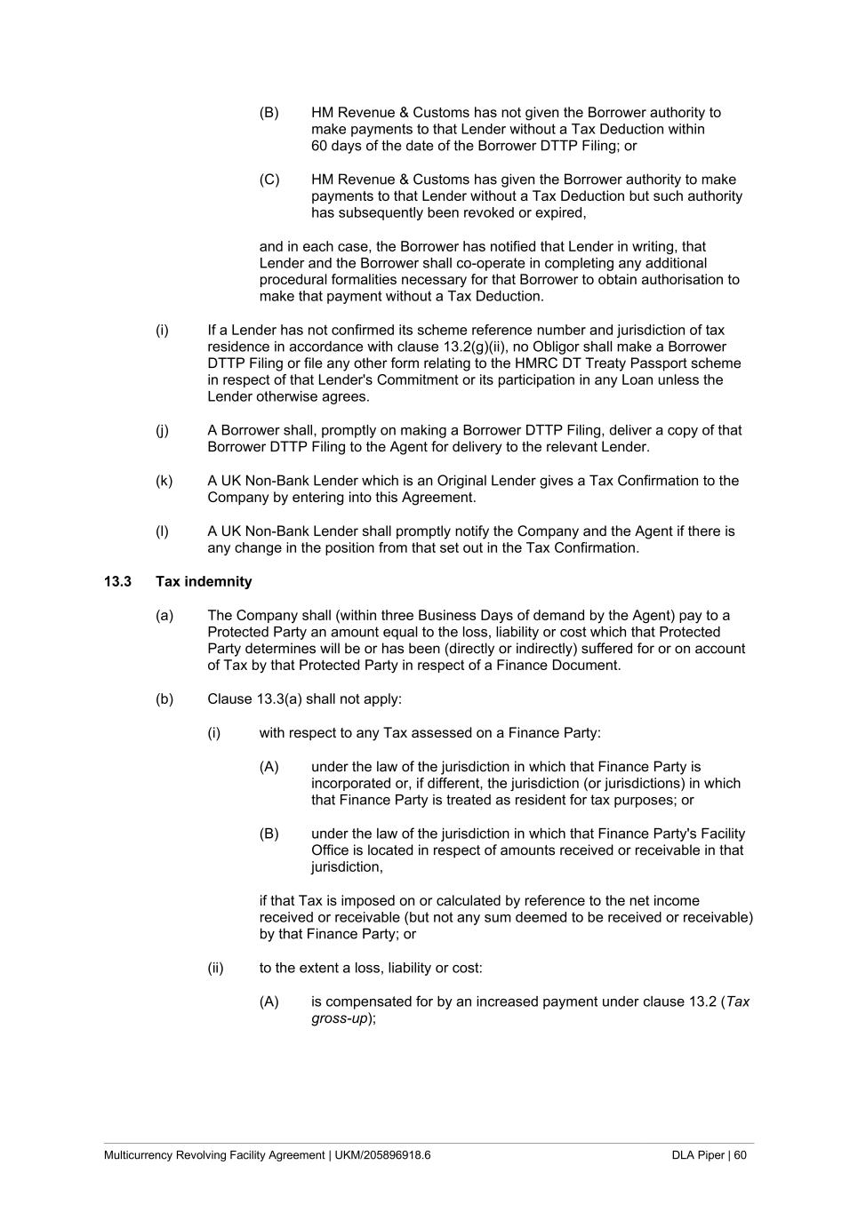 Multicurrency Revolving Facility Agreement | UKM/205896918.6 DLA Piper | 60 (B) HM Revenue & Customs has not given the Borrower authority to make payments to that Lender without a Tax Deduction within 60 days of the date of the Borrower DTTP Filing; or (C) HM Revenue & Customs has given the Borrower authority to make payments to that Lender without a Tax Deduction but such authority has subsequently been revoked or expired, and in each case, the Borrower has notified that Lender in writing, that Lender and the Borrower shall co-operate in completing any additional procedural formalities necessary for that Borrower to obtain authorisation to make that payment without a Tax Deduction. (i) If a Lender has not confirmed its scheme reference number and jurisdiction of tax residence in accordance with clause 13.2(g)(ii), no Obligor shall make a Borrower DTTP Filing or file any other form relating to the HMRC DT Treaty Passport scheme in respect of that Lender's Commitment or its participation in any Loan unless the Lender otherwise agrees. (j) A Borrower shall, promptly on making a Borrower DTTP Filing, deliver a copy of that Borrower DTTP Filing to the Agent for delivery to the relevant Lender. (k) A UK Non-Bank Lender which is an Original Lender gives a Tax Confirmation to the Company by entering into this Agreement. (l) A UK Non-Bank Lender shall promptly notify the Company and the Agent if there is any change in the position from that set out in the Tax Confirmation. 13.3 Tax indemnity (a) The Company shall (within three Business Days of demand by the Agent) pay to a Protected Party an amount equal to the loss, liability or cost which that Protected Party determines will be or has been (directly or indirectly) suffered for or on account of Tax by that Protected Party in respect of a Finance Document. (b) Clause 13.3(a) shall not apply: (i) with respect to any Tax assessed on a Finance Party: (A) under the law of the jurisdiction in which that Finance Party is incorporated or, if different, the jurisdiction (or jurisdictions) in which that Finance Party is treated as resident for tax purposes; or (B) under the law of the jurisdiction in which that Finance Party's Facility Office is located in respect of amounts received or receivable in that jurisdiction, if that Tax is imposed on or calculated by reference to the net income received or receivable (but not any sum deemed to be received or receivable) by that Finance Party; or (ii) to the extent a loss, liability or cost: (A) is compensated for by an increased payment under clause 13.2 (Tax gross-up);