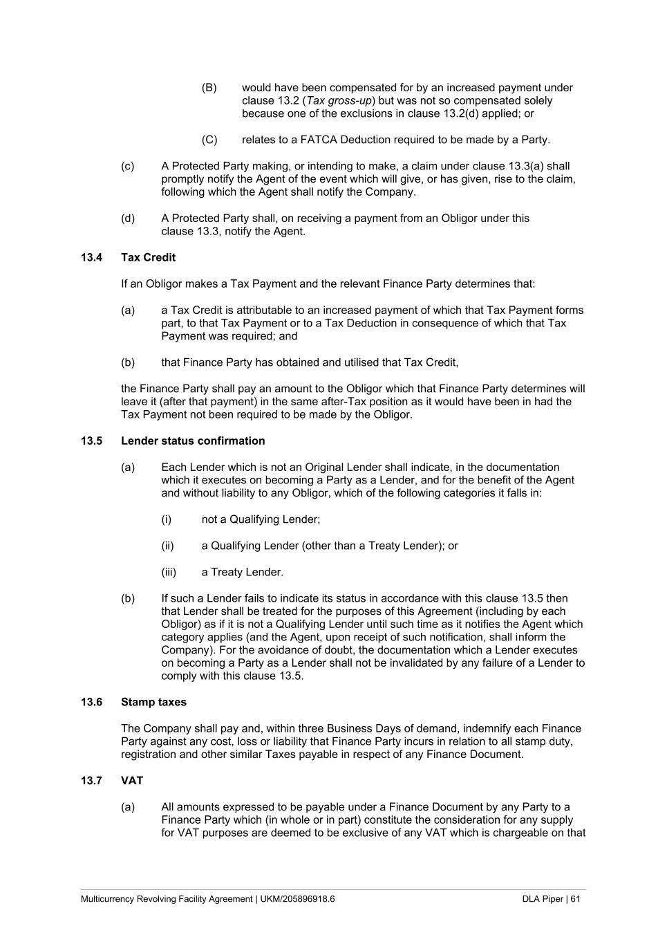 Multicurrency Revolving Facility Agreement | UKM/205896918.6 DLA Piper | 61 (B) would have been compensated for by an increased payment under clause 13.2 (Tax gross-up) but was not so compensated solely because one of the exclusions in clause 13.2(d) applied; or (C) relates to a FATCA Deduction required to be made by a Party. (c) A Protected Party making, or intending to make, a claim under clause 13.3(a) shall promptly notify the Agent of the event which will give, or has given, rise to the claim, following which the Agent shall notify the Company. (d) A Protected Party shall, on receiving a payment from an Obligor under this clause 13.3, notify the Agent. 13.4 Tax Credit If an Obligor makes a Tax Payment and the relevant Finance Party determines that: (a) a Tax Credit is attributable to an increased payment of which that Tax Payment forms part, to that Tax Payment or to a Tax Deduction in consequence of which that Tax Payment was required; and (b) that Finance Party has obtained and utilised that Tax Credit, the Finance Party shall pay an amount to the Obligor which that Finance Party determines will leave it (after that payment) in the same after-Tax position as it would have been in had the Tax Payment not been required to be made by the Obligor. 13.5 Lender status confirmation (a) Each Lender which is not an Original Lender shall indicate, in the documentation which it executes on becoming a Party as a Lender, and for the benefit of the Agent and without liability to any Obligor, which of the following categories it falls in: (i) not a Qualifying Lender; (ii) a Qualifying Lender (other than a Treaty Lender); or (iii) a Treaty Lender. (b) If such a Lender fails to indicate its status in accordance with this clause 13.5 then that Lender shall be treated for the purposes of this Agreement (including by each Obligor) as if it is not a Qualifying Lender until such time as it notifies the Agent which category applies (and the Agent, upon receipt of such notification, shall inform the Company). For the avoidance of doubt, the documentation which a Lender executes on becoming a Party as a Lender shall not be invalidated by any failure of a Lender to comply with this clause 13.5. 13.6 Stamp taxes The Company shall pay and, within three Business Days of demand, indemnify each Finance Party against any cost, loss or liability that Finance Party incurs in relation to all stamp duty, registration and other similar Taxes payable in respect of any Finance Document. 13.7 VAT (a) All amounts expressed to be payable under a Finance Document by any Party to a Finance Party which (in whole or in part) constitute the consideration for any supply for VAT purposes are deemed to be exclusive of any VAT which is chargeable on that