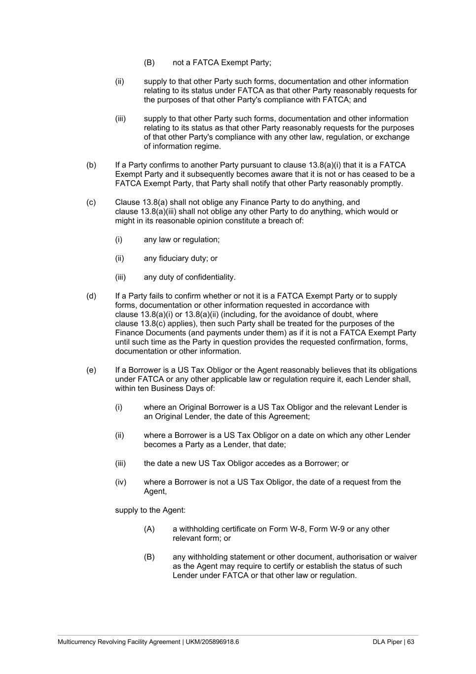 Multicurrency Revolving Facility Agreement | UKM/205896918.6 DLA Piper | 63 (B) not a FATCA Exempt Party; (ii) supply to that other Party such forms, documentation and other information relating to its status under FATCA as that other Party reasonably requests for the purposes of that other Party's compliance with FATCA; and (iii) supply to that other Party such forms, documentation and other information relating to its status as that other Party reasonably requests for the purposes of that other Party's compliance with any other law, regulation, or exchange of information regime. (b) If a Party confirms to another Party pursuant to clause 13.8(a)(i) that it is a FATCA Exempt Party and it subsequently becomes aware that it is not or has ceased to be a FATCA Exempt Party, that Party shall notify that other Party reasonably promptly. (c) Clause 13.8(a) shall not oblige any Finance Party to do anything, and clause 13.8(a)(iii) shall not oblige any other Party to do anything, which would or might in its reasonable opinion constitute a breach of: (i) any law or regulation; (ii) any fiduciary duty; or (iii) any duty of confidentiality. (d) If a Party fails to confirm whether or not it is a FATCA Exempt Party or to supply forms, documentation or other information requested in accordance with clause 13.8(a)(i) or 13.8(a)(ii) (including, for the avoidance of doubt, where clause 13.8(c) applies), then such Party shall be treated for the purposes of the Finance Documents (and payments under them) as if it is not a FATCA Exempt Party until such time as the Party in question provides the requested confirmation, forms, documentation or other information. (e) If a Borrower is a US Tax Obligor or the Agent reasonably believes that its obligations under FATCA or any other applicable law or regulation require it, each Lender shall, within ten Business Days of: (i) where an Original Borrower is a US Tax Obligor and the relevant Lender is an Original Lender, the date of this Agreement; (ii) where a Borrower is a US Tax Obligor on a date on which any other Lender becomes a Party as a Lender, that date; (iii) the date a new US Tax Obligor accedes as a Borrower; or (iv) where a Borrower is not a US Tax Obligor, the date of a request from the Agent, supply to the Agent: (A) a withholding certificate on Form W-8, Form W-9 or any other relevant form; or (B) any withholding statement or other document, authorisation or waiver as the Agent may require to certify or establish the status of such Lender under FATCA or that other law or regulation.