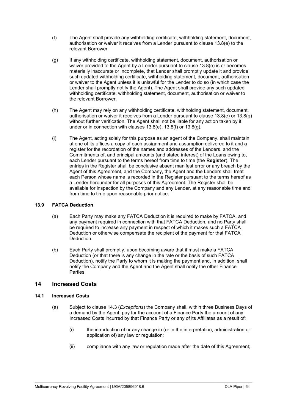 Multicurrency Revolving Facility Agreement | UKM/205896918.6 DLA Piper | 64 (f) The Agent shall provide any withholding certificate, withholding statement, document, authorisation or waiver it receives from a Lender pursuant to clause 13.8(e) to the relevant Borrower. (g) If any withholding certificate, withholding statement, document, authorisation or waiver provided to the Agent by a Lender pursuant to clause 13.8(e) is or becomes materially inaccurate or incomplete, that Lender shall promptly update it and provide such updated withholding certificate, withholding statement, document, authorisation or waiver to the Agent unless it is unlawful for the Lender to do so (in which case the Lender shall promptly notify the Agent). The Agent shall provide any such updated withholding certificate, withholding statement, document, authorisation or waiver to the relevant Borrower. (h) The Agent may rely on any withholding certificate, withholding statement, document, authorisation or waiver it receives from a Lender pursuant to clause 13.8(e) or 13.8(g) without further verification. The Agent shall not be liable for any action taken by it under or in connection with clauses 13.8(e), 13.8(f) or 13.8(g). (i) The Agent, acting solely for this purpose as an agent of the Company, shall maintain at one of its offices a copy of each assignment and assumption delivered to it and a register for the recordation of the names and addresses of the Lenders, and the Commitments of, and principal amounts (and stated interest) of the Loans owing to, each Lender pursuant to the terms hereof from time to time (the Register). The entries in the Register shall be conclusive absent manifest error or any breach by the Agent of this Agreement, and the Company, the Agent and the Lenders shall treat each Person whose name is recorded in the Register pursuant to the terms hereof as a Lender hereunder for all purposes of this Agreement. The Register shall be available for inspection by the Company and any Lender, at any reasonable time and from time to time upon reasonable prior notice. 13.9 FATCA Deduction (a) Each Party may make any FATCA Deduction it is required to make by FATCA, and any payment required in connection with that FATCA Deduction, and no Party shall be required to increase any payment in respect of which it makes such a FATCA Deduction or otherwise compensate the recipient of the payment for that FATCA Deduction. (b) Each Party shall promptly, upon becoming aware that it must make a FATCA Deduction (or that there is any change in the rate or the basis of such FATCA Deduction), notify the Party to whom it is making the payment and, in addition, shall notify the Company and the Agent and the Agent shall notify the other Finance Parties. 14 Increased Costs 14.1 Increased Costs (a) Subject to clause 14.3 (Exceptions) the Company shall, within three Business Days of a demand by the Agent, pay for the account of a Finance Party the amount of any Increased Costs incurred by that Finance Party or any of its Affiliates as a result of: (i) the introduction of or any change in (or in the interpretation, administration or application of) any law or regulation; (ii) compliance with any law or regulation made after the date of this Agreement;