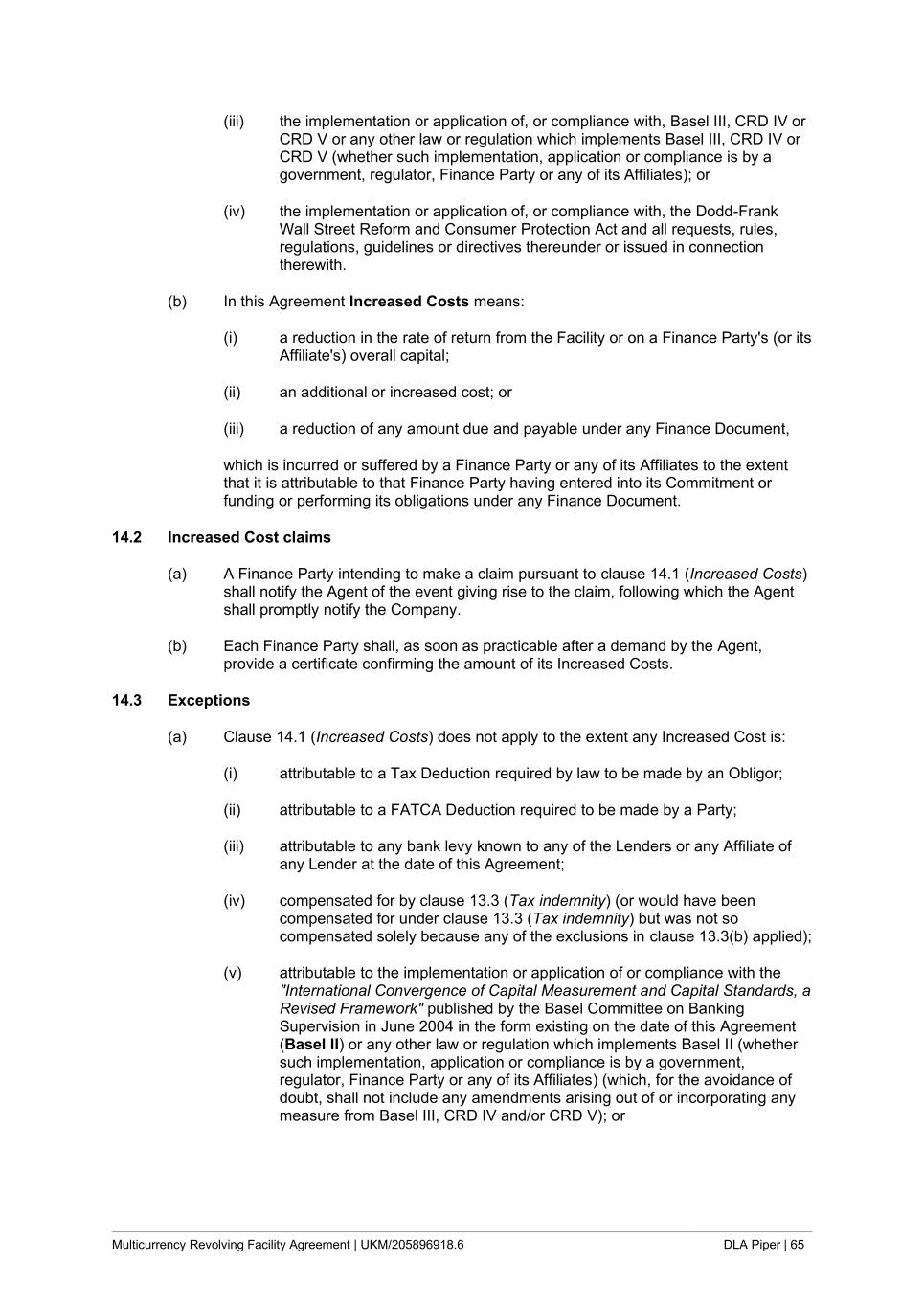 Multicurrency Revolving Facility Agreement | UKM/205896918.6 DLA Piper | 65 (iii) the implementation or application of, or compliance with, Basel III, CRD IV or CRD V or any other law or regulation which implements Basel III, CRD IV or CRD V (whether such implementation, application or compliance is by a government, regulator, Finance Party or any of its Affiliates); or (iv) the implementation or application of, or compliance with, the Dodd-Frank Wall Street Reform and Consumer Protection Act and all requests, rules, regulations, guidelines or directives thereunder or issued in connection therewith. (b) In this Agreement Increased Costs means: (i) a reduction in the rate of return from the Facility or on a Finance Party's (or its Affiliate's) overall capital; (ii) an additional or increased cost; or (iii) a reduction of any amount due and payable under any Finance Document, which is incurred or suffered by a Finance Party or any of its Affiliates to the extent that it is attributable to that Finance Party having entered into its Commitment or funding or performing its obligations under any Finance Document. 14.2 Increased Cost claims (a) A Finance Party intending to make a claim pursuant to clause 14.1 (Increased Costs) shall notify the Agent of the event giving rise to the claim, following which the Agent shall promptly notify the Company. (b) Each Finance Party shall, as soon as practicable after a demand by the Agent, provide a certificate confirming the amount of its Increased Costs. 14.3 Exceptions (a) Clause 14.1 (Increased Costs) does not apply to the extent any Increased Cost is: (i) attributable to a Tax Deduction required by law to be made by an Obligor; (ii) attributable to a FATCA Deduction required to be made by a Party; (iii) attributable to any bank levy known to any of the Lenders or any Affiliate of any Lender at the date of this Agreement; (iv) compensated for by clause 13.3 (Tax indemnity) (or would have been compensated for under clause 13.3 (Tax indemnity) but was not so compensated solely because any of the exclusions in clause 13.3(b) applied); (v) attributable to the implementation or application of or compliance with the "International Convergence of Capital Measurement and Capital Standards, a Revised Framework" published by the Basel Committee on Banking Supervision in June 2004 in the form existing on the date of this Agreement (Basel II) or any other law or regulation which implements Basel II (whether such implementation, application or compliance is by a government, regulator, Finance Party or any of its Affiliates) (which, for the avoidance of doubt, shall not include any amendments arising out of or incorporating any measure from Basel III, CRD IV and/or CRD V); or