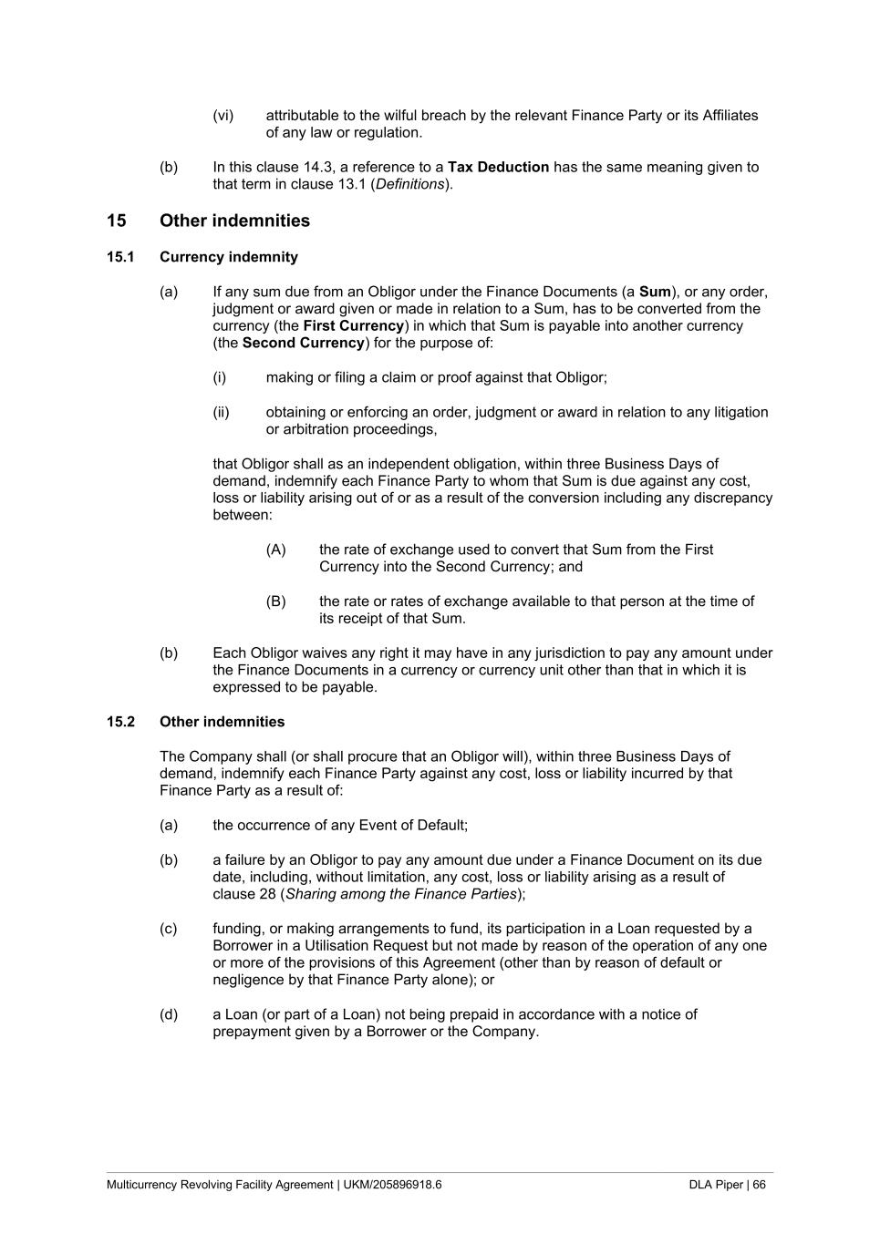 Multicurrency Revolving Facility Agreement | UKM/205896918.6 DLA Piper | 66 (vi) attributable to the wilful breach by the relevant Finance Party or its Affiliates of any law or regulation. (b) In this clause 14.3, a reference to a Tax Deduction has the same meaning given to that term in clause 13.1 (Definitions). 15 Other indemnities 15.1 Currency indemnity (a) If any sum due from an Obligor under the Finance Documents (a Sum), or any order, judgment or award given or made in relation to a Sum, has to be converted from the currency (the First Currency) in which that Sum is payable into another currency (the Second Currency) for the purpose of: (i) making or filing a claim or proof against that Obligor; (ii) obtaining or enforcing an order, judgment or award in relation to any litigation or arbitration proceedings, that Obligor shall as an independent obligation, within three Business Days of demand, indemnify each Finance Party to whom that Sum is due against any cost, loss or liability arising out of or as a result of the conversion including any discrepancy between: (A) the rate of exchange used to convert that Sum from the First Currency into the Second Currency; and (B) the rate or rates of exchange available to that person at the time of its receipt of that Sum. (b) Each Obligor waives any right it may have in any jurisdiction to pay any amount under the Finance Documents in a currency or currency unit other than that in which it is expressed to be payable. 15.2 Other indemnities The Company shall (or shall procure that an Obligor will), within three Business Days of demand, indemnify each Finance Party against any cost, loss or liability incurred by that Finance Party as a result of: (a) the occurrence of any Event of Default; (b) a failure by an Obligor to pay any amount due under a Finance Document on its due date, including, without limitation, any cost, loss or liability arising as a result of clause 28 (Sharing among the Finance Parties); (c) funding, or making arrangements to fund, its participation in a Loan requested by a Borrower in a Utilisation Request but not made by reason of the operation of any one or more of the provisions of this Agreement (other than by reason of default or negligence by that Finance Party alone); or (d) a Loan (or part of a Loan) not being prepaid in accordance with a notice of prepayment given by a Borrower or the Company.