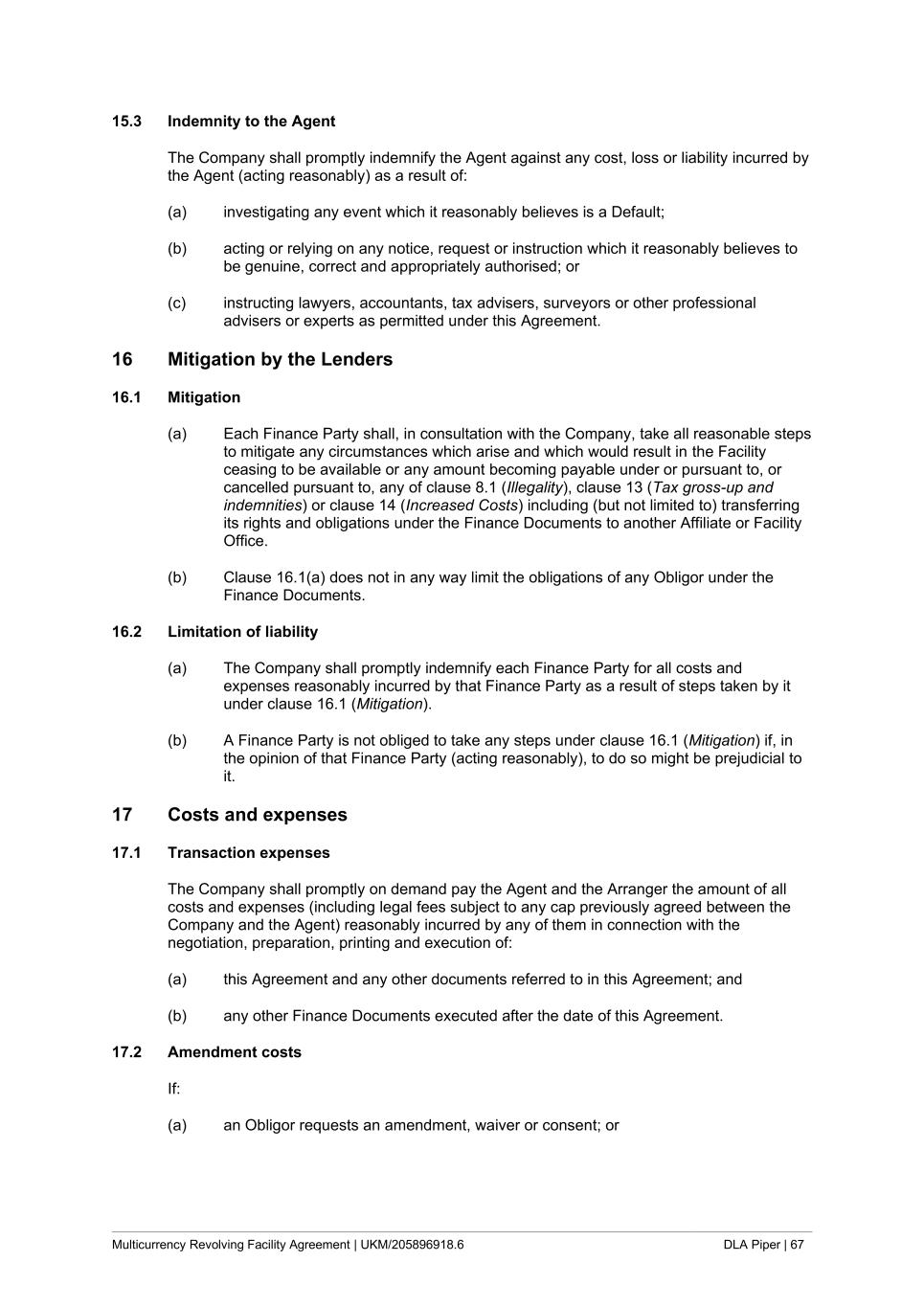 Multicurrency Revolving Facility Agreement | UKM/205896918.6 DLA Piper | 67 15.3 Indemnity to the Agent The Company shall promptly indemnify the Agent against any cost, loss or liability incurred by the Agent (acting reasonably) as a result of: (a) investigating any event which it reasonably believes is a Default; (b) acting or relying on any notice, request or instruction which it reasonably believes to be genuine, correct and appropriately authorised; or (c) instructing lawyers, accountants, tax advisers, surveyors or other professional advisers or experts as permitted under this Agreement. 16 Mitigation by the Lenders 16.1 Mitigation (a) Each Finance Party shall, in consultation with the Company, take all reasonable steps to mitigate any circumstances which arise and which would result in the Facility ceasing to be available or any amount becoming payable under or pursuant to, or cancelled pursuant to, any of clause 8.1 (Illegality), clause 13 (Tax gross-up and indemnities) or clause 14 (Increased Costs) including (but not limited to) transferring its rights and obligations under the Finance Documents to another Affiliate or Facility Office. (b) Clause 16.1(a) does not in any way limit the obligations of any Obligor under the Finance Documents. 16.2 Limitation of liability (a) The Company shall promptly indemnify each Finance Party for all costs and expenses reasonably incurred by that Finance Party as a result of steps taken by it under clause 16.1 (Mitigation). (b) A Finance Party is not obliged to take any steps under clause 16.1 (Mitigation) if, in the opinion of that Finance Party (acting reasonably), to do so might be prejudicial to it. 17 Costs and expenses 17.1 Transaction expenses The Company shall promptly on demand pay the Agent and the Arranger the amount of all costs and expenses (including legal fees subject to any cap previously agreed between the Company and the Agent) reasonably incurred by any of them in connection with the negotiation, preparation, printing and execution of: (a) this Agreement and any other documents referred to in this Agreement; and (b) any other Finance Documents executed after the date of this Agreement. 17.2 Amendment costs If: (a) an Obligor requests an amendment, waiver or consent; or