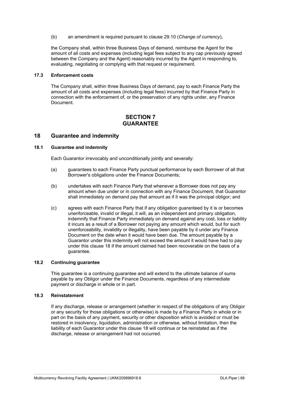 Multicurrency Revolving Facility Agreement | UKM/205896918.6 DLA Piper | 68 (b) an amendment is required pursuant to clause 29.10 (Change of currency), the Company shall, within three Business Days of demand, reimburse the Agent for the amount of all costs and expenses (including legal fees subject to any cap previously agreed between the Company and the Agent) reasonably incurred by the Agent in responding to, evaluating, negotiating or complying with that request or requirement. 17.3 Enforcement costs The Company shall, within three Business Days of demand, pay to each Finance Party the amount of all costs and expenses (including legal fees) incurred by that Finance Party in connection with the enforcement of, or the preservation of any rights under, any Finance Document. SECTION 7 GUARANTEE 18 Guarantee and indemnity 18.1 Guarantee and indemnity Each Guarantor irrevocably and unconditionally jointly and severally: (a) guarantees to each Finance Party punctual performance by each Borrower of all that Borrower's obligations under the Finance Documents; (b) undertakes with each Finance Party that whenever a Borrower does not pay any amount when due under or in connection with any Finance Document, that Guarantor shall immediately on demand pay that amount as if it was the principal obligor; and (c) agrees with each Finance Party that if any obligation guaranteed by it is or becomes unenforceable, invalid or illegal, it will, as an independent and primary obligation, indemnify that Finance Party immediately on demand against any cost, loss or liability it incurs as a result of a Borrower not paying any amount which would, but for such unenforceability, invalidity or illegality, have been payable by it under any Finance Document on the date when it would have been due. The amount payable by a Guarantor under this indemnity will not exceed the amount it would have had to pay under this clause 18 if the amount claimed had been recoverable on the basis of a guarantee. 18.2 Continuing guarantee This guarantee is a continuing guarantee and will extend to the ultimate balance of sums payable by any Obligor under the Finance Documents, regardless of any intermediate payment or discharge in whole or in part. 18.3 Reinstatement If any discharge, release or arrangement (whether in respect of the obligations of any Obligor or any security for those obligations or otherwise) is made by a Finance Party in whole or in part on the basis of any payment, security or other disposition which is avoided or must be restored in insolvency, liquidation, administration or otherwise, without limitation, then the liability of each Guarantor under this clause 18 will continue or be reinstated as if the discharge, release or arrangement had not occurred.