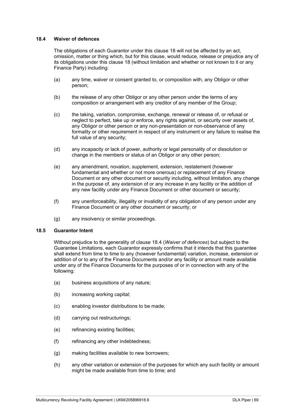 Multicurrency Revolving Facility Agreement | UKM/205896918.6 DLA Piper | 69 18.4 Waiver of defences The obligations of each Guarantor under this clause 18 will not be affected by an act, omission, matter or thing which, but for this clause, would reduce, release or prejudice any of its obligations under this clause 18 (without limitation and whether or not known to it or any Finance Party) including: (a) any time, waiver or consent granted to, or composition with, any Obligor or other person; (b) the release of any other Obligor or any other person under the terms of any composition or arrangement with any creditor of any member of the Group; (c) the taking, variation, compromise, exchange, renewal or release of, or refusal or neglect to perfect, take up or enforce, any rights against, or security over assets of, any Obligor or other person or any non-presentation or non-observance of any formality or other requirement in respect of any instrument or any failure to realise the full value of any security; (d) any incapacity or lack of power, authority or legal personality of or dissolution or change in the members or status of an Obligor or any other person; (e) any amendment, novation, supplement, extension, restatement (however fundamental and whether or not more onerous) or replacement of any Finance Document or any other document or security including, without limitation, any change in the purpose of, any extension of or any increase in any facility or the addition of any new facility under any Finance Document or other document or security; (f) any unenforceability, illegality or invalidity of any obligation of any person under any Finance Document or any other document or security; or (g) any insolvency or similar proceedings. 18.5 Guarantor Intent Without prejudice to the generality of clause 18.4 (Waiver of defences) but subject to the Guarantee Limitations, each Guarantor expressly confirms that it intends that this guarantee shall extend from time to time to any (however fundamental) variation, increase, extension or addition of or to any of the Finance Documents and/or any facility or amount made available under any of the Finance Documents for the purposes of or in connection with any of the following: (a) business acquisitions of any nature; (b) increasing working capital; (c) enabling investor distributions to be made; (d) carrying out restructurings; (e) refinancing existing facilities; (f) refinancing any other indebtedness; (g) making facilities available to new borrowers; (h) any other variation or extension of the purposes for which any such facility or amount might be made available from time to time; and