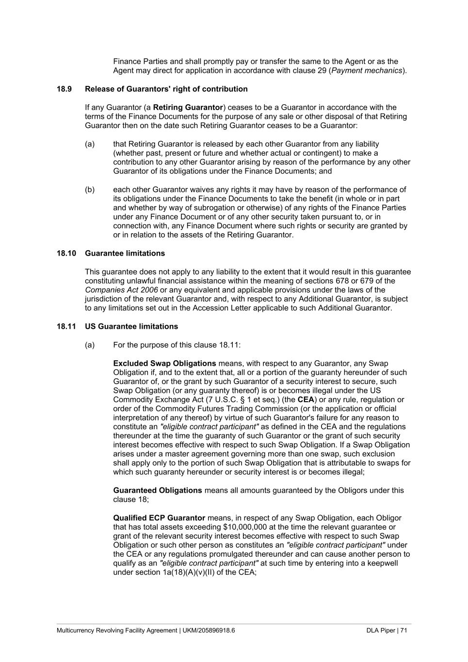 Multicurrency Revolving Facility Agreement | UKM/205896918.6 DLA Piper | 71 Finance Parties and shall promptly pay or transfer the same to the Agent or as the Agent may direct for application in accordance with clause 29 (Payment mechanics). 18.9 Release of Guarantors' right of contribution If any Guarantor (a Retiring Guarantor) ceases to be a Guarantor in accordance with the terms of the Finance Documents for the purpose of any sale or other disposal of that Retiring Guarantor then on the date such Retiring Guarantor ceases to be a Guarantor: (a) that Retiring Guarantor is released by each other Guarantor from any liability (whether past, present or future and whether actual or contingent) to make a contribution to any other Guarantor arising by reason of the performance by any other Guarantor of its obligations under the Finance Documents; and (b) each other Guarantor waives any rights it may have by reason of the performance of its obligations under the Finance Documents to take the benefit (in whole or in part and whether by way of subrogation or otherwise) of any rights of the Finance Parties under any Finance Document or of any other security taken pursuant to, or in connection with, any Finance Document where such rights or security are granted by or in relation to the assets of the Retiring Guarantor. 18.10 Guarantee limitations This guarantee does not apply to any liability to the extent that it would result in this guarantee constituting unlawful financial assistance within the meaning of sections 678 or 679 of the Companies Act 2006 or any equivalent and applicable provisions under the laws of the jurisdiction of the relevant Guarantor and, with respect to any Additional Guarantor, is subject to any limitations set out in the Accession Letter applicable to such Additional Guarantor. 18.11 US Guarantee limitations (a) For the purpose of this clause 18.11: Excluded Swap Obligations means, with respect to any Guarantor, any Swap Obligation if, and to the extent that, all or a portion of the guaranty hereunder of such Guarantor of, or the grant by such Guarantor of a security interest to secure, such Swap Obligation (or any guaranty thereof) is or becomes illegal under the US Commodity Exchange Act (7 U.S.C. § 1 et seq.) (the CEA) or any rule, regulation or order of the Commodity Futures Trading Commission (or the application or official interpretation of any thereof) by virtue of such Guarantor's failure for any reason to constitute an "eligible contract participant" as defined in the CEA and the regulations thereunder at the time the guaranty of such Guarantor or the grant of such security interest becomes effective with respect to such Swap Obligation. If a Swap Obligation arises under a master agreement governing more than one swap, such exclusion shall apply only to the portion of such Swap Obligation that is attributable to swaps for which such guaranty hereunder or security interest is or becomes illegal; Guaranteed Obligations means all amounts guaranteed by the Obligors under this clause 18; Qualified ECP Guarantor means, in respect of any Swap Obligation, each Obligor that has total assets exceeding $10,000,000 at the time the relevant guarantee or grant of the relevant security interest becomes effective with respect to such Swap Obligation or such other person as constitutes an "eligible contract participant" under the CEA or any regulations promulgated thereunder and can cause another person to qualify as an "eligible contract participant" at such time by entering into a keepwell under section 1a(18)(A)(v)(II) of the CEA;
