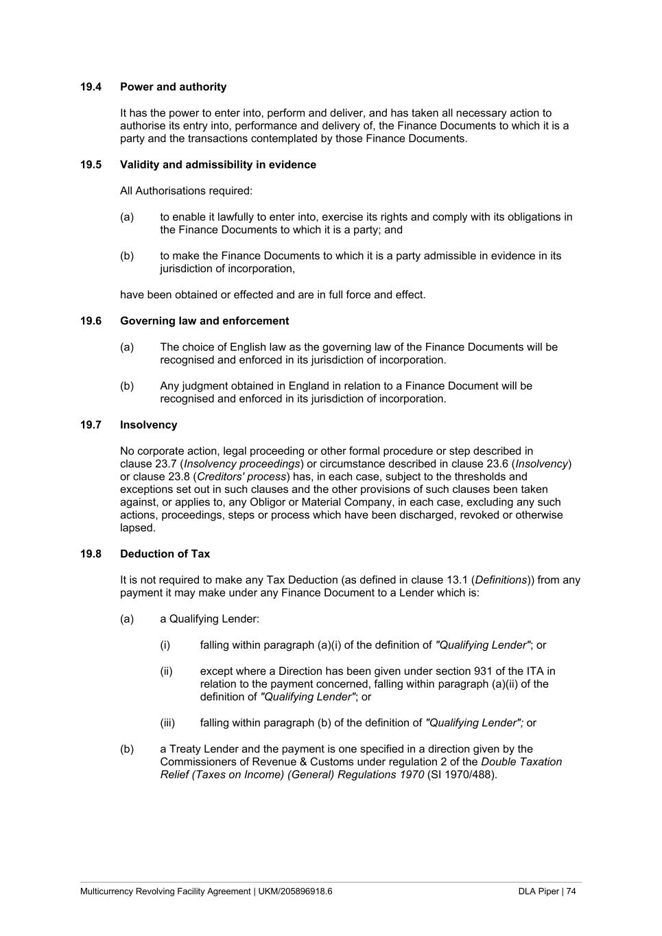 Multicurrency Revolving Facility Agreement | UKM/205896918.6 DLA Piper | 74 19.4 Power and authority It has the power to enter into, perform and deliver, and has taken all necessary action to authorise its entry into, performance and delivery of, the Finance Documents to which it is a party and the transactions contemplated by those Finance Documents. 19.5 Validity and admissibility in evidence All Authorisations required: (a) to enable it lawfully to enter into, exercise its rights and comply with its obligations in the Finance Documents to which it is a party; and (b) to make the Finance Documents to which it is a party admissible in evidence in its jurisdiction of incorporation, have been obtained or effected and are in full force and effect. 19.6 Governing law and enforcement (a) The choice of English law as the governing law of the Finance Documents will be recognised and enforced in its jurisdiction of incorporation. (b) Any judgment obtained in England in relation to a Finance Document will be recognised and enforced in its jurisdiction of incorporation. 19.7 Insolvency No corporate action, legal proceeding or other formal procedure or step described in clause 23.7 (Insolvency proceedings) or circumstance described in clause 23.6 (Insolvency) or clause 23.8 (Creditors' process) has, in each case, subject to the thresholds and exceptions set out in such clauses and the other provisions of such clauses been taken against, or applies to, any Obligor or Material Company, in each case, excluding any such actions, proceedings, steps or process which have been discharged, revoked or otherwise lapsed. 19.8 Deduction of Tax It is not required to make any Tax Deduction (as defined in clause 13.1 (Definitions)) from any payment it may make under any Finance Document to a Lender which is: (a) a Qualifying Lender: (i) falling within paragraph (a)(i) of the definition of "Qualifying Lender"; or (ii) except where a Direction has been given under section 931 of the ITA in relation to the payment concerned, falling within paragraph (a)(ii) of the definition of "Qualifying Lender"; or (iii) falling within paragraph (b) of the definition of "Qualifying Lender"; or (b) a Treaty Lender and the payment is one specified in a direction given by the Commissioners of Revenue & Customs under regulation 2 of the Double Taxation Relief (Taxes on Income) (General) Regulations 1970 (SI 1970/488).