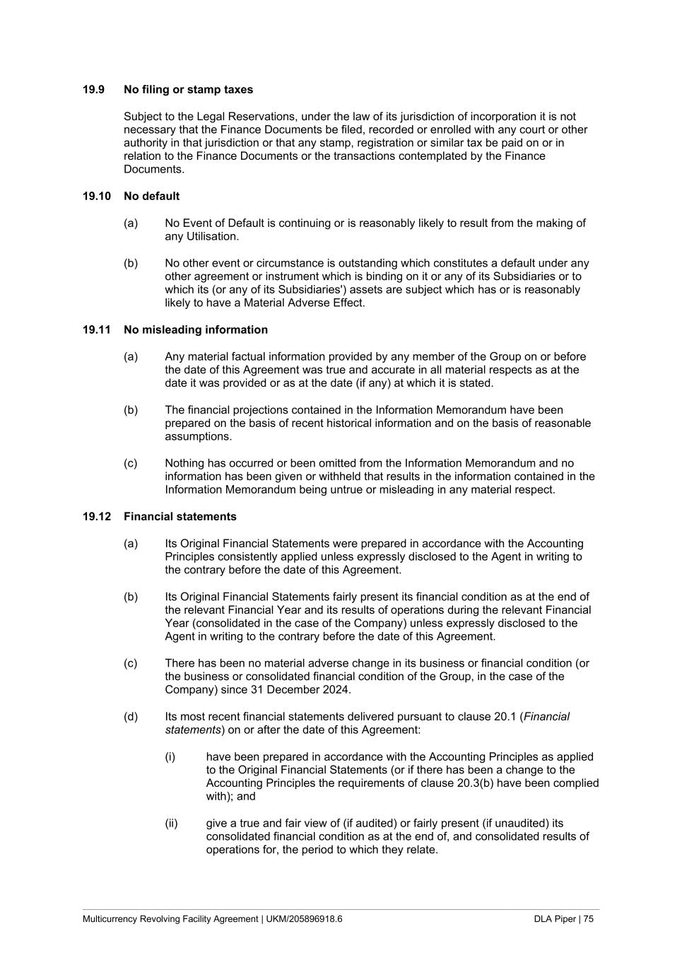 Multicurrency Revolving Facility Agreement | UKM/205896918.6 DLA Piper | 75 19.9 No filing or stamp taxes Subject to the Legal Reservations, under the law of its jurisdiction of incorporation it is not necessary that the Finance Documents be filed, recorded or enrolled with any court or other authority in that jurisdiction or that any stamp, registration or similar tax be paid on or in relation to the Finance Documents or the transactions contemplated by the Finance Documents. 19.10 No default (a) No Event of Default is continuing or is reasonably likely to result from the making of any Utilisation. (b) No other event or circumstance is outstanding which constitutes a default under any other agreement or instrument which is binding on it or any of its Subsidiaries or to which its (or any of its Subsidiaries') assets are subject which has or is reasonably likely to have a Material Adverse Effect. 19.11 No misleading information (a) Any material factual information provided by any member of the Group on or before the date of this Agreement was true and accurate in all material respects as at the date it was provided or as at the date (if any) at which it is stated. (b) The financial projections contained in the Information Memorandum have been prepared on the basis of recent historical information and on the basis of reasonable assumptions. (c) Nothing has occurred or been omitted from the Information Memorandum and no information has been given or withheld that results in the information contained in the Information Memorandum being untrue or misleading in any material respect. 19.12 Financial statements (a) Its Original Financial Statements were prepared in accordance with the Accounting Principles consistently applied unless expressly disclosed to the Agent in writing to the contrary before the date of this Agreement. (b) Its Original Financial Statements fairly present its financial condition as at the end of the relevant Financial Year and its results of operations during the relevant Financial Year (consolidated in the case of the Company) unless expressly disclosed to the Agent in writing to the contrary before the date of this Agreement. (c) There has been no material adverse change in its business or financial condition (or the business or consolidated financial condition of the Group, in the case of the Company) since 31 December 2024. (d) Its most recent financial statements delivered pursuant to clause 20.1 (Financial statements) on or after the date of this Agreement: (i) have been prepared in accordance with the Accounting Principles as applied to the Original Financial Statements (or if there has been a change to the Accounting Principles the requirements of clause 20.3(b) have been complied with); and (ii) give a true and fair view of (if audited) or fairly present (if unaudited) its consolidated financial condition as at the end of, and consolidated results of operations for, the period to which they relate.