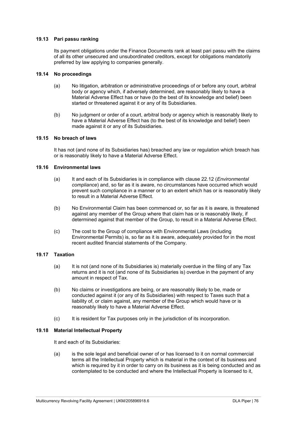 Multicurrency Revolving Facility Agreement | UKM/205896918.6 DLA Piper | 76 19.13 Pari passu ranking Its payment obligations under the Finance Documents rank at least pari passu with the claims of all its other unsecured and unsubordinated creditors, except for obligations mandatorily preferred by law applying to companies generally. 19.14 No proceedings (a) No litigation, arbitration or administrative proceedings of or before any court, arbitral body or agency which, if adversely determined, are reasonably likely to have a Material Adverse Effect has or have (to the best of its knowledge and belief) been started or threatened against it or any of its Subsidiaries. (b) No judgment or order of a court, arbitral body or agency which is reasonably likely to have a Material Adverse Effect has (to the best of its knowledge and belief) been made against it or any of its Subsidiaries. 19.15 No breach of laws It has not (and none of its Subsidiaries has) breached any law or regulation which breach has or is reasonably likely to have a Material Adverse Effect. 19.16 Environmental laws (a) It and each of its Subsidiaries is in compliance with clause 22.12 (Environmental compliance) and, so far as it is aware, no circumstances have occurred which would prevent such compliance in a manner or to an extent which has or is reasonably likely to result in a Material Adverse Effect. (b) No Environmental Claim has been commenced or, so far as it is aware, is threatened against any member of the Group where that claim has or is reasonably likely, if determined against that member of the Group, to result in a Material Adverse Effect. (c) The cost to the Group of compliance with Environmental Laws (including Environmental Permits) is, so far as it is aware, adequately provided for in the most recent audited financial statements of the Company. 19.17 Taxation (a) It is not (and none of its Subsidiaries is) materially overdue in the filing of any Tax returns and it is not (and none of its Subsidiaries is) overdue in the payment of any amount in respect of Tax. (b) No claims or investigations are being, or are reasonably likely to be, made or conducted against it (or any of its Subsidiaries) with respect to Taxes such that a liability of, or claim against, any member of the Group which would have or is reasonably likely to have a Material Adverse Effect. (c) It is resident for Tax purposes only in the jurisdiction of its incorporation. 19.18 Material Intellectual Property It and each of its Subsidiaries: (a) is the sole legal and beneficial owner of or has licensed to it on normal commercial terms all the Intellectual Property which is material in the context of its business and which is required by it in order to carry on its business as it is being conducted and as contemplated to be conducted and where the Intellectual Property is licensed to it,
