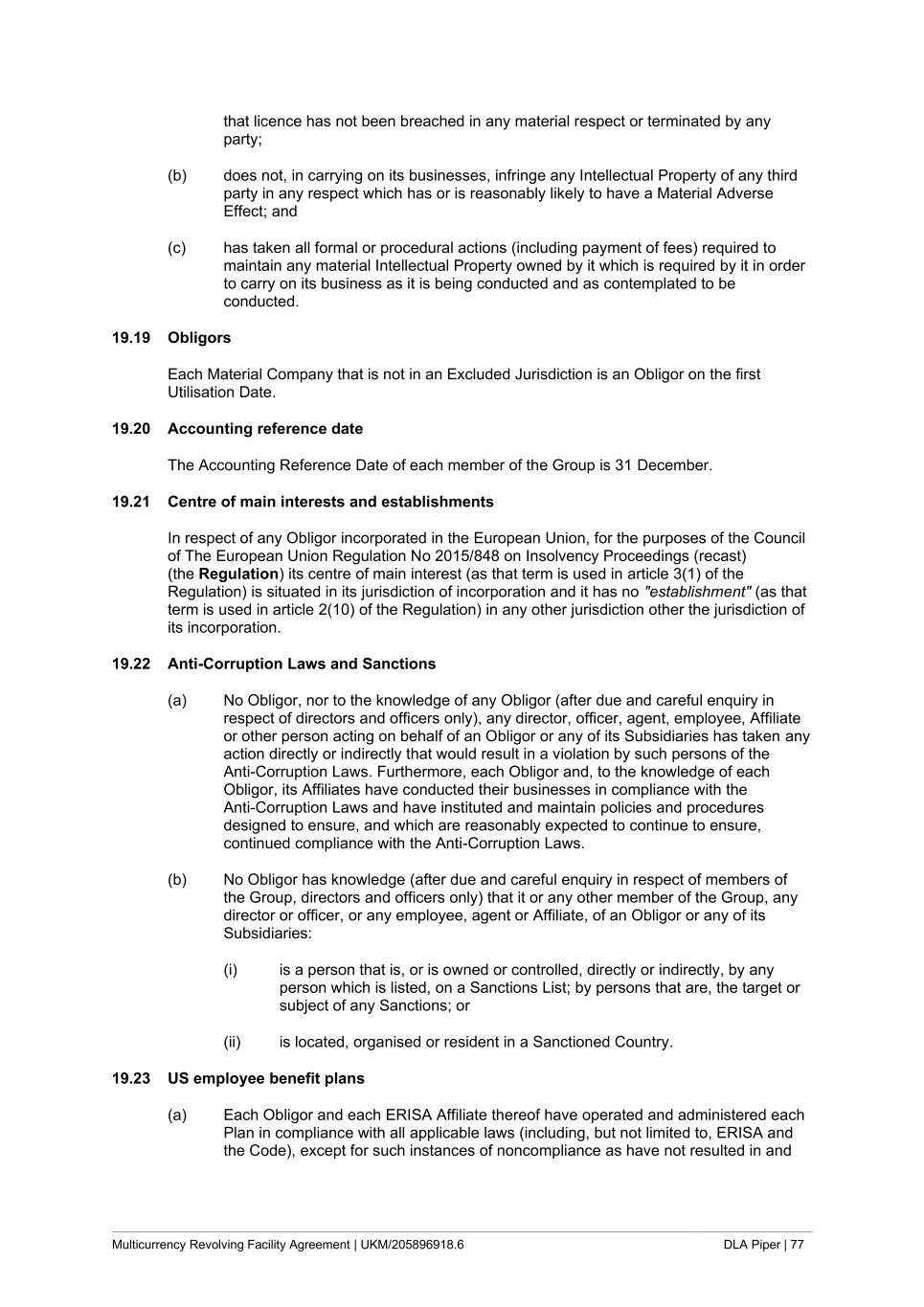 Multicurrency Revolving Facility Agreement | UKM/205896918.6 DLA Piper | 77 that licence has not been breached in any material respect or terminated by any party; (b) does not, in carrying on its businesses, infringe any Intellectual Property of any third party in any respect which has or is reasonably likely to have a Material Adverse Effect; and (c) has taken all formal or procedural actions (including payment of fees) required to maintain any material Intellectual Property owned by it which is required by it in order to carry on its business as it is being conducted and as contemplated to be conducted. 19.19 Obligors Each Material Company that is not in an Excluded Jurisdiction is an Obligor on the first Utilisation Date. 19.20 Accounting reference date The Accounting Reference Date of each member of the Group is 31 December. 19.21 Centre of main interests and establishments In respect of any Obligor incorporated in the European Union, for the purposes of the Council of The European Union Regulation No 2015/848 on Insolvency Proceedings (recast) (the Regulation) its centre of main interest (as that term is used in article 3(1) of the Regulation) is situated in its jurisdiction of incorporation and it has no "establishment" (as that term is used in article 2(10) of the Regulation) in any other jurisdiction other the jurisdiction of its incorporation. 19.22 Anti-Corruption Laws and Sanctions (a) No Obligor, nor to the knowledge of any Obligor (after due and careful enquiry in respect of directors and officers only), any director, officer, agent, employee, Affiliate or other person acting on behalf of an Obligor or any of its Subsidiaries has taken any action directly or indirectly that would result in a violation by such persons of the Anti-Corruption Laws. Furthermore, each Obligor and, to the knowledge of each Obligor, its Affiliates have conducted their businesses in compliance with the Anti-Corruption Laws and have instituted and maintain policies and procedures designed to ensure, and which are reasonably expected to continue to ensure, continued compliance with the Anti-Corruption Laws. (b) No Obligor has knowledge (after due and careful enquiry in respect of members of the Group, directors and officers only) that it or any other member of the Group, any director or officer, or any employee, agent or Affiliate, of an Obligor or any of its Subsidiaries: (i) is a person that is, or is owned or controlled, directly or indirectly, by any person which is listed, on a Sanctions List; by persons that are, the target or subject of any Sanctions; or (ii) is located, organised or resident in a Sanctioned Country. 19.23 US employee benefit plans (a) Each Obligor and each ERISA Affiliate thereof have operated and administered each Plan in compliance with all applicable laws (including, but not limited to, ERISA and the Code), except for such instances of noncompliance as have not resulted in and