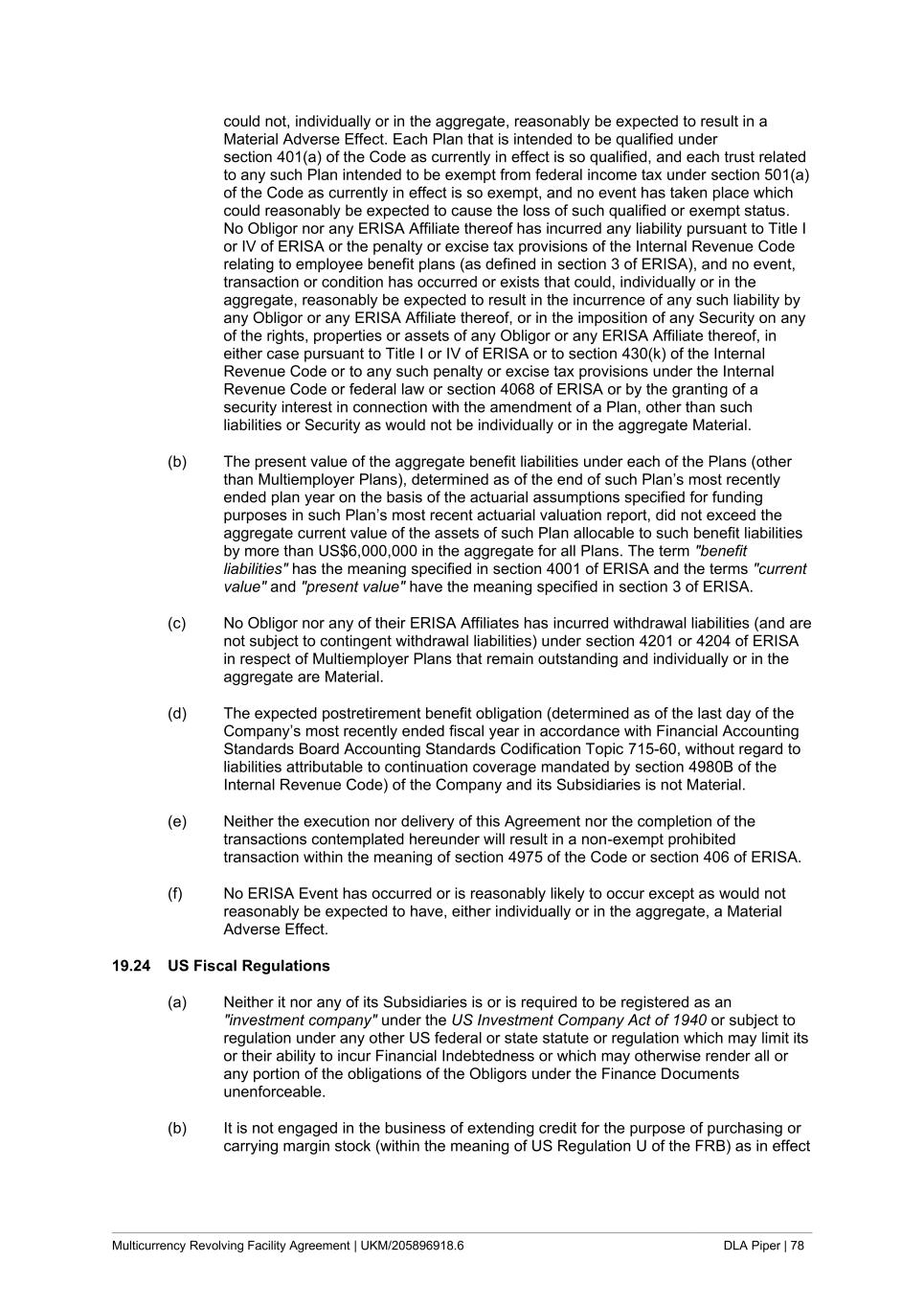 Multicurrency Revolving Facility Agreement | UKM/205896918.6 DLA Piper | 78 could not, individually or in the aggregate, reasonably be expected to result in a Material Adverse Effect. Each Plan that is intended to be qualified under section 401(a) of the Code as currently in effect is so qualified, and each trust related to any such Plan intended to be exempt from federal income tax under section 501(a) of the Code as currently in effect is so exempt, and no event has taken place which could reasonably be expected to cause the loss of such qualified or exempt status. No Obligor nor any ERISA Affiliate thereof has incurred any liability pursuant to Title I or IV of ERISA or the penalty or excise tax provisions of the Internal Revenue Code relating to employee benefit plans (as defined in section 3 of ERISA), and no event, transaction or condition has occurred or exists that could, individually or in the aggregate, reasonably be expected to result in the incurrence of any such liability by any Obligor or any ERISA Affiliate thereof, or in the imposition of any Security on any of the rights, properties or assets of any Obligor or any ERISA Affiliate thereof, in either case pursuant to Title I or IV of ERISA or to section 430(k) of the Internal Revenue Code or to any such penalty or excise tax provisions under the Internal Revenue Code or federal law or section 4068 of ERISA or by the granting of a security interest in connection with the amendment of a Plan, other than such liabilities or Security as would not be individually or in the aggregate Material. (b) The present value of the aggregate benefit liabilities under each of the Plans (other than Multiemployer Plans), determined as of the end of such Plan’s most recently ended plan year on the basis of the actuarial assumptions specified for funding purposes in such Plan’s most recent actuarial valuation report, did not exceed the aggregate current value of the assets of such Plan allocable to such benefit liabilities by more than US$6,000,000 in the aggregate for all Plans. The term "benefit liabilities" has the meaning specified in section 4001 of ERISA and the terms "current value" and "present value" have the meaning specified in section 3 of ERISA. (c) No Obligor nor any of their ERISA Affiliates has incurred withdrawal liabilities (and are not subject to contingent withdrawal liabilities) under section 4201 or 4204 of ERISA in respect of Multiemployer Plans that remain outstanding and individually or in the aggregate are Material. (d) The expected postretirement benefit obligation (determined as of the last day of the Company’s most recently ended fiscal year in accordance with Financial Accounting Standards Board Accounting Standards Codification Topic 715-60, without regard to liabilities attributable to continuation coverage mandated by section 4980B of the Internal Revenue Code) of the Company and its Subsidiaries is not Material. (e) Neither the execution nor delivery of this Agreement nor the completion of the transactions contemplated hereunder will result in a non-exempt prohibited transaction within the meaning of section 4975 of the Code or section 406 of ERISA. (f) No ERISA Event has occurred or is reasonably likely to occur except as would not reasonably be expected to have, either individually or in the aggregate, a Material Adverse Effect. 19.24 US Fiscal Regulations (a) Neither it nor any of its Subsidiaries is or is required to be registered as an "investment company" under the US Investment Company Act of 1940 or subject to regulation under any other US federal or state statute or regulation which may limit its or their ability to incur Financial Indebtedness or which may otherwise render all or any portion of the obligations of the Obligors under the Finance Documents unenforceable. (b) It is not engaged in the business of extending credit for the purpose of purchasing or carrying margin stock (within the meaning of US Regulation U of the FRB) as in effect