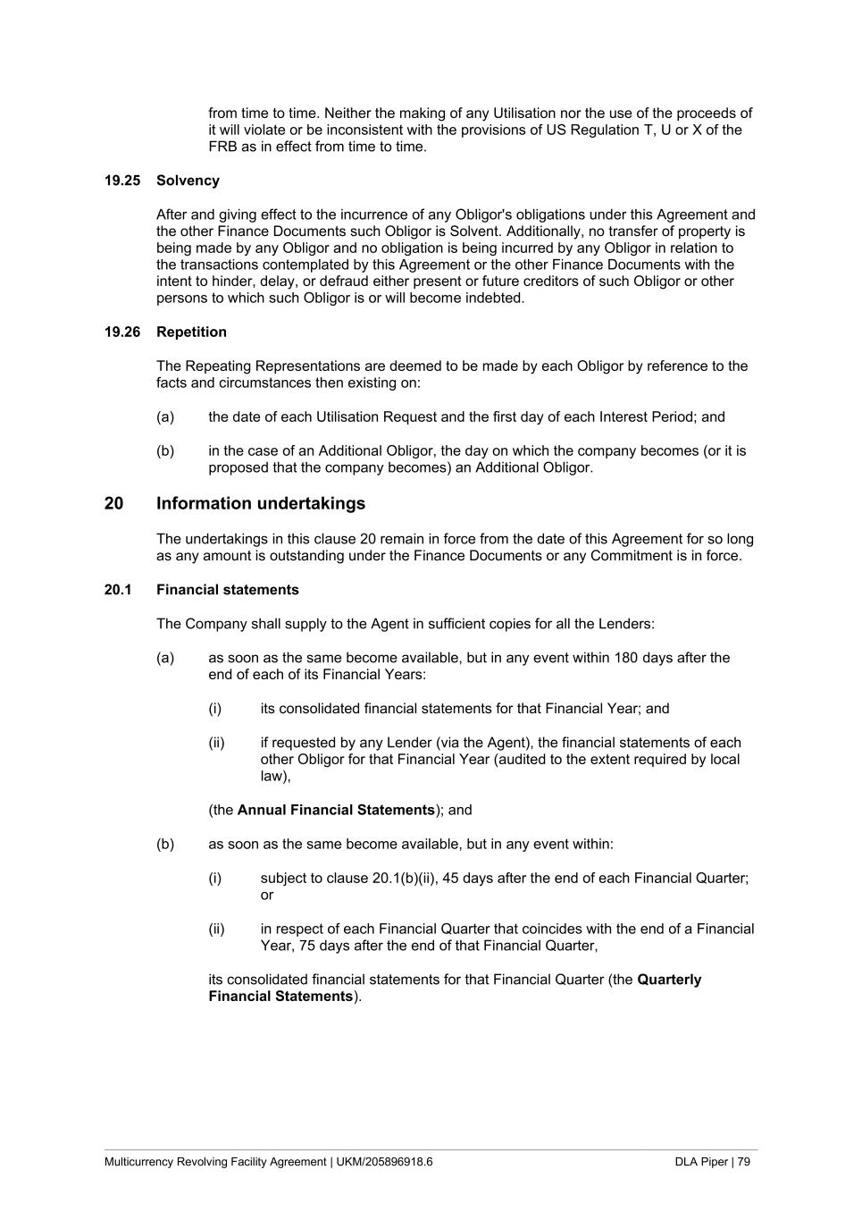 Multicurrency Revolving Facility Agreement | UKM/205896918.6 DLA Piper | 79 from time to time. Neither the making of any Utilisation nor the use of the proceeds of it will violate or be inconsistent with the provisions of US Regulation T, U or X of the FRB as in effect from time to time. 19.25 Solvency After and giving effect to the incurrence of any Obligor's obligations under this Agreement and the other Finance Documents such Obligor is Solvent. Additionally, no transfer of property is being made by any Obligor and no obligation is being incurred by any Obligor in relation to the transactions contemplated by this Agreement or the other Finance Documents with the intent to hinder, delay, or defraud either present or future creditors of such Obligor or other persons to which such Obligor is or will become indebted. 19.26 Repetition The Repeating Representations are deemed to be made by each Obligor by reference to the facts and circumstances then existing on: (a) the date of each Utilisation Request and the first day of each Interest Period; and (b) in the case of an Additional Obligor, the day on which the company becomes (or it is proposed that the company becomes) an Additional Obligor. 20 Information undertakings The undertakings in this clause 20 remain in force from the date of this Agreement for so long as any amount is outstanding under the Finance Documents or any Commitment is in force. 20.1 Financial statements The Company shall supply to the Agent in sufficient copies for all the Lenders: (a) as soon as the same become available, but in any event within 180 days after the end of each of its Financial Years: (i) its consolidated financial statements for that Financial Year; and (ii) if requested by any Lender (via the Agent), the financial statements of each other Obligor for that Financial Year (audited to the extent required by local law), (the Annual Financial Statements); and (b) as soon as the same become available, but in any event within: (i) subject to clause 20.1(b)(ii), 45 days after the end of each Financial Quarter; or (ii) in respect of each Financial Quarter that coincides with the end of a Financial Year, 75 days after the end of that Financial Quarter, its consolidated financial statements for that Financial Quarter (the Quarterly Financial Statements).