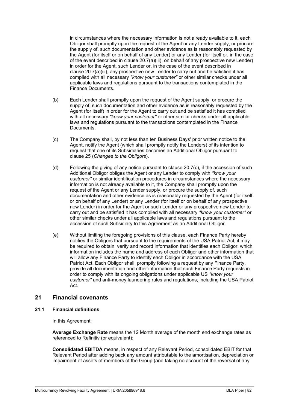 Multicurrency Revolving Facility Agreement | UKM/205896918.6 DLA Piper | 82 in circumstances where the necessary information is not already available to it, each Obligor shall promptly upon the request of the Agent or any Lender supply, or procure the supply of, such documentation and other evidence as is reasonably requested by the Agent (for itself or on behalf of any Lender) or any Lender (for itself or, in the case of the event described in clause 20.7(a)(iii), on behalf of any prospective new Lender) in order for the Agent, such Lender or, in the case of the event described in clause 20.7(a)(iii), any prospective new Lender to carry out and be satisfied it has complied with all necessary "know your customer" or other similar checks under all applicable laws and regulations pursuant to the transactions contemplated in the Finance Documents. (b) Each Lender shall promptly upon the request of the Agent supply, or procure the supply of, such documentation and other evidence as is reasonably requested by the Agent (for itself) in order for the Agent to carry out and be satisfied it has complied with all necessary "know your customer" or other similar checks under all applicable laws and regulations pursuant to the transactions contemplated in the Finance Documents. (c) The Company shall, by not less than ten Business Days' prior written notice to the Agent, notify the Agent (which shall promptly notify the Lenders) of its intention to request that one of its Subsidiaries becomes an Additional Obligor pursuant to clause 25 (Changes to the Obligors). (d) Following the giving of any notice pursuant to clause 20.7(c), if the accession of such Additional Obligor obliges the Agent or any Lender to comply with "know your customer" or similar identification procedures in circumstances where the necessary information is not already available to it, the Company shall promptly upon the request of the Agent or any Lender supply, or procure the supply of, such documentation and other evidence as is reasonably requested by the Agent (for itself or on behalf of any Lender) or any Lender (for itself or on behalf of any prospective new Lender) in order for the Agent or such Lender or any prospective new Lender to carry out and be satisfied it has complied with all necessary "know your customer" or other similar checks under all applicable laws and regulations pursuant to the accession of such Subsidiary to this Agreement as an Additional Obligor. (e) Without limiting the foregoing provisions of this clause, each Finance Party hereby notifies the Obligors that pursuant to the requirements of the USA Patriot Act, it may be required to obtain, verify and record information that identifies each Obligor, which information includes the name and address of each Obligor and other information that will allow any Finance Party to identify each Obligor in accordance with the USA Patriot Act. Each Obligor shall, promptly following a request by any Finance Party, provide all documentation and other information that such Finance Party requests in order to comply with its ongoing obligations under applicable US "know your customer" and anti-money laundering rules and regulations, including the USA Patriot Act. 21 Financial covenants 21.1 Financial definitions In this Agreement: Average Exchange Rate means the 12 Month average of the month end exchange rates as referenced to Refinitiv (or equivalent); Consolidated EBITDA means, in respect of any Relevant Period, consolidated EBIT for that Relevant Period after adding back any amount attributable to the amortisation, depreciation or impairment of assets of members of the Group (and taking no account of the reversal of any