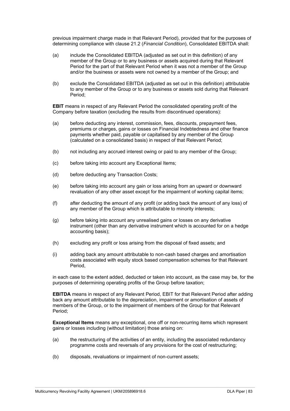 Multicurrency Revolving Facility Agreement | UKM/205896918.6 DLA Piper | 83 previous impairment charge made in that Relevant Period), provided that for the purposes of determining compliance with clause 21.2 (Financial Condition), Consolidated EBITDA shall: (a) include the Consolidated EBITDA (adjusted as set out in this definition) of any member of the Group or to any business or assets acquired during that Relevant Period for the part of that Relevant Period when it was not a member of the Group and/or the business or assets were not owned by a member of the Group; and (b) exclude the Consolidated EBITDA (adjusted as set out in this definition) attributable to any member of the Group or to any business or assets sold during that Relevant Period; EBIT means in respect of any Relevant Period the consolidated operating profit of the Company before taxation (excluding the results from discontinued operations): (a) before deducting any interest, commission, fees, discounts, prepayment fees, premiums or charges, gains or losses on Financial Indebtedness and other finance payments whether paid, payable or capitalised by any member of the Group (calculated on a consolidated basis) in respect of that Relevant Period; (b) not including any accrued interest owing or paid to any member of the Group; (c) before taking into account any Exceptional Items; (d) before deducting any Transaction Costs; (e) before taking into account any gain or loss arising from an upward or downward revaluation of any other asset except for the impairment of working capital items; (f) after deducting the amount of any profit (or adding back the amount of any loss) of any member of the Group which is attributable to minority interests; (g) before taking into account any unrealised gains or losses on any derivative instrument (other than any derivative instrument which is accounted for on a hedge accounting basis); (h) excluding any profit or loss arising from the disposal of fixed assets; and (i) adding back any amount attributable to non-cash based charges and amortisation costs associated with equity stock based compensation schemes for that Relevant Period, in each case to the extent added, deducted or taken into account, as the case may be, for the purposes of determining operating profits of the Group before taxation; EBITDA means in respect of any Relevant Period, EBIT for that Relevant Period after adding back any amount attributable to the depreciation, impairment or amortisation of assets of members of the Group, or to the impairment of members of the Group for that Relevant Period; Exceptional Items means any exceptional, one off or non-recurring items which represent gains or losses including (without limitation) those arising on: (a) the restructuring of the activities of an entity, including the associated redundancy programme costs and reversals of any provisions for the cost of restructuring; (b) disposals, revaluations or impairment of non-current assets;