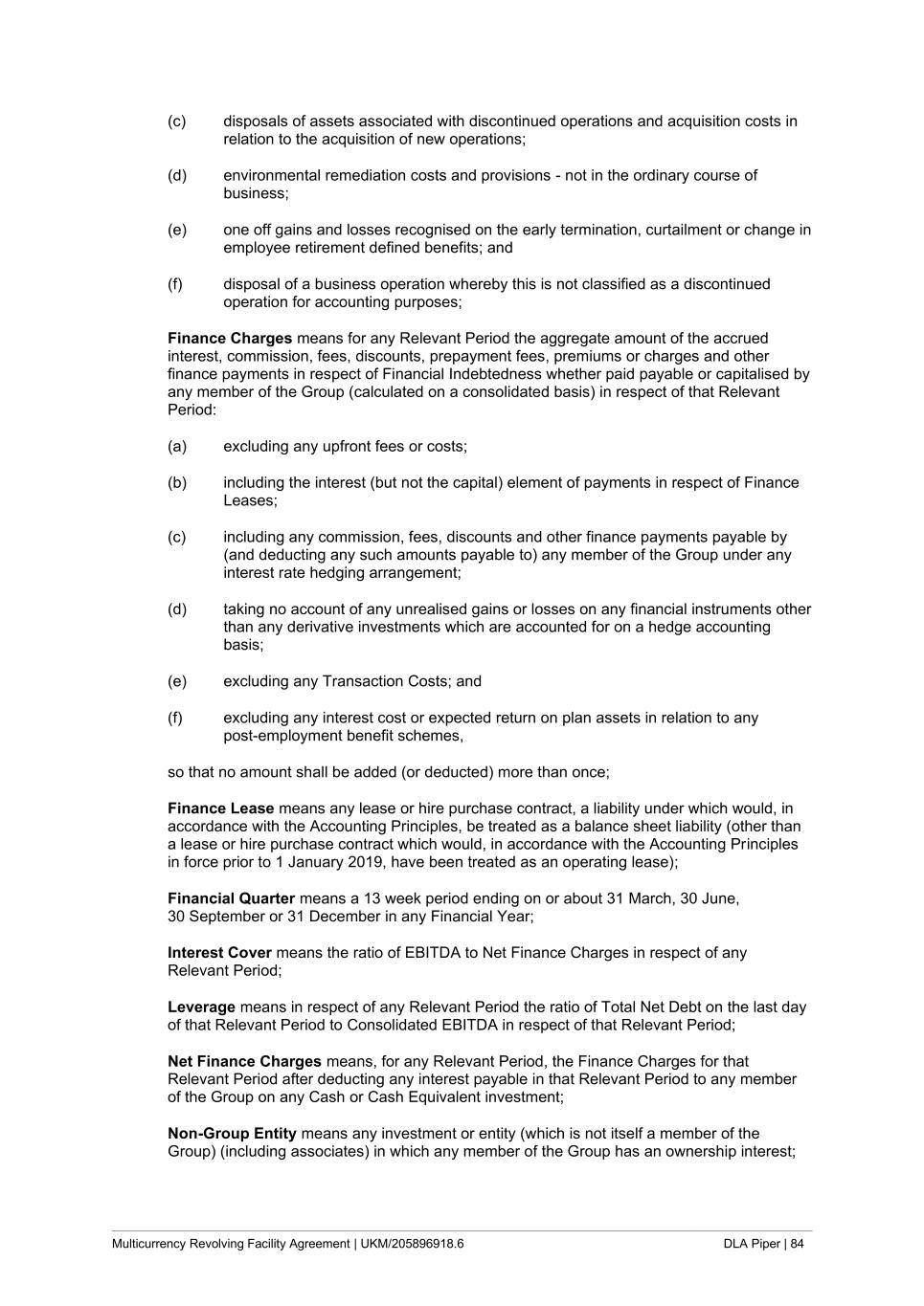 Multicurrency Revolving Facility Agreement | UKM/205896918.6 DLA Piper | 84 (c) disposals of assets associated with discontinued operations and acquisition costs in relation to the acquisition of new operations; (d) environmental remediation costs and provisions - not in the ordinary course of business; (e) one off gains and losses recognised on the early termination, curtailment or change in employee retirement defined benefits; and (f) disposal of a business operation whereby this is not classified as a discontinued operation for accounting purposes; Finance Charges means for any Relevant Period the aggregate amount of the accrued interest, commission, fees, discounts, prepayment fees, premiums or charges and other finance payments in respect of Financial Indebtedness whether paid payable or capitalised by any member of the Group (calculated on a consolidated basis) in respect of that Relevant Period: (a) excluding any upfront fees or costs; (b) including the interest (but not the capital) element of payments in respect of Finance Leases; (c) including any commission, fees, discounts and other finance payments payable by (and deducting any such amounts payable to) any member of the Group under any interest rate hedging arrangement; (d) taking no account of any unrealised gains or losses on any financial instruments other than any derivative investments which are accounted for on a hedge accounting basis; (e) excluding any Transaction Costs; and (f) excluding any interest cost or expected return on plan assets in relation to any post-employment benefit schemes, so that no amount shall be added (or deducted) more than once; Finance Lease means any lease or hire purchase contract, a liability under which would, in accordance with the Accounting Principles, be treated as a balance sheet liability (other than a lease or hire purchase contract which would, in accordance with the Accounting Principles in force prior to 1 January 2019, have been treated as an operating lease); Financial Quarter means a 13 week period ending on or about 31 March, 30 June, 30 September or 31 December in any Financial Year; Interest Cover means the ratio of EBITDA to Net Finance Charges in respect of any Relevant Period; Leverage means in respect of any Relevant Period the ratio of Total Net Debt on the last day of that Relevant Period to Consolidated EBITDA in respect of that Relevant Period; Net Finance Charges means, for any Relevant Period, the Finance Charges for that Relevant Period after deducting any interest payable in that Relevant Period to any member of the Group on any Cash or Cash Equivalent investment; Non-Group Entity means any investment or entity (which is not itself a member of the Group) (including associates) in which any member of the Group has an ownership interest;