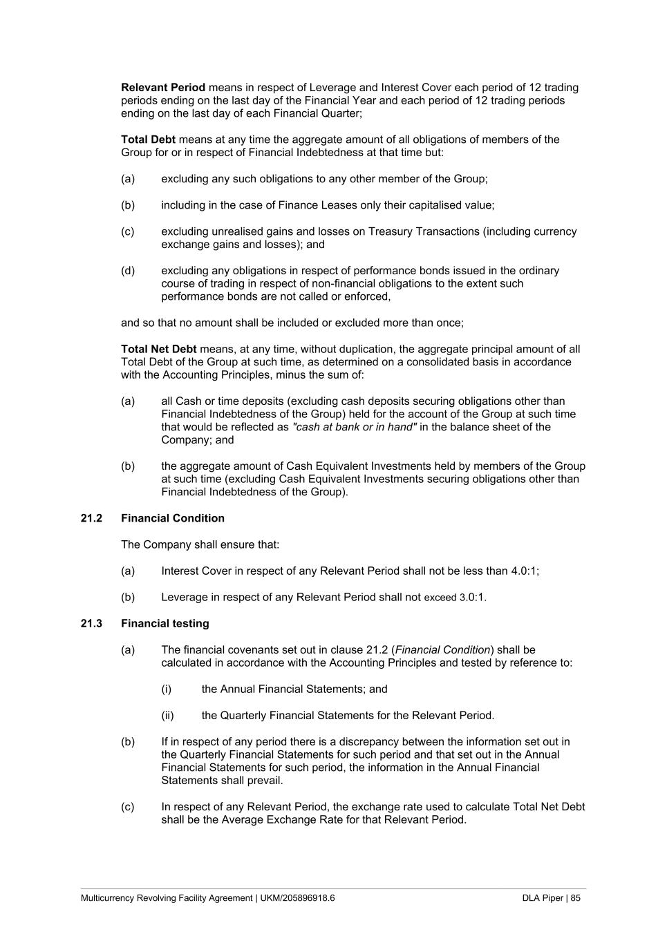 Multicurrency Revolving Facility Agreement | UKM/205896918.6 DLA Piper | 85 Relevant Period means in respect of Leverage and Interest Cover each period of 12 trading periods ending on the last day of the Financial Year and each period of 12 trading periods ending on the last day of each Financial Quarter; Total Debt means at any time the aggregate amount of all obligations of members of the Group for or in respect of Financial Indebtedness at that time but: (a) excluding any such obligations to any other member of the Group; (b) including in the case of Finance Leases only their capitalised value; (c) excluding unrealised gains and losses on Treasury Transactions (including currency exchange gains and losses); and (d) excluding any obligations in respect of performance bonds issued in the ordinary course of trading in respect of non-financial obligations to the extent such performance bonds are not called or enforced, and so that no amount shall be included or excluded more than once; Total Net Debt means, at any time, without duplication, the aggregate principal amount of all Total Debt of the Group at such time, as determined on a consolidated basis in accordance with the Accounting Principles, minus the sum of: (a) all Cash or time deposits (excluding cash deposits securing obligations other than Financial Indebtedness of the Group) held for the account of the Group at such time that would be reflected as "cash at bank or in hand" in the balance sheet of the Company; and (b) the aggregate amount of Cash Equivalent Investments held by members of the Group at such time (excluding Cash Equivalent Investments securing obligations other than Financial Indebtedness of the Group). 21.2 Financial Condition The Company shall ensure that: (a) Interest Cover in respect of any Relevant Period shall not be less than 4.0:1; (b) Leverage in respect of any Relevant Period shall not exceed 3.0:1. 21.3 Financial testing (a) The financial covenants set out in clause 21.2 (Financial Condition) shall be calculated in accordance with the Accounting Principles and tested by reference to: (i) the Annual Financial Statements; and (ii) the Quarterly Financial Statements for the Relevant Period. (b) If in respect of any period there is a discrepancy between the information set out in the Quarterly Financial Statements for such period and that set out in the Annual Financial Statements for such period, the information in the Annual Financial Statements shall prevail. (c) In respect of any Relevant Period, the exchange rate used to calculate Total Net Debt shall be the Average Exchange Rate for that Relevant Period.