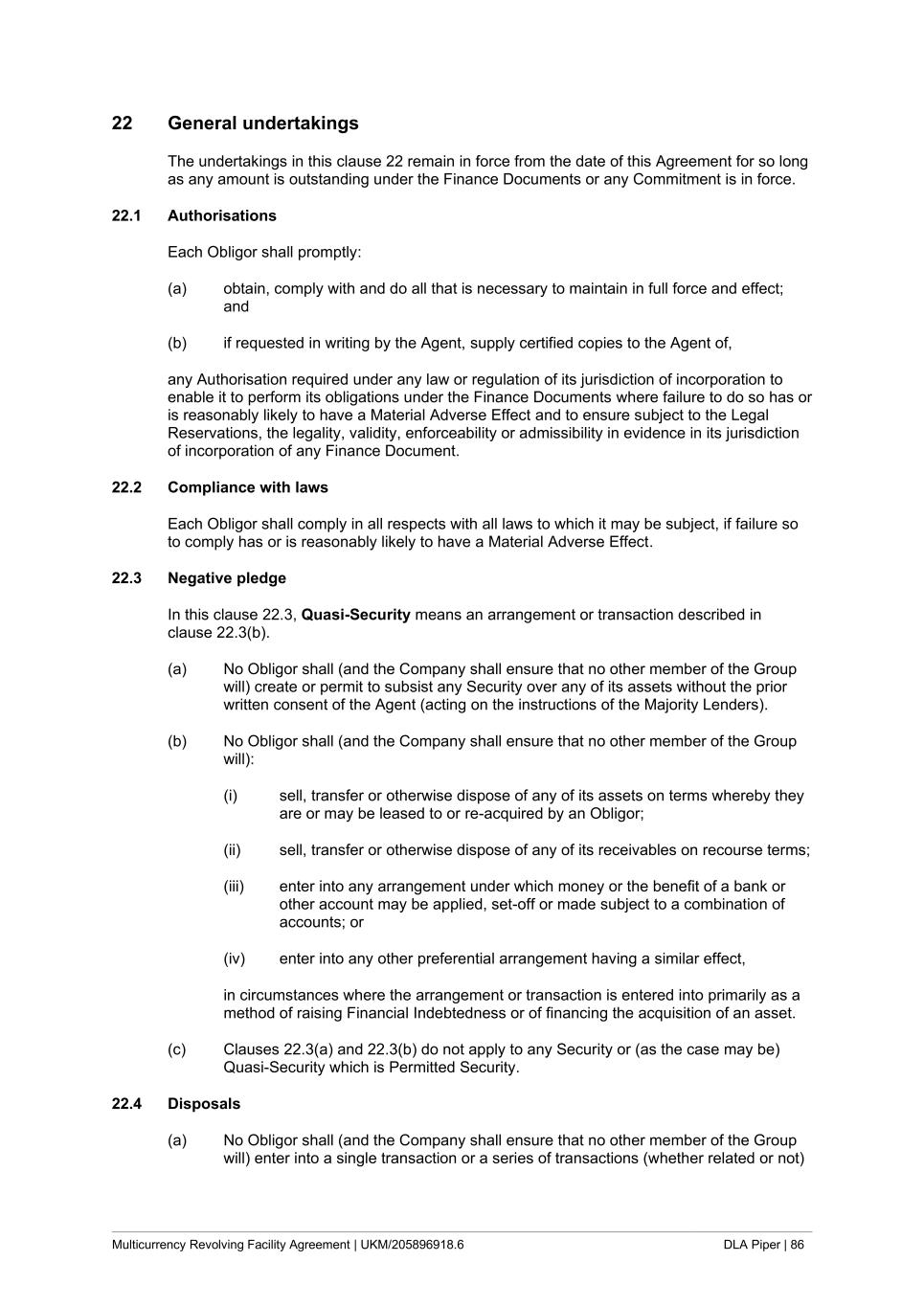 Multicurrency Revolving Facility Agreement | UKM/205896918.6 DLA Piper | 86 22 General undertakings The undertakings in this clause 22 remain in force from the date of this Agreement for so long as any amount is outstanding under the Finance Documents or any Commitment is in force. 22.1 Authorisations Each Obligor shall promptly: (a) obtain, comply with and do all that is necessary to maintain in full force and effect; and (b) if requested in writing by the Agent, supply certified copies to the Agent of, any Authorisation required under any law or regulation of its jurisdiction of incorporation to enable it to perform its obligations under the Finance Documents where failure to do so has or is reasonably likely to have a Material Adverse Effect and to ensure subject to the Legal Reservations, the legality, validity, enforceability or admissibility in evidence in its jurisdiction of incorporation of any Finance Document. 22.2 Compliance with laws Each Obligor shall comply in all respects with all laws to which it may be subject, if failure so to comply has or is reasonably likely to have a Material Adverse Effect. 22.3 Negative pledge In this clause 22.3, Quasi-Security means an arrangement or transaction described in clause 22.3(b). (a) No Obligor shall (and the Company shall ensure that no other member of the Group will) create or permit to subsist any Security over any of its assets without the prior written consent of the Agent (acting on the instructions of the Majority Lenders). (b) No Obligor shall (and the Company shall ensure that no other member of the Group will): (i) sell, transfer or otherwise dispose of any of its assets on terms whereby they are or may be leased to or re-acquired by an Obligor; (ii) sell, transfer or otherwise dispose of any of its receivables on recourse terms; (iii) enter into any arrangement under which money or the benefit of a bank or other account may be applied, set-off or made subject to a combination of accounts; or (iv) enter into any other preferential arrangement having a similar effect, in circumstances where the arrangement or transaction is entered into primarily as a method of raising Financial Indebtedness or of financing the acquisition of an asset. (c) Clauses 22.3(a) and 22.3(b) do not apply to any Security or (as the case may be) Quasi-Security which is Permitted Security. 22.4 Disposals (a) No Obligor shall (and the Company shall ensure that no other member of the Group will) enter into a single transaction or a series of transactions (whether related or not)