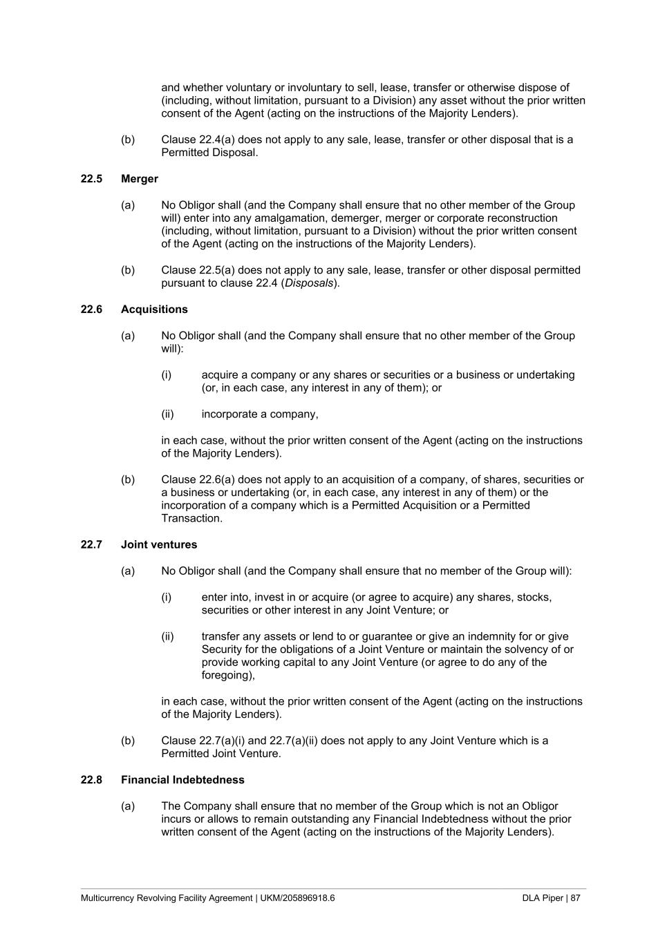 Multicurrency Revolving Facility Agreement | UKM/205896918.6 DLA Piper | 87 and whether voluntary or involuntary to sell, lease, transfer or otherwise dispose of (including, without limitation, pursuant to a Division) any asset without the prior written consent of the Agent (acting on the instructions of the Majority Lenders). (b) Clause 22.4(a) does not apply to any sale, lease, transfer or other disposal that is a Permitted Disposal. 22.5 Merger (a) No Obligor shall (and the Company shall ensure that no other member of the Group will) enter into any amalgamation, demerger, merger or corporate reconstruction (including, without limitation, pursuant to a Division) without the prior written consent of the Agent (acting on the instructions of the Majority Lenders). (b) Clause 22.5(a) does not apply to any sale, lease, transfer or other disposal permitted pursuant to clause 22.4 (Disposals). 22.6 Acquisitions (a) No Obligor shall (and the Company shall ensure that no other member of the Group will): (i) acquire a company or any shares or securities or a business or undertaking (or, in each case, any interest in any of them); or (ii) incorporate a company, in each case, without the prior written consent of the Agent (acting on the instructions of the Majority Lenders). (b) Clause 22.6(a) does not apply to an acquisition of a company, of shares, securities or a business or undertaking (or, in each case, any interest in any of them) or the incorporation of a company which is a Permitted Acquisition or a Permitted Transaction. 22.7 Joint ventures (a) No Obligor shall (and the Company shall ensure that no member of the Group will): (i) enter into, invest in or acquire (or agree to acquire) any shares, stocks, securities or other interest in any Joint Venture; or (ii) transfer any assets or lend to or guarantee or give an indemnity for or give Security for the obligations of a Joint Venture or maintain the solvency of or provide working capital to any Joint Venture (or agree to do any of the foregoing), in each case, without the prior written consent of the Agent (acting on the instructions of the Majority Lenders). (b) Clause 22.7(a)(i) and 22.7(a)(ii) does not apply to any Joint Venture which is a Permitted Joint Venture. 22.8 Financial Indebtedness (a) The Company shall ensure that no member of the Group which is not an Obligor incurs or allows to remain outstanding any Financial Indebtedness without the prior written consent of the Agent (acting on the instructions of the Majority Lenders).