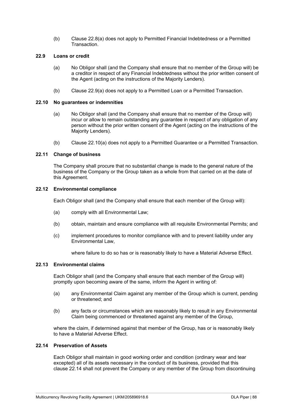 Multicurrency Revolving Facility Agreement | UKM/205896918.6 DLA Piper | 88 (b) Clause 22.8(a) does not apply to Permitted Financial Indebtedness or a Permitted Transaction. 22.9 Loans or credit (a) No Obligor shall (and the Company shall ensure that no member of the Group will) be a creditor in respect of any Financial Indebtedness without the prior written consent of the Agent (acting on the instructions of the Majority Lenders). (b) Clause 22.9(a) does not apply to a Permitted Loan or a Permitted Transaction. 22.10 No guarantees or indemnities (a) No Obligor shall (and the Company shall ensure that no member of the Group will) incur or allow to remain outstanding any guarantee in respect of any obligation of any person without the prior written consent of the Agent (acting on the instructions of the Majority Lenders). (b) Clause 22.10(a) does not apply to a Permitted Guarantee or a Permitted Transaction. 22.11 Change of business The Company shall procure that no substantial change is made to the general nature of the business of the Company or the Group taken as a whole from that carried on at the date of this Agreement. 22.12 Environmental compliance Each Obligor shall (and the Company shall ensure that each member of the Group will): (a) comply with all Environmental Law; (b) obtain, maintain and ensure compliance with all requisite Environmental Permits; and (c) implement procedures to monitor compliance with and to prevent liability under any Environmental Law, where failure to do so has or is reasonably likely to have a Material Adverse Effect. 22.13 Environmental claims Each Obligor shall (and the Company shall ensure that each member of the Group will) promptly upon becoming aware of the same, inform the Agent in writing of: (a) any Environmental Claim against any member of the Group which is current, pending or threatened; and (b) any facts or circumstances which are reasonably likely to result in any Environmental Claim being commenced or threatened against any member of the Group, where the claim, if determined against that member of the Group, has or is reasonably likely to have a Material Adverse Effect. 22.14 Preservation of Assets Each Obligor shall maintain in good working order and condition (ordinary wear and tear excepted) all of its assets necessary in the conduct of its business, provided that this clause 22.14 shall not prevent the Company or any member of the Group from discontinuing