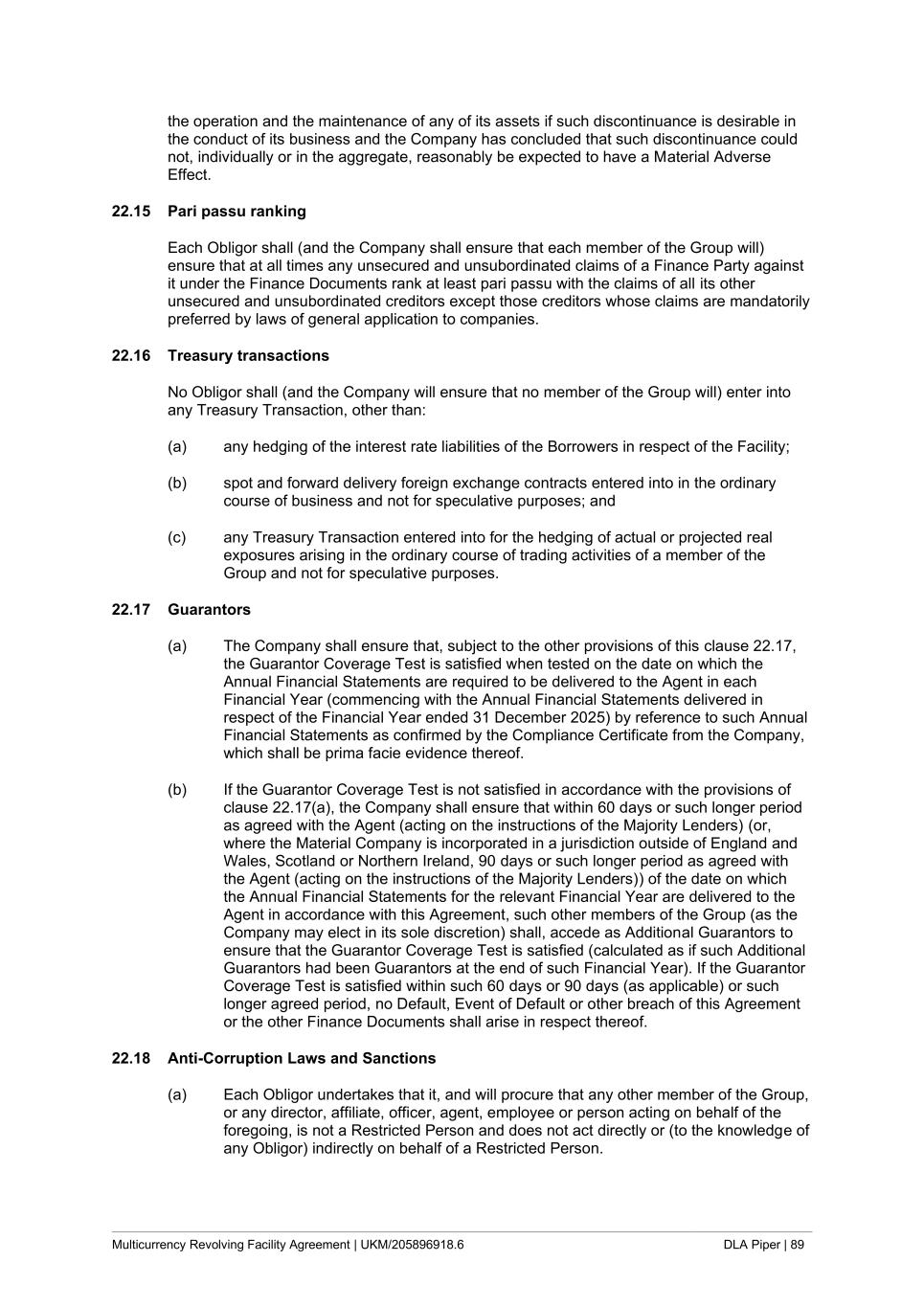 Multicurrency Revolving Facility Agreement | UKM/205896918.6 DLA Piper | 89 the operation and the maintenance of any of its assets if such discontinuance is desirable in the conduct of its business and the Company has concluded that such discontinuance could not, individually or in the aggregate, reasonably be expected to have a Material Adverse Effect. 22.15 Pari passu ranking Each Obligor shall (and the Company shall ensure that each member of the Group will) ensure that at all times any unsecured and unsubordinated claims of a Finance Party against it under the Finance Documents rank at least pari passu with the claims of all its other unsecured and unsubordinated creditors except those creditors whose claims are mandatorily preferred by laws of general application to companies. 22.16 Treasury transactions No Obligor shall (and the Company will ensure that no member of the Group will) enter into any Treasury Transaction, other than: (a) any hedging of the interest rate liabilities of the Borrowers in respect of the Facility; (b) spot and forward delivery foreign exchange contracts entered into in the ordinary course of business and not for speculative purposes; and (c) any Treasury Transaction entered into for the hedging of actual or projected real exposures arising in the ordinary course of trading activities of a member of the Group and not for speculative purposes. 22.17 Guarantors (a) The Company shall ensure that, subject to the other provisions of this clause 22.17, the Guarantor Coverage Test is satisfied when tested on the date on which the Annual Financial Statements are required to be delivered to the Agent in each Financial Year (commencing with the Annual Financial Statements delivered in respect of the Financial Year ended 31 December 2025) by reference to such Annual Financial Statements as confirmed by the Compliance Certificate from the Company, which shall be prima facie evidence thereof. (b) If the Guarantor Coverage Test is not satisfied in accordance with the provisions of clause 22.17(a), the Company shall ensure that within 60 days or such longer period as agreed with the Agent (acting on the instructions of the Majority Lenders) (or, where the Material Company is incorporated in a jurisdiction outside of England and Wales, Scotland or Northern Ireland, 90 days or such longer period as agreed with the Agent (acting on the instructions of the Majority Lenders)) of the date on which the Annual Financial Statements for the relevant Financial Year are delivered to the Agent in accordance with this Agreement, such other members of the Group (as the Company may elect in its sole discretion) shall, accede as Additional Guarantors to ensure that the Guarantor Coverage Test is satisfied (calculated as if such Additional Guarantors had been Guarantors at the end of such Financial Year). If the Guarantor Coverage Test is satisfied within such 60 days or 90 days (as applicable) or such longer agreed period, no Default, Event of Default or other breach of this Agreement or the other Finance Documents shall arise in respect thereof. 22.18 Anti-Corruption Laws and Sanctions (a) Each Obligor undertakes that it, and will procure that any other member of the Group, or any director, affiliate, officer, agent, employee or person acting on behalf of the foregoing, is not a Restricted Person and does not act directly or (to the knowledge of any Obligor) indirectly on behalf of a Restricted Person.