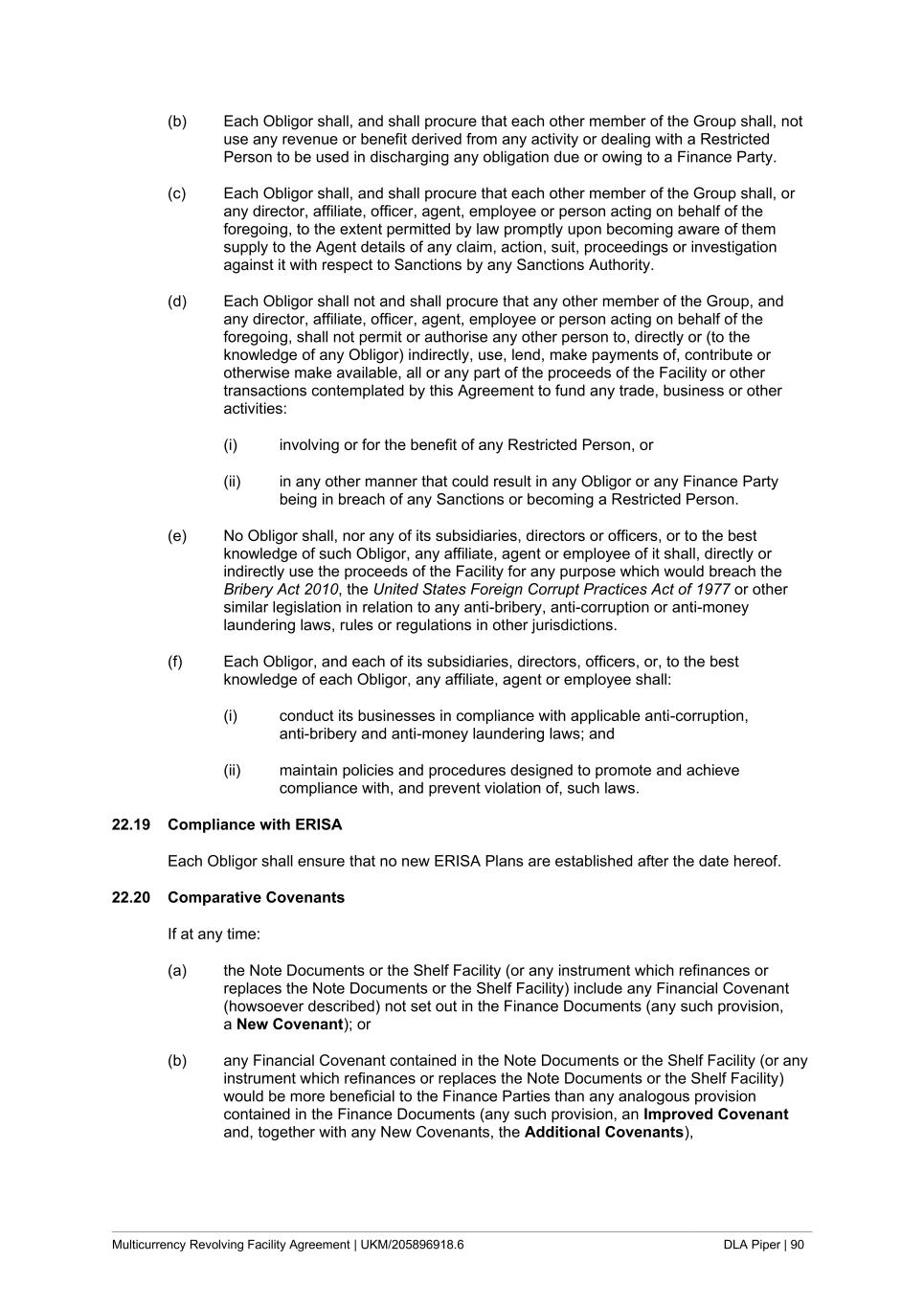 Multicurrency Revolving Facility Agreement | UKM/205896918.6 DLA Piper | 90 (b) Each Obligor shall, and shall procure that each other member of the Group shall, not use any revenue or benefit derived from any activity or dealing with a Restricted Person to be used in discharging any obligation due or owing to a Finance Party. (c) Each Obligor shall, and shall procure that each other member of the Group shall, or any director, affiliate, officer, agent, employee or person acting on behalf of the foregoing, to the extent permitted by law promptly upon becoming aware of them supply to the Agent details of any claim, action, suit, proceedings or investigation against it with respect to Sanctions by any Sanctions Authority. (d) Each Obligor shall not and shall procure that any other member of the Group, and any director, affiliate, officer, agent, employee or person acting on behalf of the foregoing, shall not permit or authorise any other person to, directly or (to the knowledge of any Obligor) indirectly, use, lend, make payments of, contribute or otherwise make available, all or any part of the proceeds of the Facility or other transactions contemplated by this Agreement to fund any trade, business or other activities: (i) involving or for the benefit of any Restricted Person, or (ii) in any other manner that could result in any Obligor or any Finance Party being in breach of any Sanctions or becoming a Restricted Person. (e) No Obligor shall, nor any of its subsidiaries, directors or officers, or to the best knowledge of such Obligor, any affiliate, agent or employee of it shall, directly or indirectly use the proceeds of the Facility for any purpose which would breach the Bribery Act 2010, the United States Foreign Corrupt Practices Act of 1977 or other similar legislation in relation to any anti-bribery, anti-corruption or anti-money laundering laws, rules or regulations in other jurisdictions. (f) Each Obligor, and each of its subsidiaries, directors, officers, or, to the best knowledge of each Obligor, any affiliate, agent or employee shall: (i) conduct its businesses in compliance with applicable anti-corruption, anti-bribery and anti-money laundering laws; and (ii) maintain policies and procedures designed to promote and achieve compliance with, and prevent violation of, such laws. 22.19 Compliance with ERISA Each Obligor shall ensure that no new ERISA Plans are established after the date hereof. 22.20 Comparative Covenants If at any time: (a) the Note Documents or the Shelf Facility (or any instrument which refinances or replaces the Note Documents or the Shelf Facility) include any Financial Covenant (howsoever described) not set out in the Finance Documents (any such provision, a New Covenant); or (b) any Financial Covenant contained in the Note Documents or the Shelf Facility (or any instrument which refinances or replaces the Note Documents or the Shelf Facility) would be more beneficial to the Finance Parties than any analogous provision contained in the Finance Documents (any such provision, an Improved Covenant and, together with any New Covenants, the Additional Covenants),