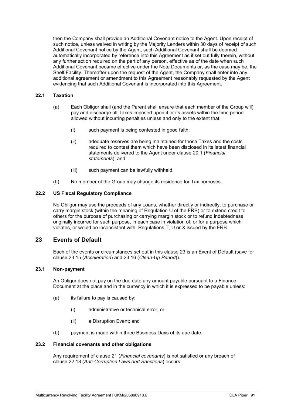 Multicurrency Revolving Facility Agreement | UKM/205896918.6 DLA Piper | 91 then the Company shall provide an Additional Covenant notice to the Agent. Upon receipt of such notice, unless waived in writing by the Majority Lenders within 30 days of receipt of such Additional Covenant notice by the Agent, such Additional Covenant shall be deemed automatically incorporated by reference into this Agreement as if set out fully therein, without any further action required on the part of any person, effective as of the date when such Additional Covenant became effective under the Note Documents or, as the case may be, the Shelf Facility. Thereafter upon the request of the Agent, the Company shall enter into any additional agreement or amendment to this Agreement reasonably requested by the Agent evidencing that such Additional Covenant is incorporated into this Agreement. 22.1 Taxation (a) Each Obligor shall (and the Parent shall ensure that each member of the Group will) pay and discharge all Taxes imposed upon it or its assets within the time period allowed without incurring penalties unless and only to the extent that: (i) such payment is being contested in good faith; (ii) adequate reserves are being maintained for those Taxes and the costs required to contest them which have been disclosed in its latest financial statements delivered to the Agent under clause 20.1 (Financial statements); and (iii) such payment can be lawfully withheld. (b) No member of the Group may change its residence for Tax purposes. 22.2 US Fiscal Regulatory Compliance No Obligor may use the proceeds of any Loans, whether directly or indirectly, to purchase or carry margin stock (within the meaning of Regulation U of the FRB) or to extend credit to others for the purpose of purchasing or carrying margin stock or to refund indebtedness originally incurred for such purpose, in each case in violation of, or for a purpose which violates, or would be inconsistent with, Regulations T, U or X issued by the FRB. 23 Events of Default Each of the events or circumstances set out in this clause 23 is an Event of Default (save for clause 23.15 (Acceleration) and 23.16 (Clean-Up Period)). 23.1 Non-payment An Obligor does not pay on the due date any amount payable pursuant to a Finance Document at the place and in the currency in which it is expressed to be payable unless: (a) its failure to pay is caused by: (i) administrative or technical error; or (ii) a Disruption Event; and (b) payment is made within three Business Days of its due date. 23.2 Financial covenants and other obligations Any requirement of clause 21 (Financial covenants) is not satisfied or any breach of clause 22.18 (Anti-Corruption Laws and Sanctions) occurs.