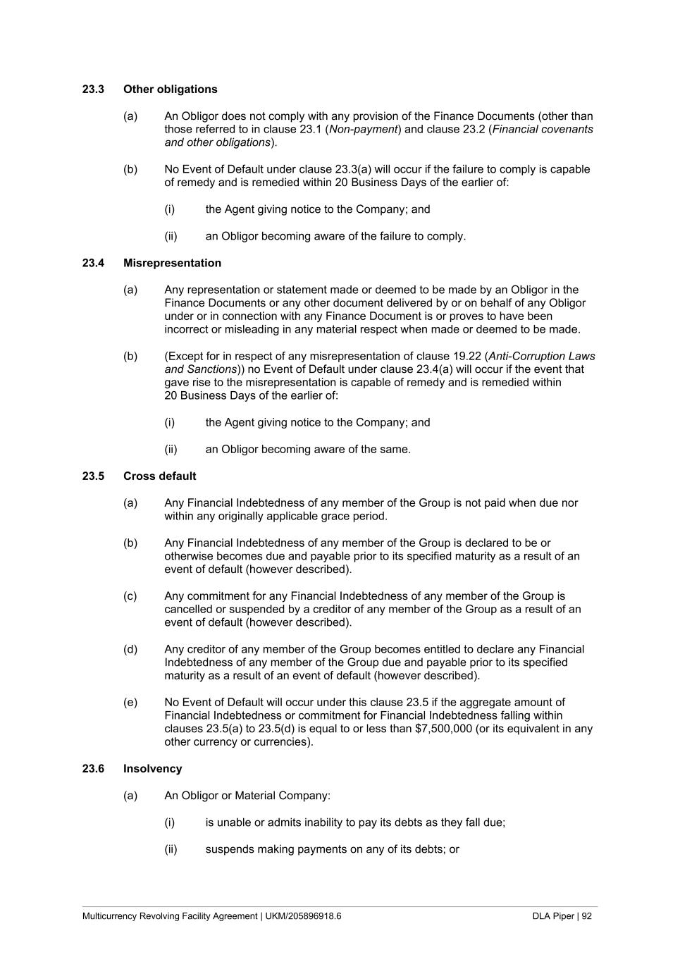 Multicurrency Revolving Facility Agreement | UKM/205896918.6 DLA Piper | 92 23.3 Other obligations (a) An Obligor does not comply with any provision of the Finance Documents (other than those referred to in clause 23.1 (Non-payment) and clause 23.2 (Financial covenants and other obligations). (b) No Event of Default under clause 23.3(a) will occur if the failure to comply is capable of remedy and is remedied within 20 Business Days of the earlier of: (i) the Agent giving notice to the Company; and (ii) an Obligor becoming aware of the failure to comply. 23.4 Misrepresentation (a) Any representation or statement made or deemed to be made by an Obligor in the Finance Documents or any other document delivered by or on behalf of any Obligor under or in connection with any Finance Document is or proves to have been incorrect or misleading in any material respect when made or deemed to be made. (b) (Except for in respect of any misrepresentation of clause 19.22 (Anti-Corruption Laws and Sanctions)) no Event of Default under clause 23.4(a) will occur if the event that gave rise to the misrepresentation is capable of remedy and is remedied within 20 Business Days of the earlier of: (i) the Agent giving notice to the Company; and (ii) an Obligor becoming aware of the same. 23.5 Cross default (a) Any Financial Indebtedness of any member of the Group is not paid when due nor within any originally applicable grace period. (b) Any Financial Indebtedness of any member of the Group is declared to be or otherwise becomes due and payable prior to its specified maturity as a result of an event of default (however described). (c) Any commitment for any Financial Indebtedness of any member of the Group is cancelled or suspended by a creditor of any member of the Group as a result of an event of default (however described). (d) Any creditor of any member of the Group becomes entitled to declare any Financial Indebtedness of any member of the Group due and payable prior to its specified maturity as a result of an event of default (however described). (e) No Event of Default will occur under this clause 23.5 if the aggregate amount of Financial Indebtedness or commitment for Financial Indebtedness falling within clauses 23.5(a) to 23.5(d) is equal to or less than $7,500,000 (or its equivalent in any other currency or currencies). 23.6 Insolvency (a) An Obligor or Material Company: (i) is unable or admits inability to pay its debts as they fall due; (ii) suspends making payments on any of its debts; or