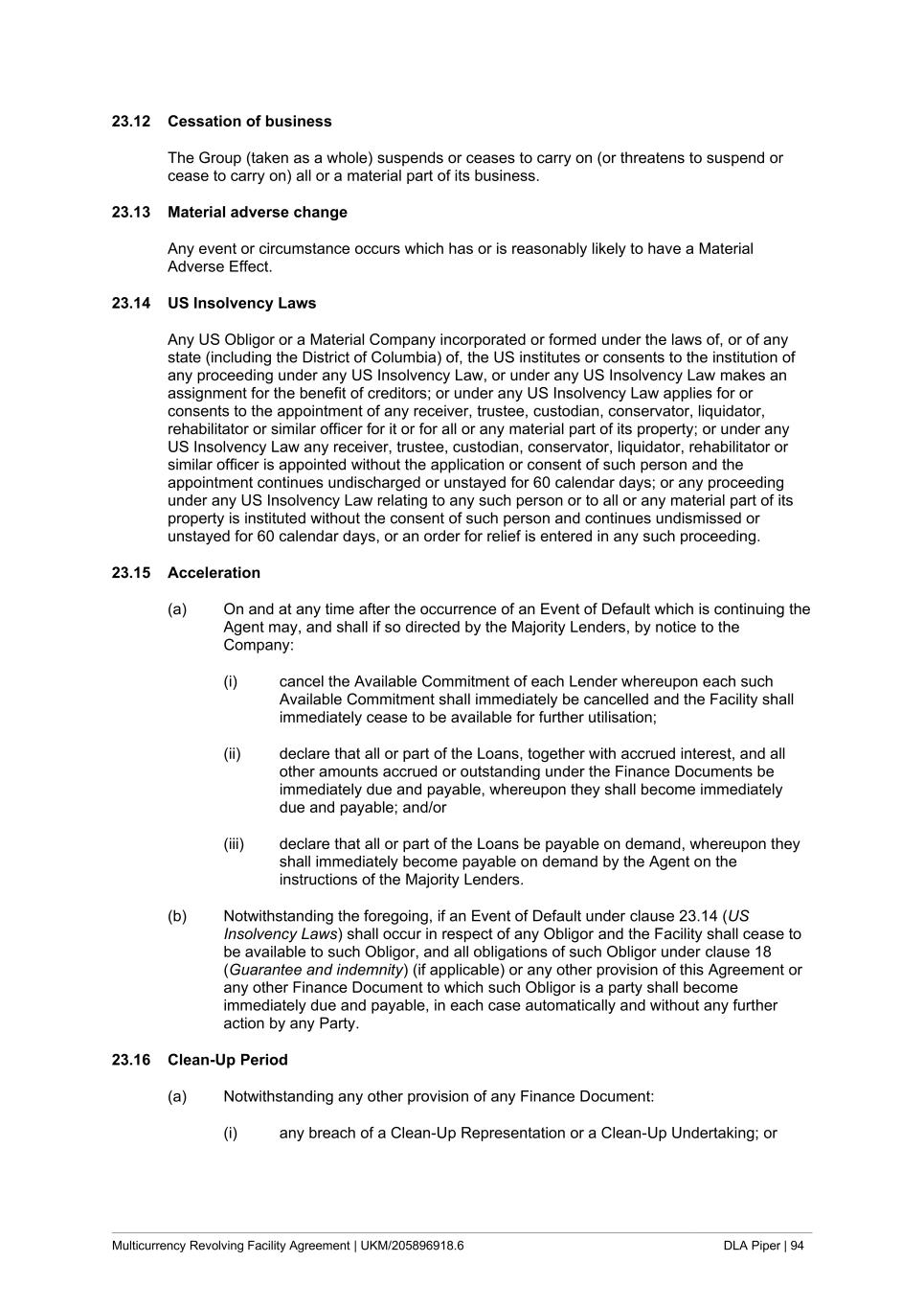 Multicurrency Revolving Facility Agreement | UKM/205896918.6 DLA Piper | 94 23.12 Cessation of business The Group (taken as a whole) suspends or ceases to carry on (or threatens to suspend or cease to carry on) all or a material part of its business. 23.13 Material adverse change Any event or circumstance occurs which has or is reasonably likely to have a Material Adverse Effect. 23.14 US Insolvency Laws Any US Obligor or a Material Company incorporated or formed under the laws of, or of any state (including the District of Columbia) of, the US institutes or consents to the institution of any proceeding under any US Insolvency Law, or under any US Insolvency Law makes an assignment for the benefit of creditors; or under any US Insolvency Law applies for or consents to the appointment of any receiver, trustee, custodian, conservator, liquidator, rehabilitator or similar officer for it or for all or any material part of its property; or under any US Insolvency Law any receiver, trustee, custodian, conservator, liquidator, rehabilitator or similar officer is appointed without the application or consent of such person and the appointment continues undischarged or unstayed for 60 calendar days; or any proceeding under any US Insolvency Law relating to any such person or to all or any material part of its property is instituted without the consent of such person and continues undismissed or unstayed for 60 calendar days, or an order for relief is entered in any such proceeding. 23.15 Acceleration (a) On and at any time after the occurrence of an Event of Default which is continuing the Agent may, and shall if so directed by the Majority Lenders, by notice to the Company: (i) cancel the Available Commitment of each Lender whereupon each such Available Commitment shall immediately be cancelled and the Facility shall immediately cease to be available for further utilisation; (ii) declare that all or part of the Loans, together with accrued interest, and all other amounts accrued or outstanding under the Finance Documents be immediately due and payable, whereupon they shall become immediately due and payable; and/or (iii) declare that all or part of the Loans be payable on demand, whereupon they shall immediately become payable on demand by the Agent on the instructions of the Majority Lenders. (b) Notwithstanding the foregoing, if an Event of Default under clause 23.14 (US Insolvency Laws) shall occur in respect of any Obligor and the Facility shall cease to be available to such Obligor, and all obligations of such Obligor under clause 18 (Guarantee and indemnity) (if applicable) or any other provision of this Agreement or any other Finance Document to which such Obligor is a party shall become immediately due and payable, in each case automatically and without any further action by any Party. 23.16 Clean-Up Period (a) Notwithstanding any other provision of any Finance Document: (i) any breach of a Clean-Up Representation or a Clean-Up Undertaking; or